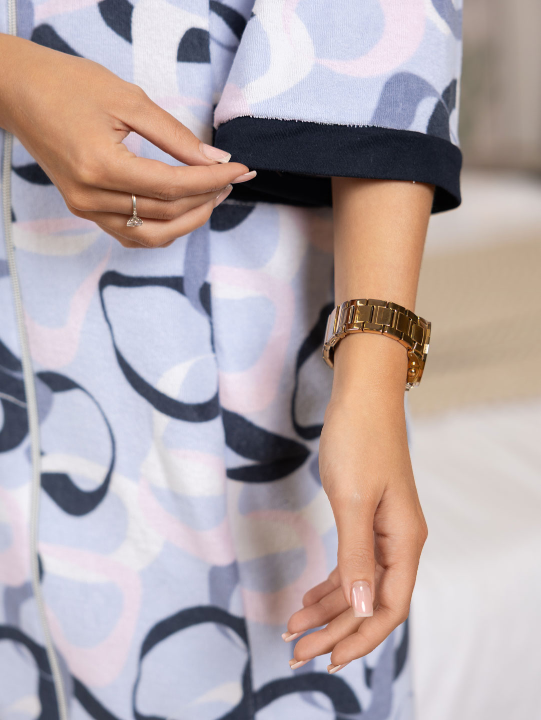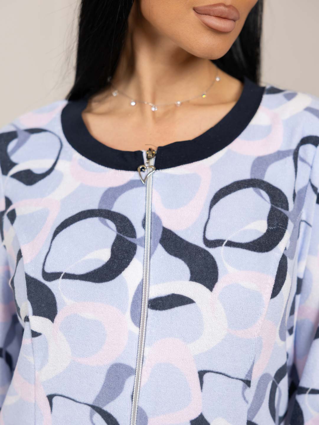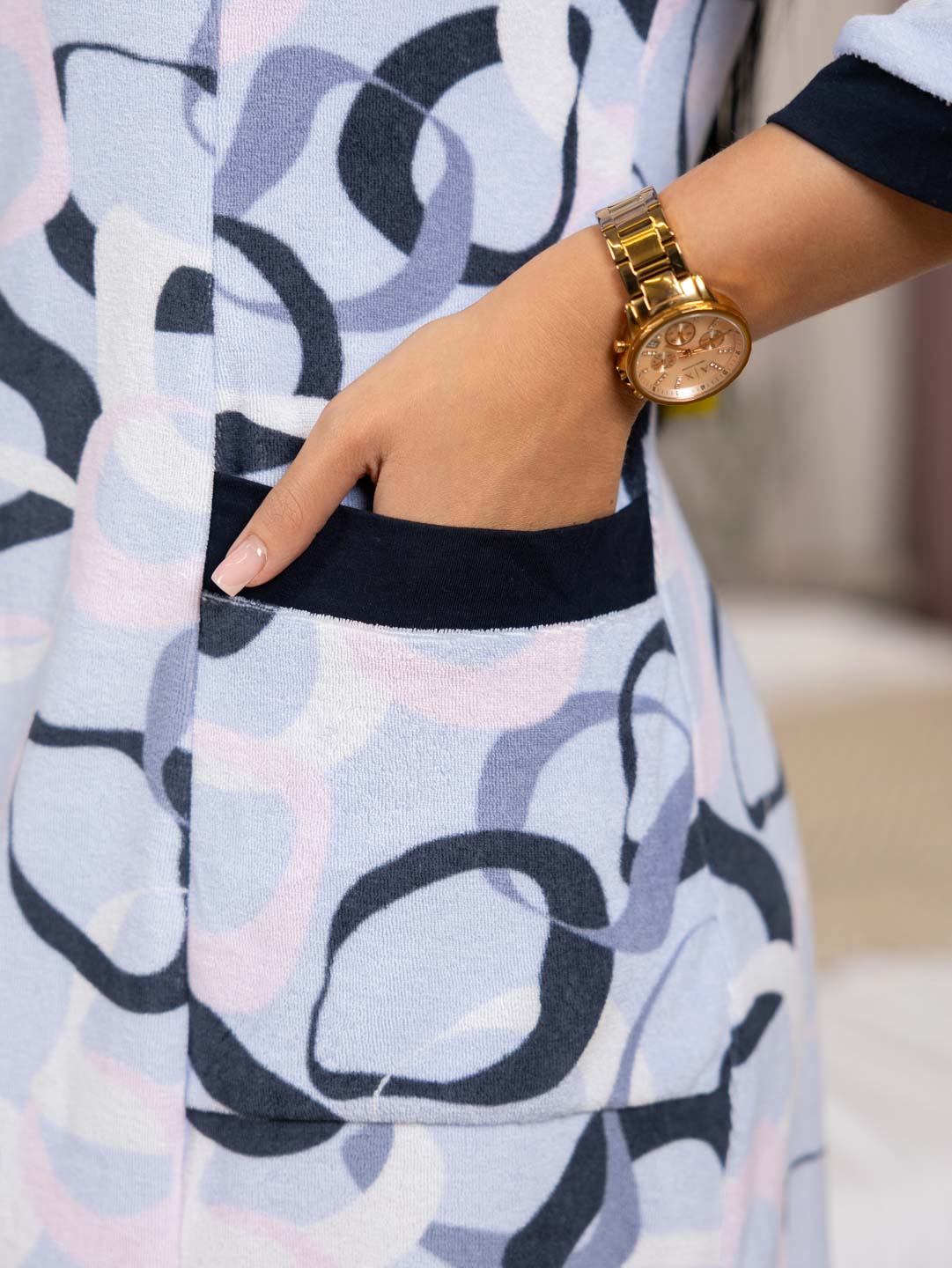 Халат из качественной турецкой махры полуприлегающего силуэта, длиной чуть ниже колена, с контрастной отделкой по горловине, карману и манжету рукава.