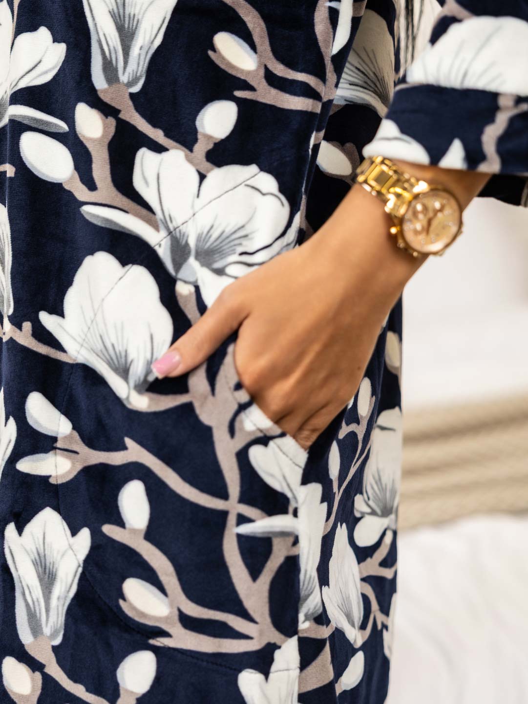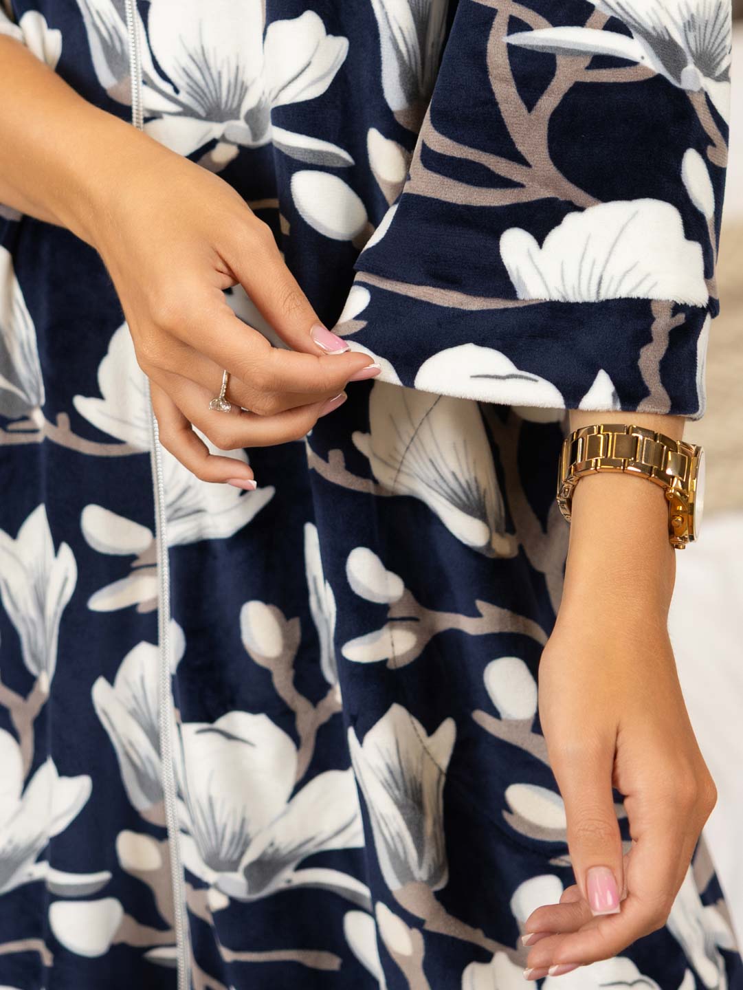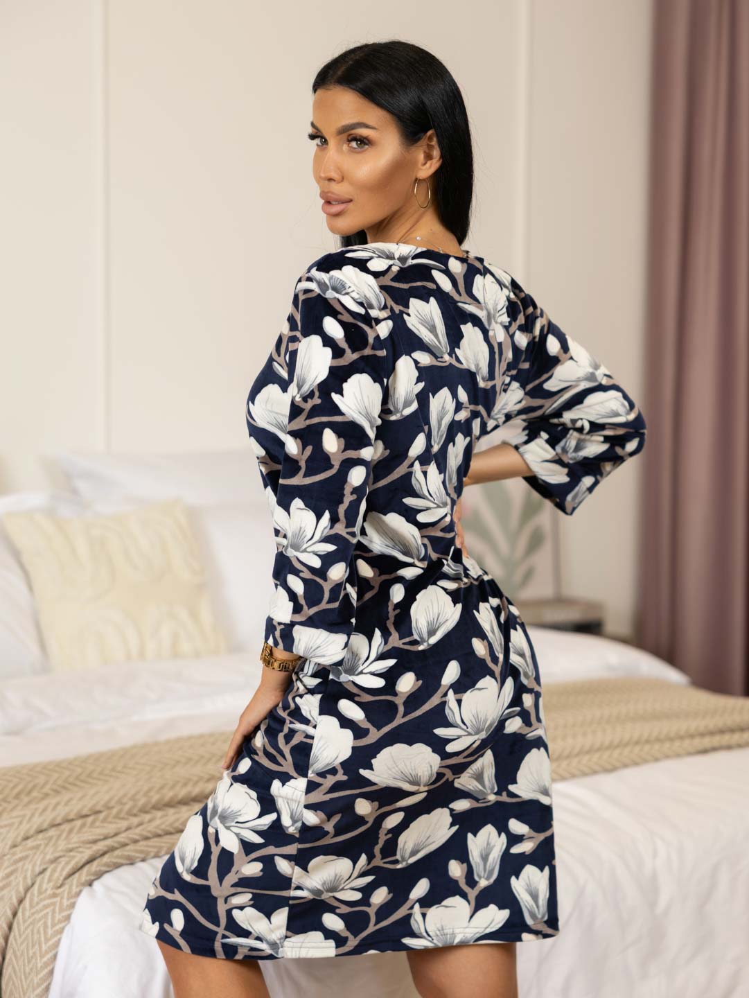 Женский халат из трикотажного полотна - велюр, прямой силуэтной формы, с О-образной горловиной. Полочка с прорезными карманами, с застёжкой на молнии. Рукав втачной базового покроя длиной 3/4, низ рукава обработан манжетой. Халат отлично подойдет на прохладную погоду.