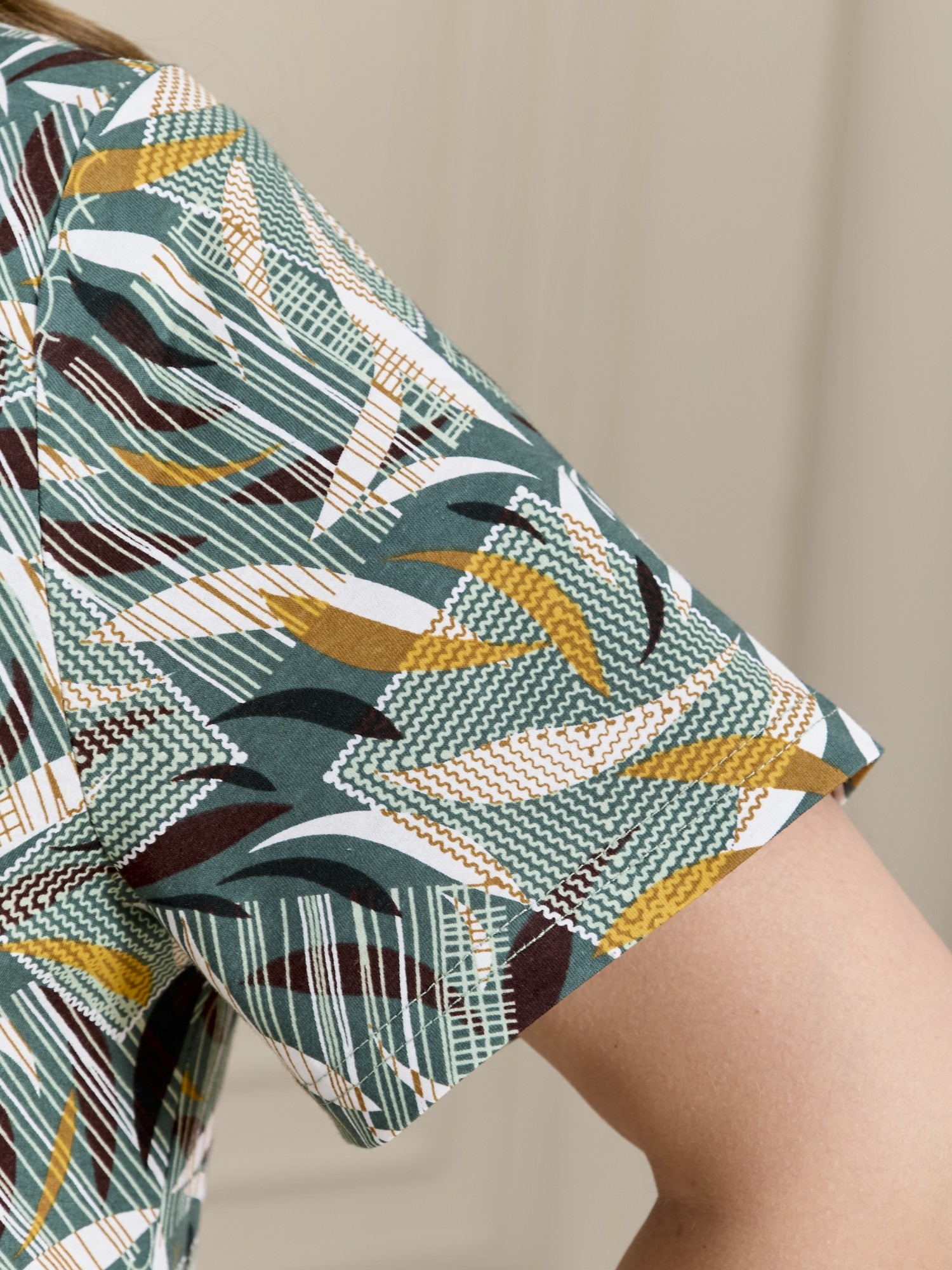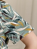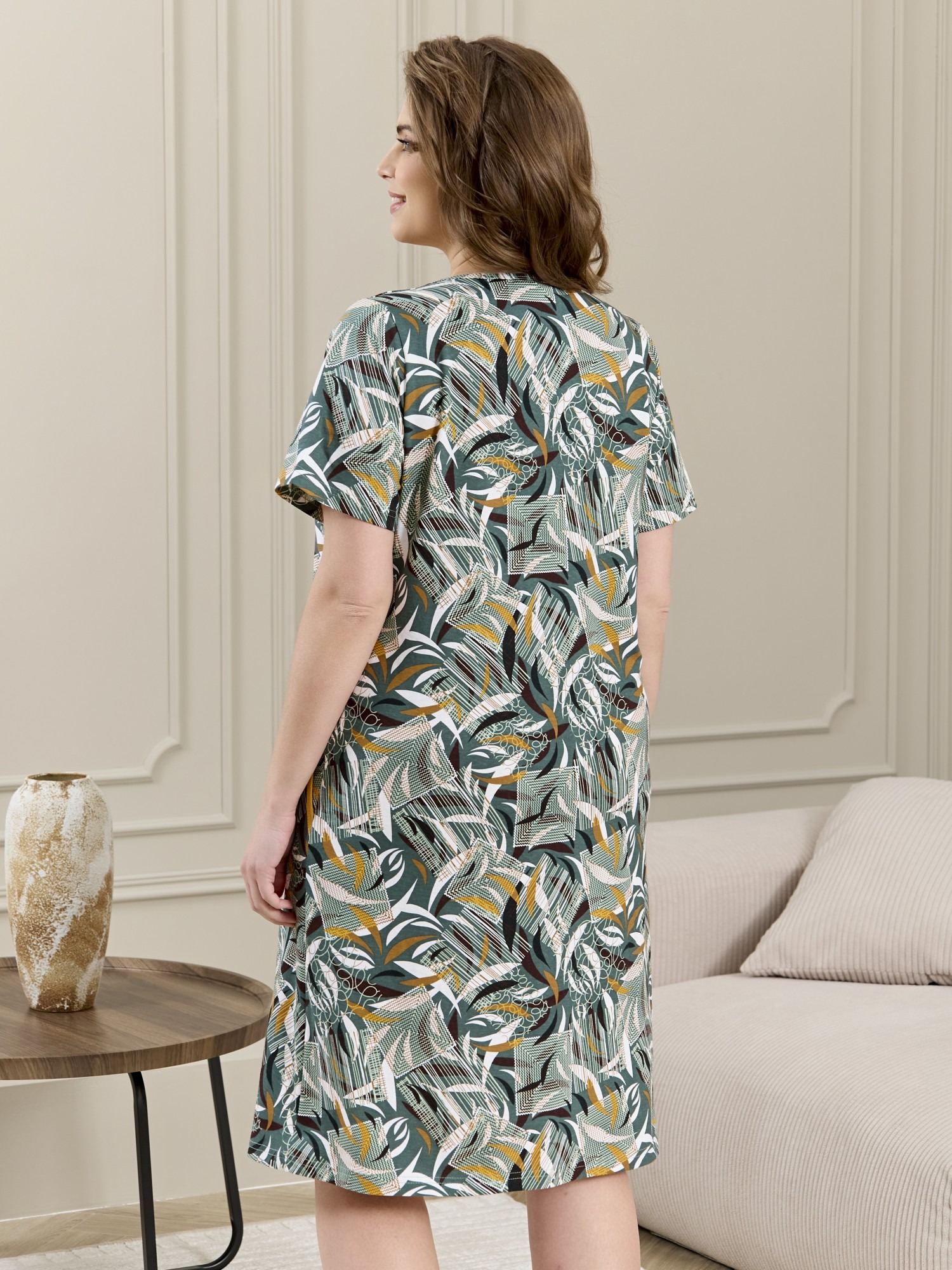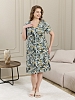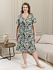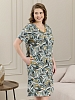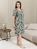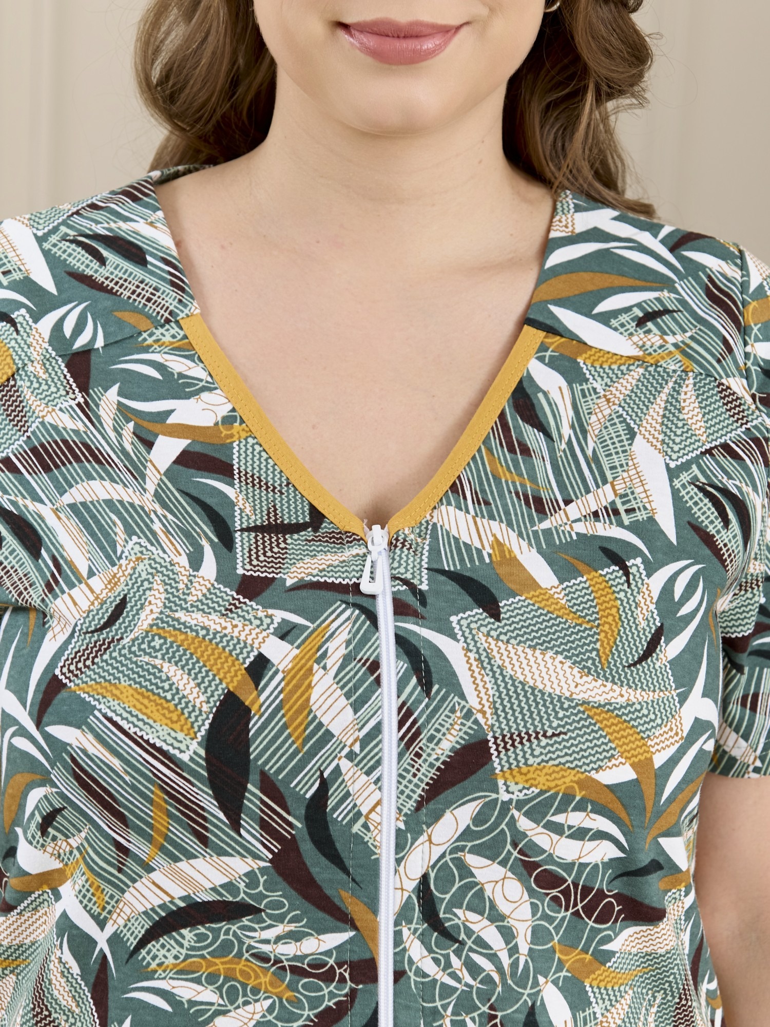 Халат женский из трикотажного полотна «кулирка» с набивным рисунком, прямого силуэта, с короткими втачными рукавами, горловиной V- образной формы, карманами в боковых швах и центральной бортовой застежкой на тесьму «молния». Полочка – с двумя небольшими двойными кокетками, выполненными по косой линии. Горловина переда, входы в карманы окантованы контрастным материалом.
