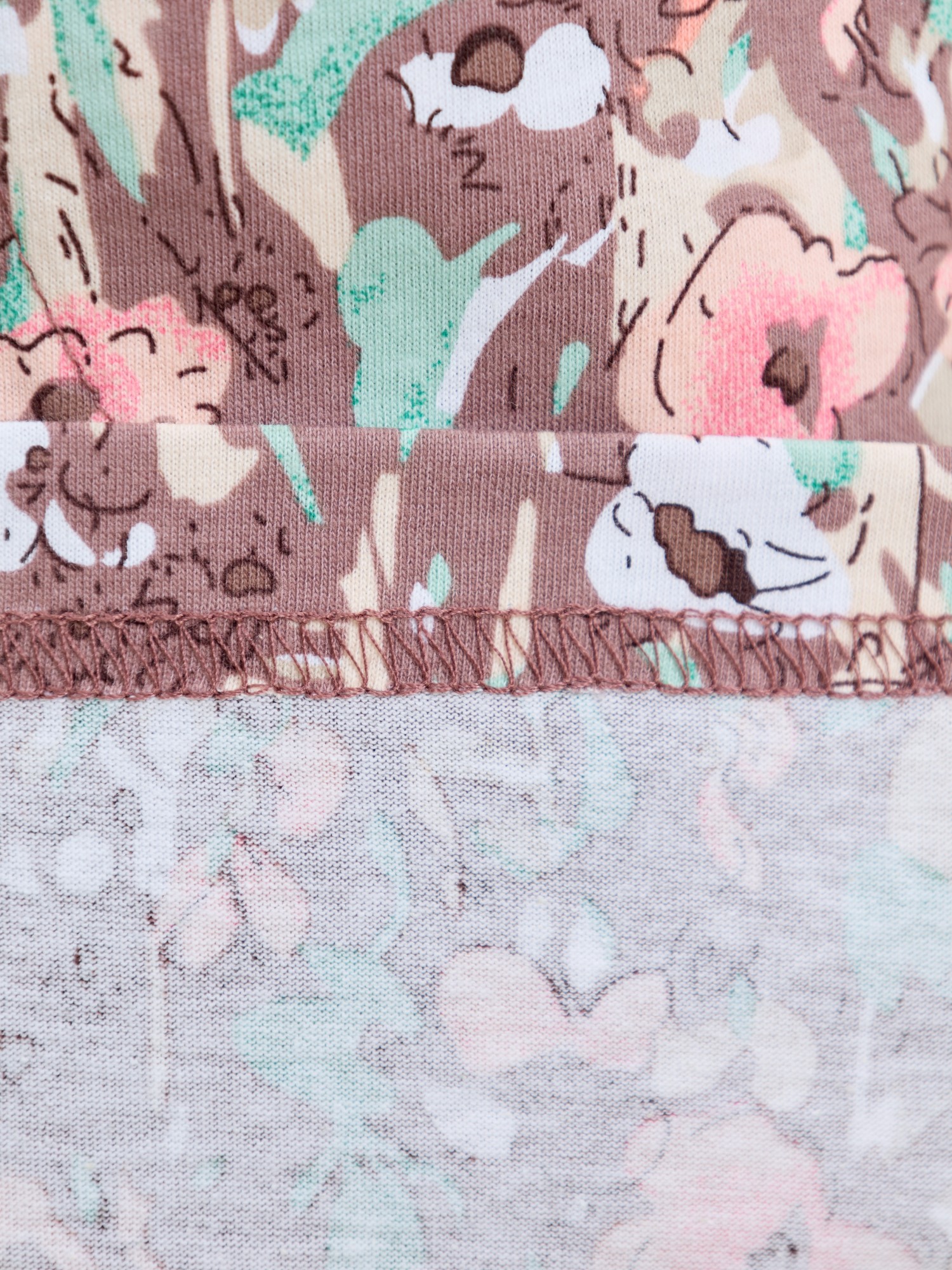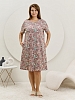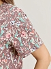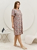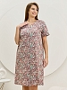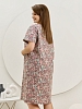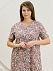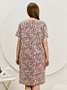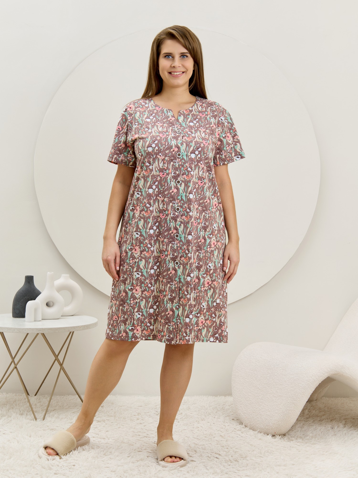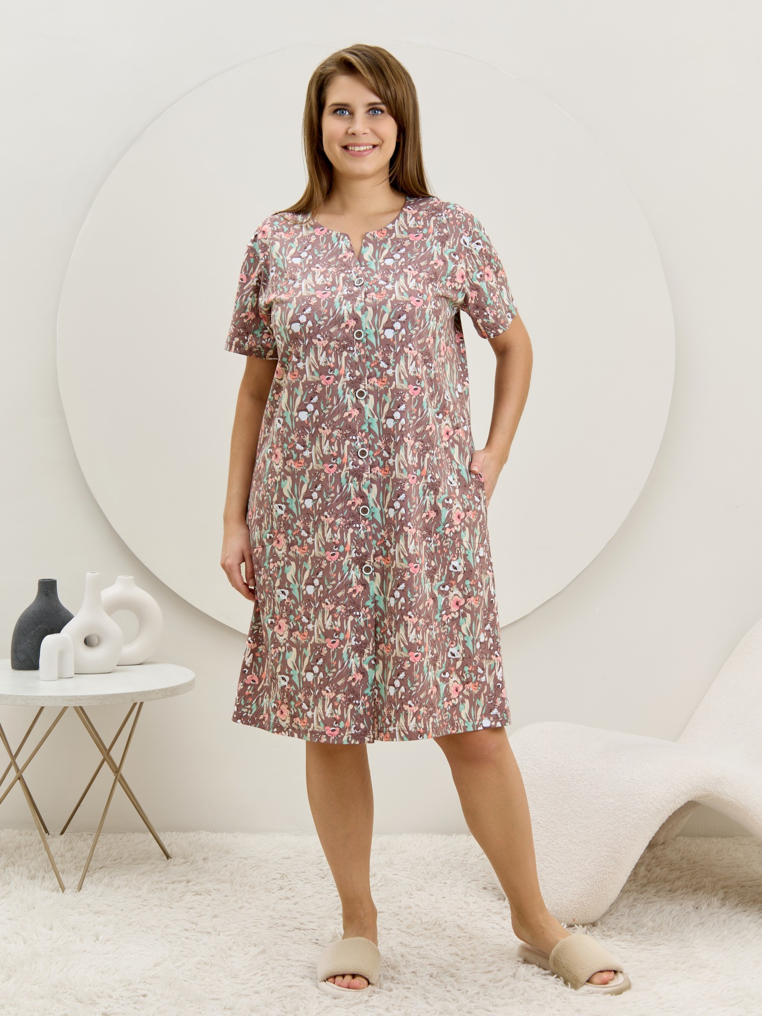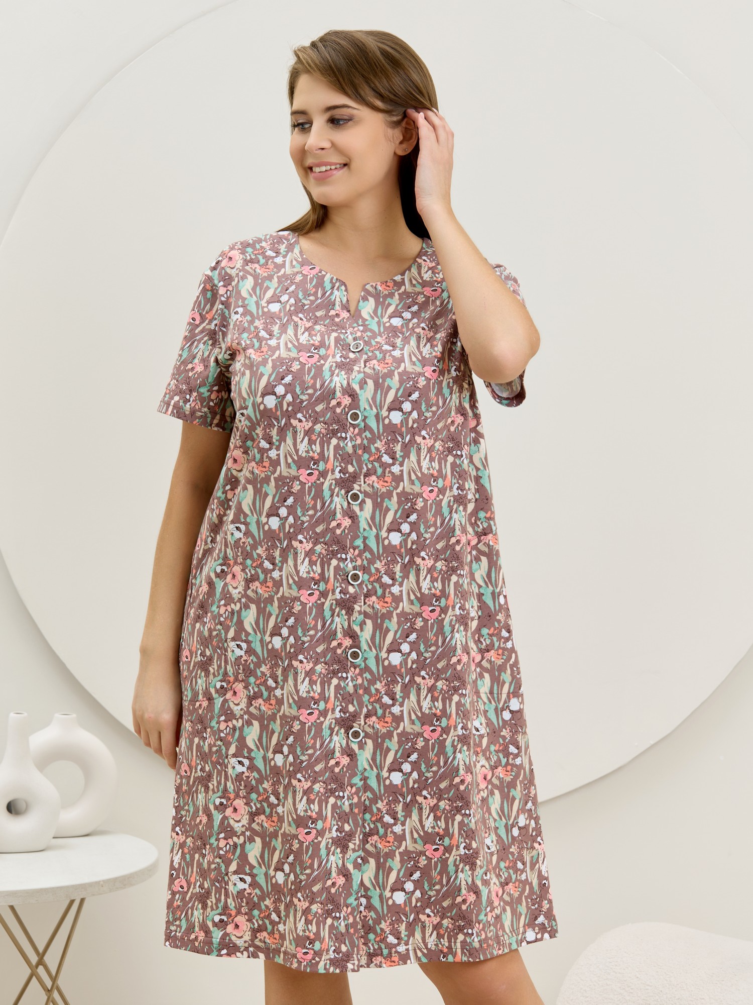 Халат женский из трикотажного полотна «кулирка» с набивным рисунком, прямого силуэта, с короткими втачными рукавами, карманами в боковых швах и центральной бортовой застежкой на обметанные петли и пуговицы. Горловина – овальной формы, переходящая в небольшой v-образный вырез выше верхней пуговицы. Входы в карманы и горловина спинки окантованы.