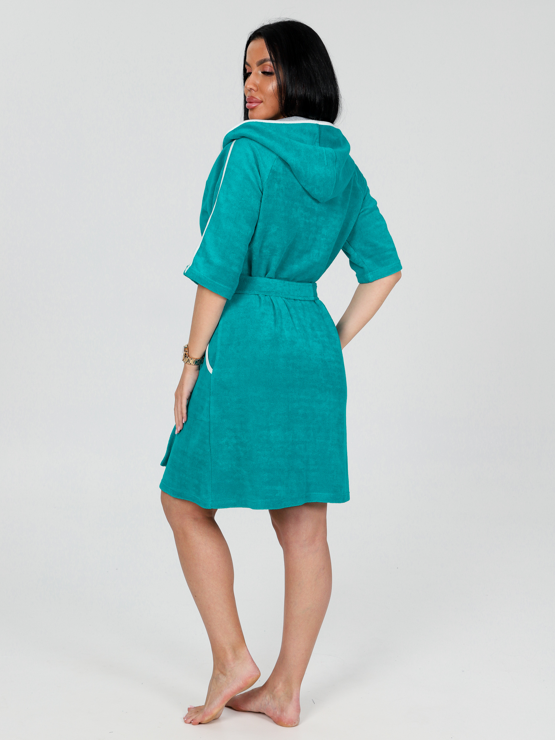 Домашний халат из хлопковой махры. Ткань мягкая, комфортная к телу, позволяющая коже дышать. Женский халат с капюшоном, двумя внутренними карманами, украшенный контрастной окантовкой и лампасами на рукавах. Капюшон двойной, внутри выполнен из натуральной ткани - кулирка. Халат универсальный для дома, отдыха, бани, бассейна. Подходит девушкам и женщинам разных возрастов. Полиэстер, входящий в состав ткани, упрощает уход. За счет включенных волокон полиэстера халат не мнется, не теряет форму, долго сохраняет отличный внешний вид.