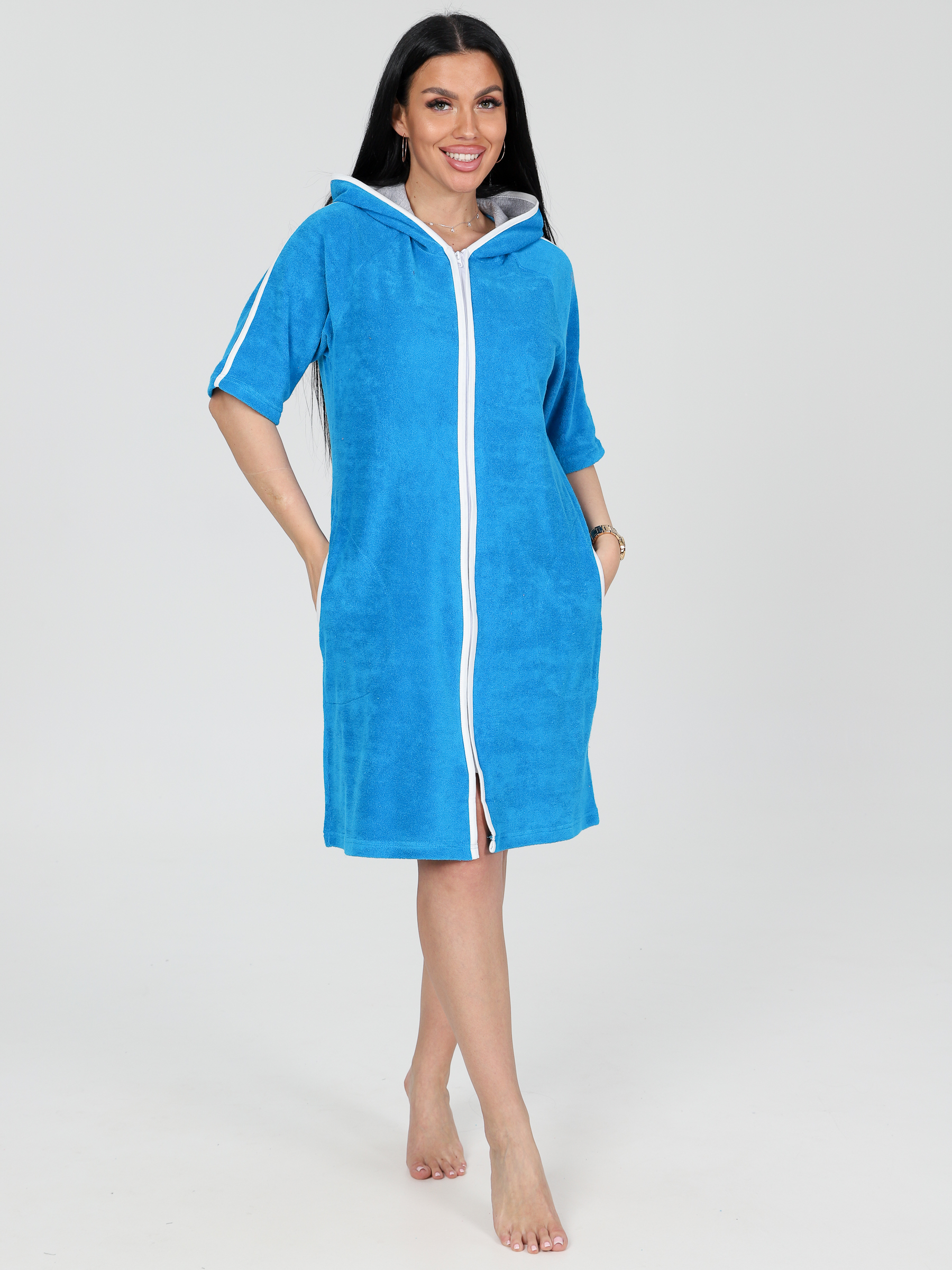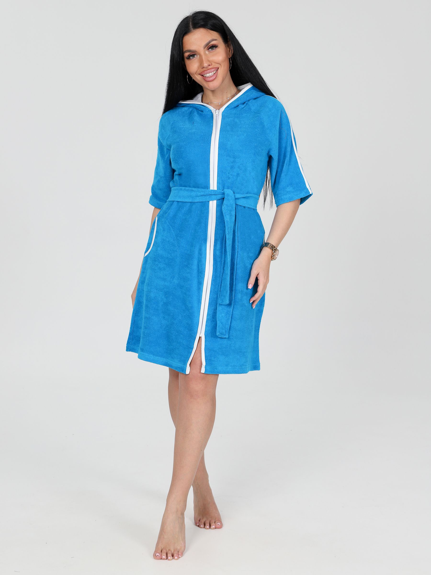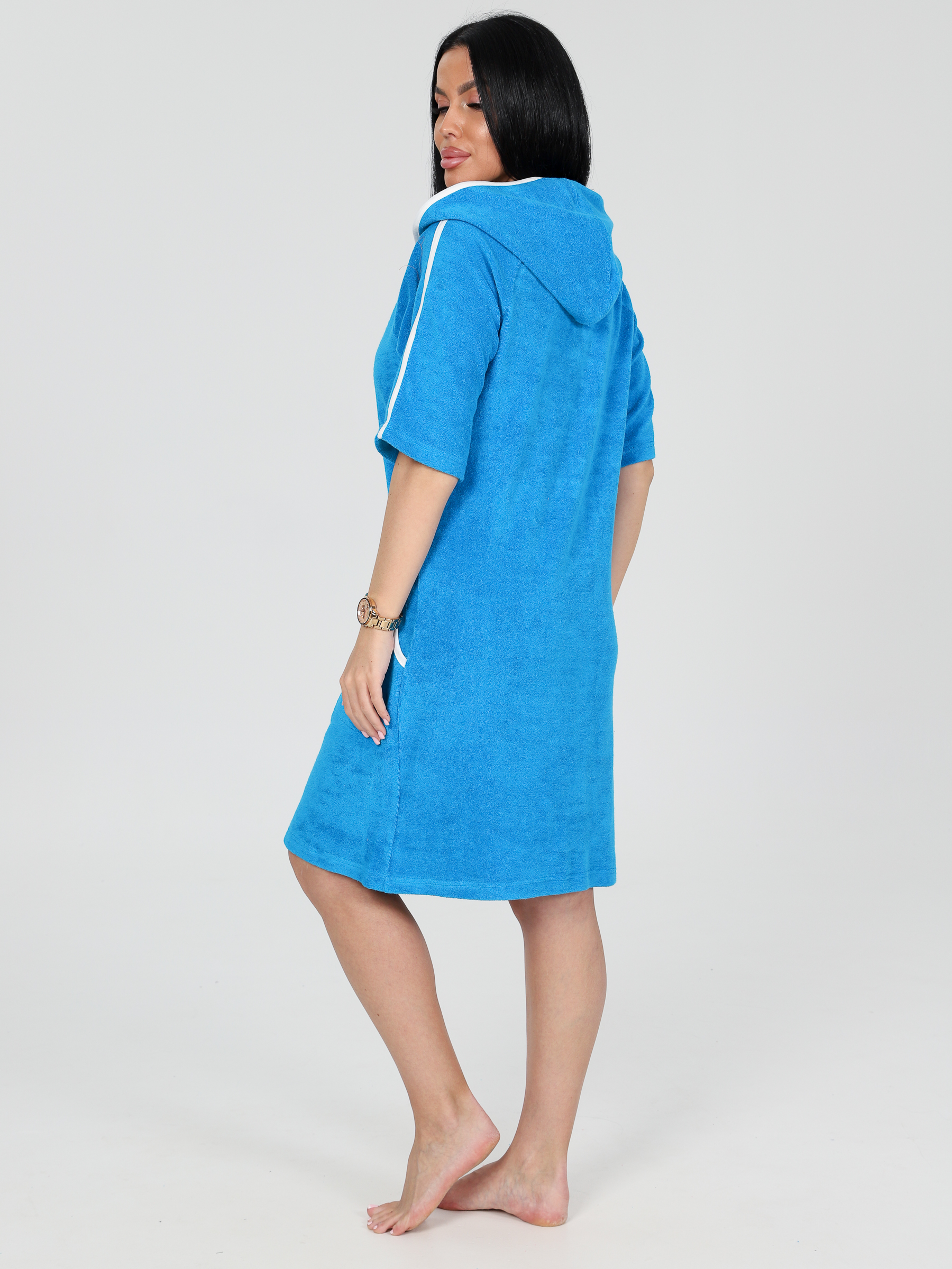 Домашний халат из хлопковой махры. Ткань мягкая, комфортная к телу, позволяющая коже дышать. Женский халат с капюшоном, двумя внутренними карманами, украшенный контрастной окантовкой и лампасами на рукавах. Капюшон двойной, внутри выполнен из натуральной ткани - кулирка. Халат универсальный для дома, отдыха, бани, бассейна. Подходит девушкам и женщинам разных возрастов. Полиэстер, входящий в состав ткани, упрощает уход. За счет включенных волокон полиэстера халат не мнется, не теряет форму, долго сохраняет отличный внешний вид.