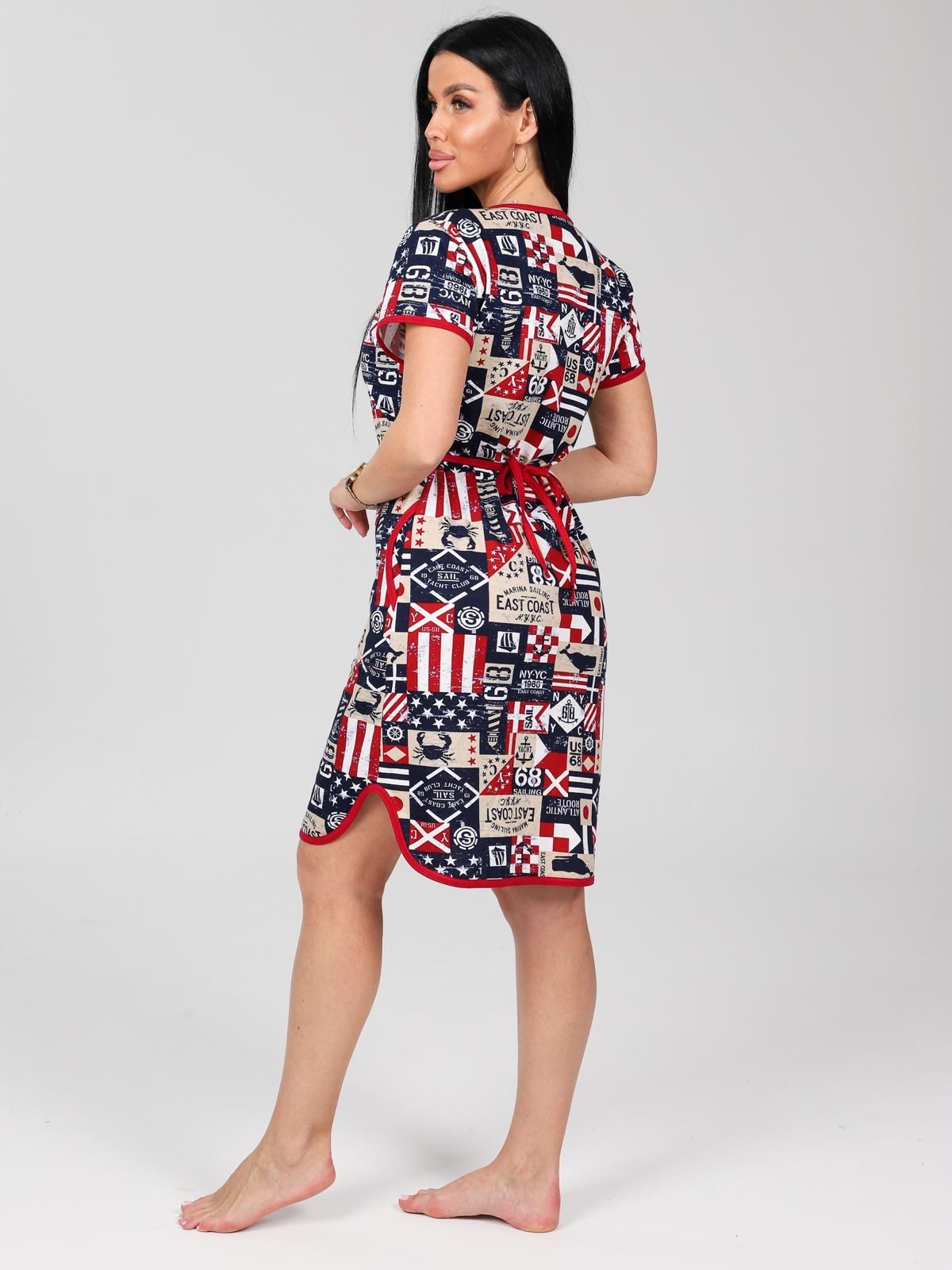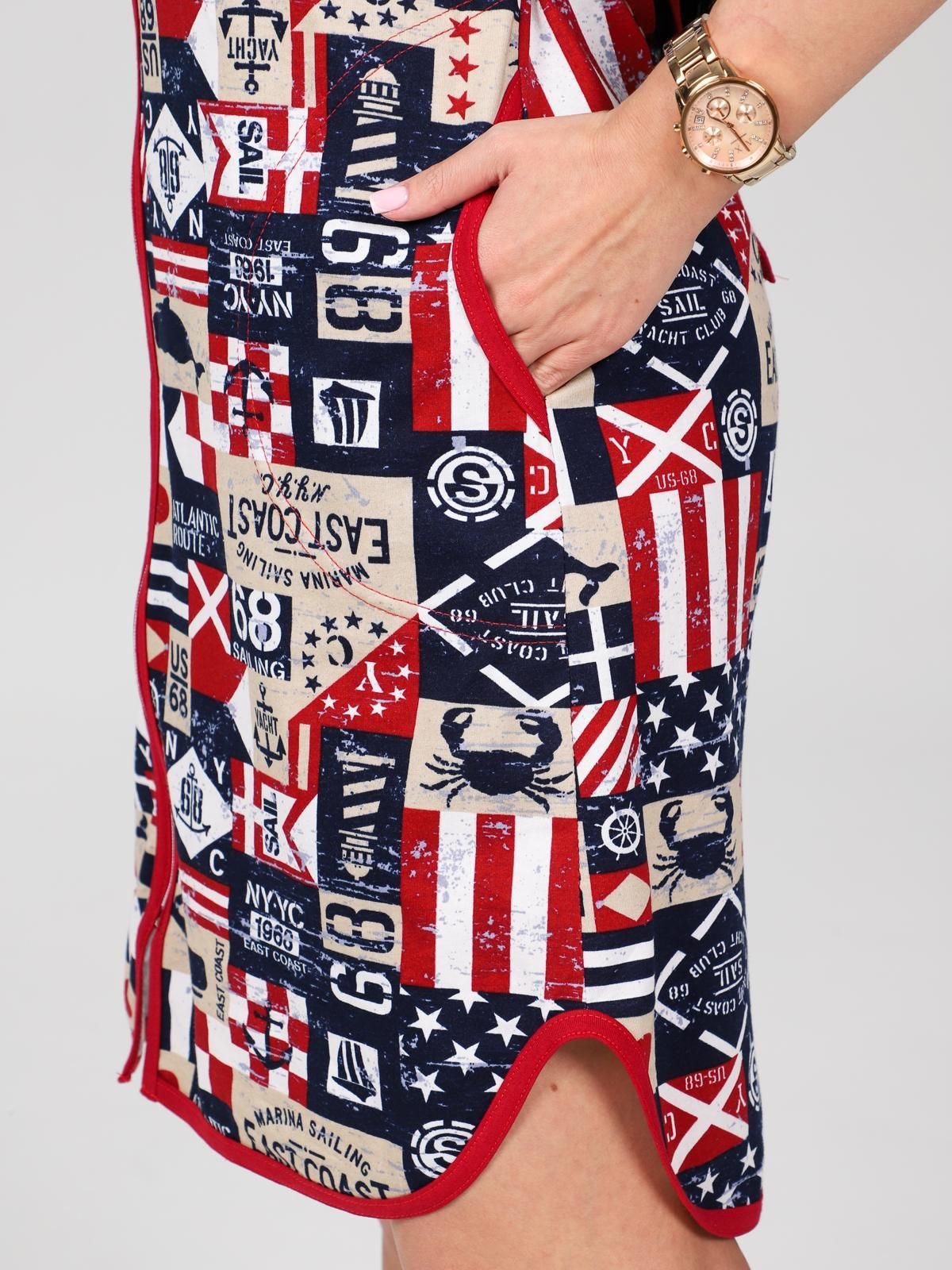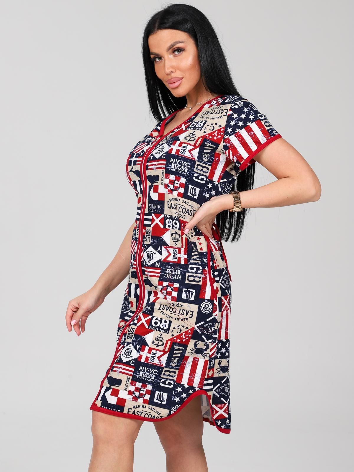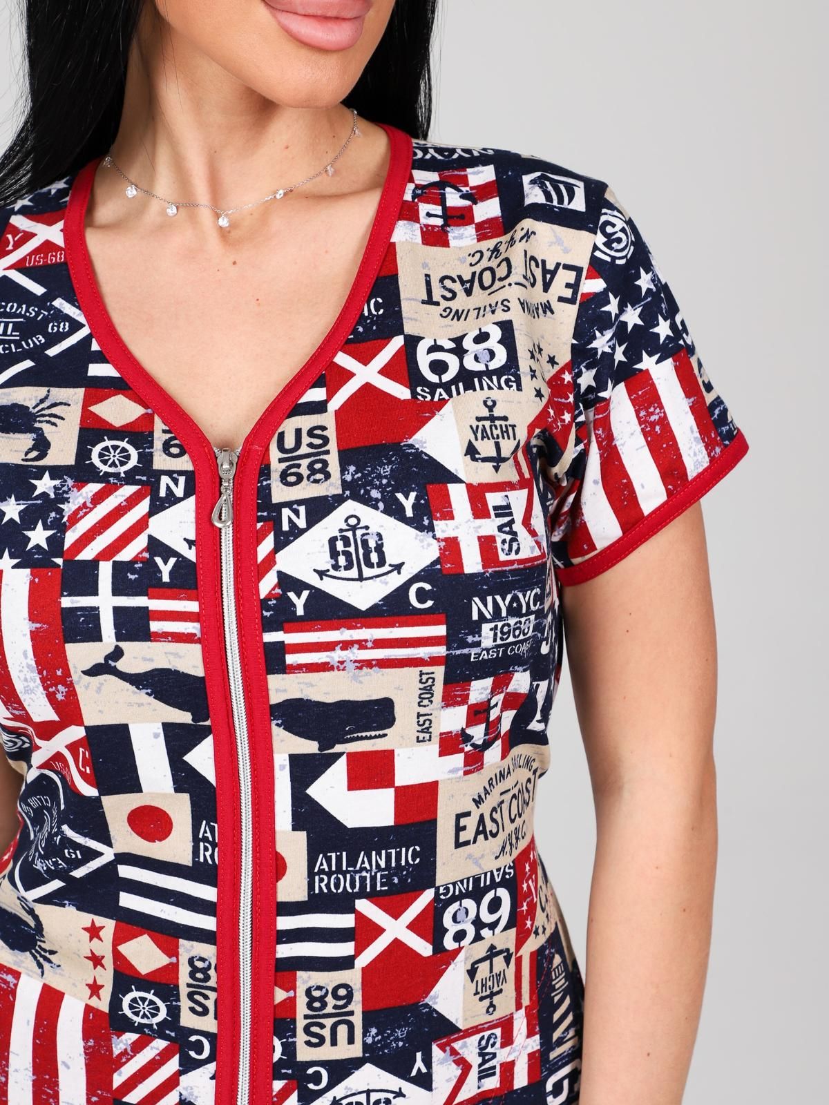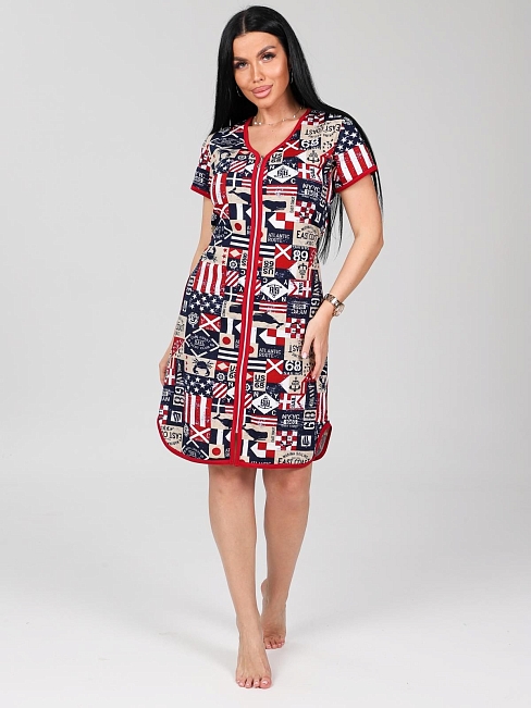 Халат из набивной кулирки. Фигурная горловина, борта, низ короткого рукава и фигурный низ халата отделаны окантовкой. Застежка-молния халата отделочная, что дополнительно придает колорит изделию, придавая обладательнице отличное настроение.