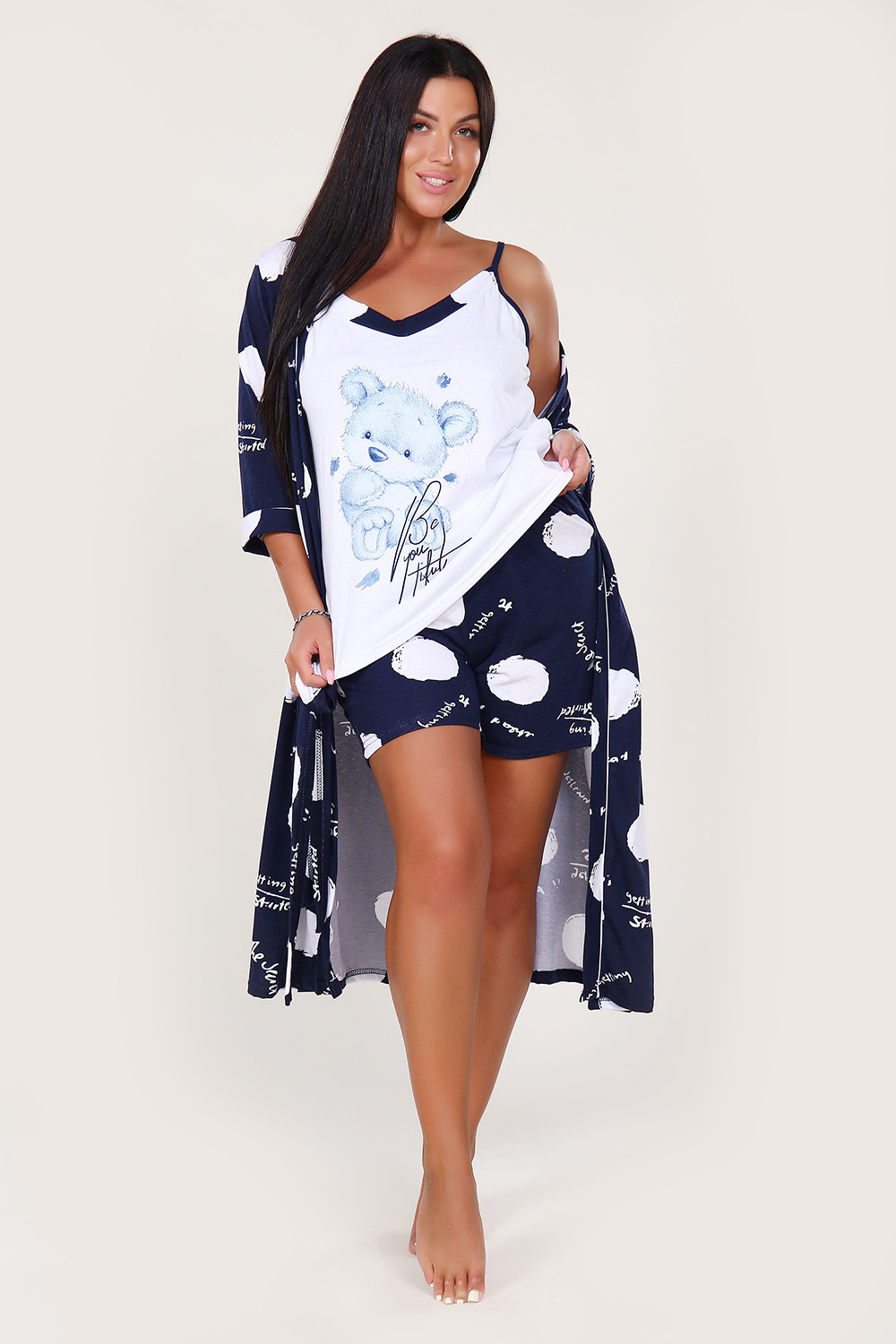 Женский комплект из халата, топа и шорт из кулирки — это домашняя одежда, которая сочетает комфорт и практичность. Кулирка — тонкое трикотажное полотно из 100% хлопка, которое хорошо тянется, не мнётся и позволяет коже дышать. Такие комплекты подходят для дома, отдыха, сна или использования в качестве пижамного комплекта.