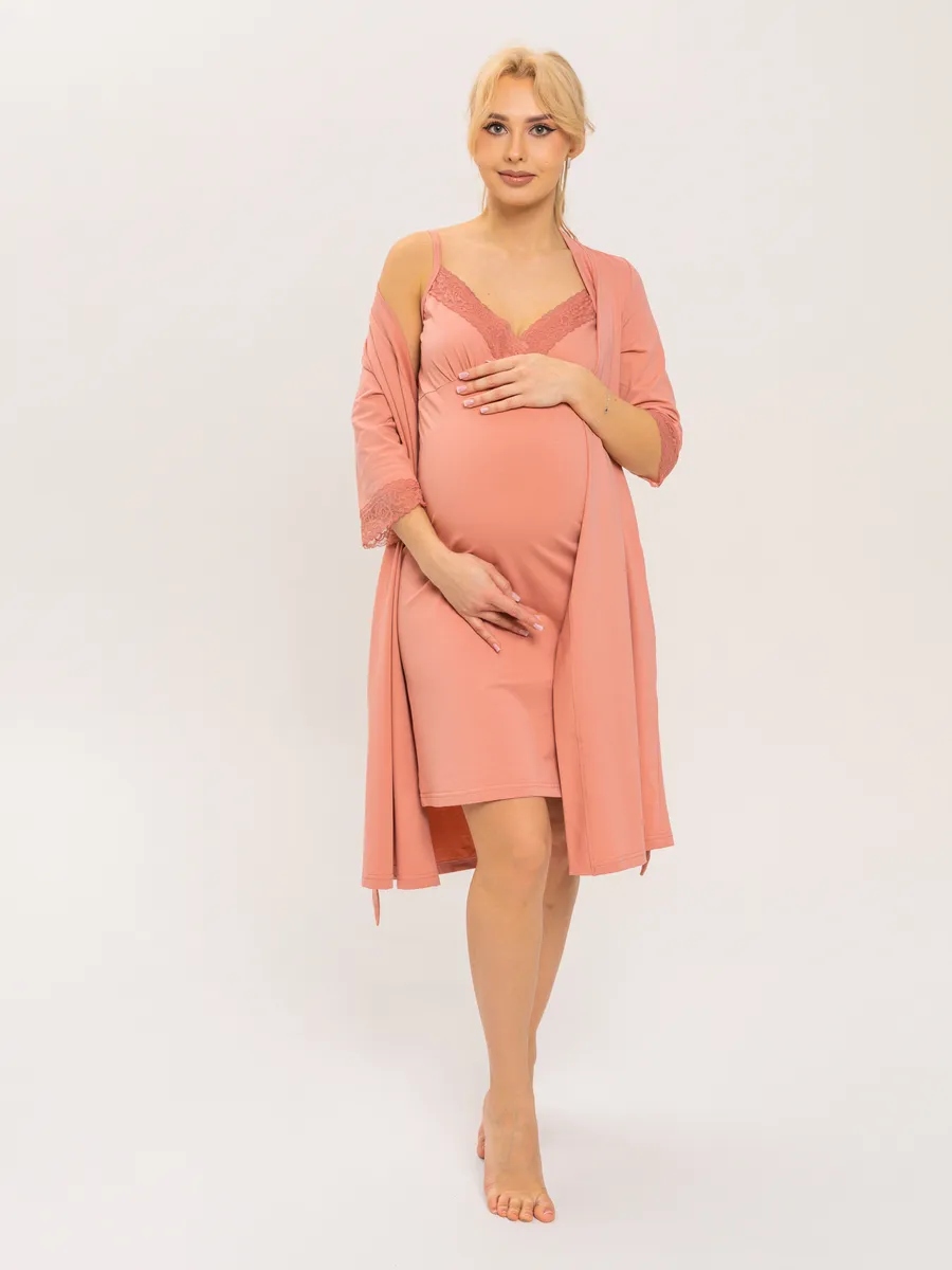 Практичный и невероятно удобный комплект «Для мамы» / Пыльная Роза арт.к1156пр в роддом для беременных и кормящих из 100% Хлопка Премиум, который состоит из ночной сороки и халата с запахом. Сорочка - оптимальной длины, выполнена из однотонной хлопковой ткани Премиального качества, на бретелях с регуляторами из декоративной резинки. Верх изделия разработан для максимального комфорта во время кормления грудью. Крайне привлекательно смотрится декоративная отделка кружевом. Халат с запахом, удобным поясом, боковыми карманами и рукавом 3/4. Длина - ниже колена. По низу рукавов - отделка эластичным кружевом. В боковом шве 3 петли для регулировки высоты пояса. Такой комплект, состоящий из халата и сорочки, ни в коем случае не останется без внимания. Вы сможете носить его и после беременности, ведь он невероятно удобный и универсальный. Характеристики: 100% хлопковая ткань Премиум; Обработка декоративным эластичным кружевом; Оптимальная длина изделий; Бретели с регуляторами; Комфорт во время кормления; Боковые карманы; 3 уровня регулировки высоты пояс