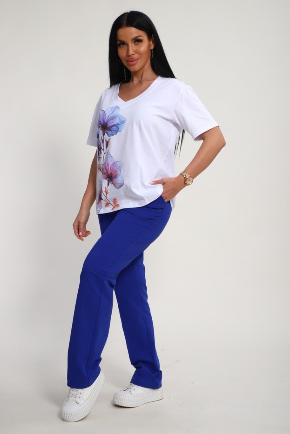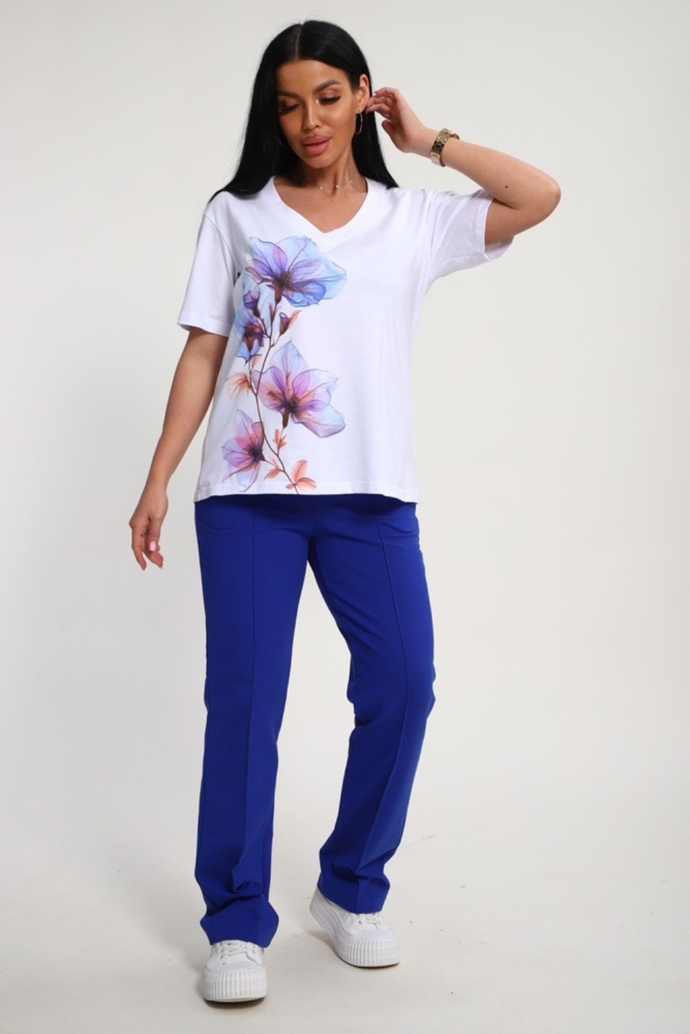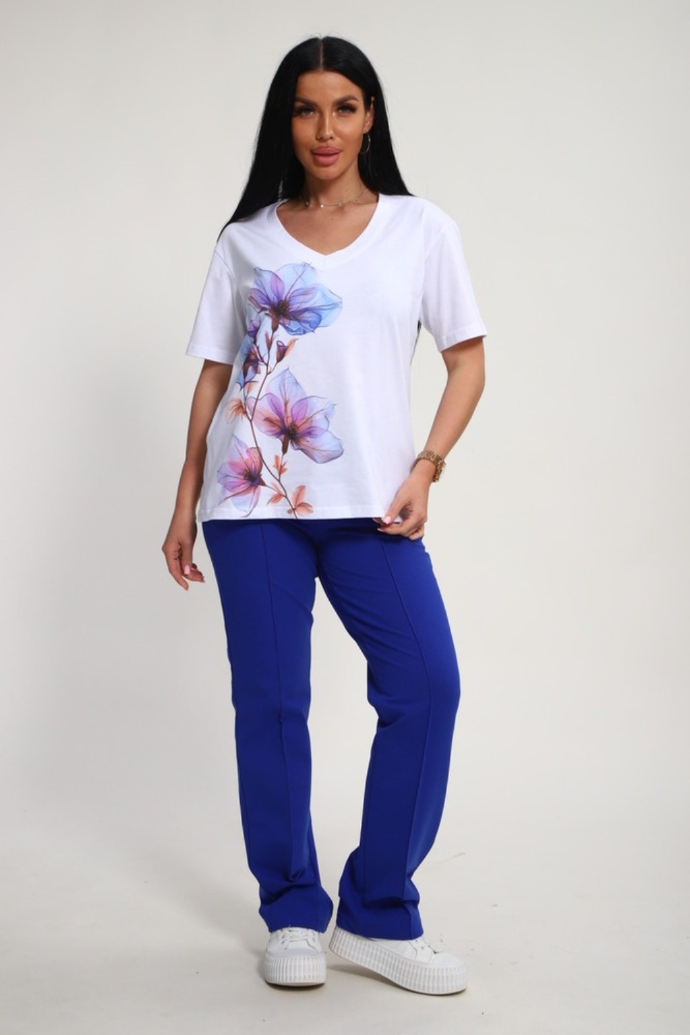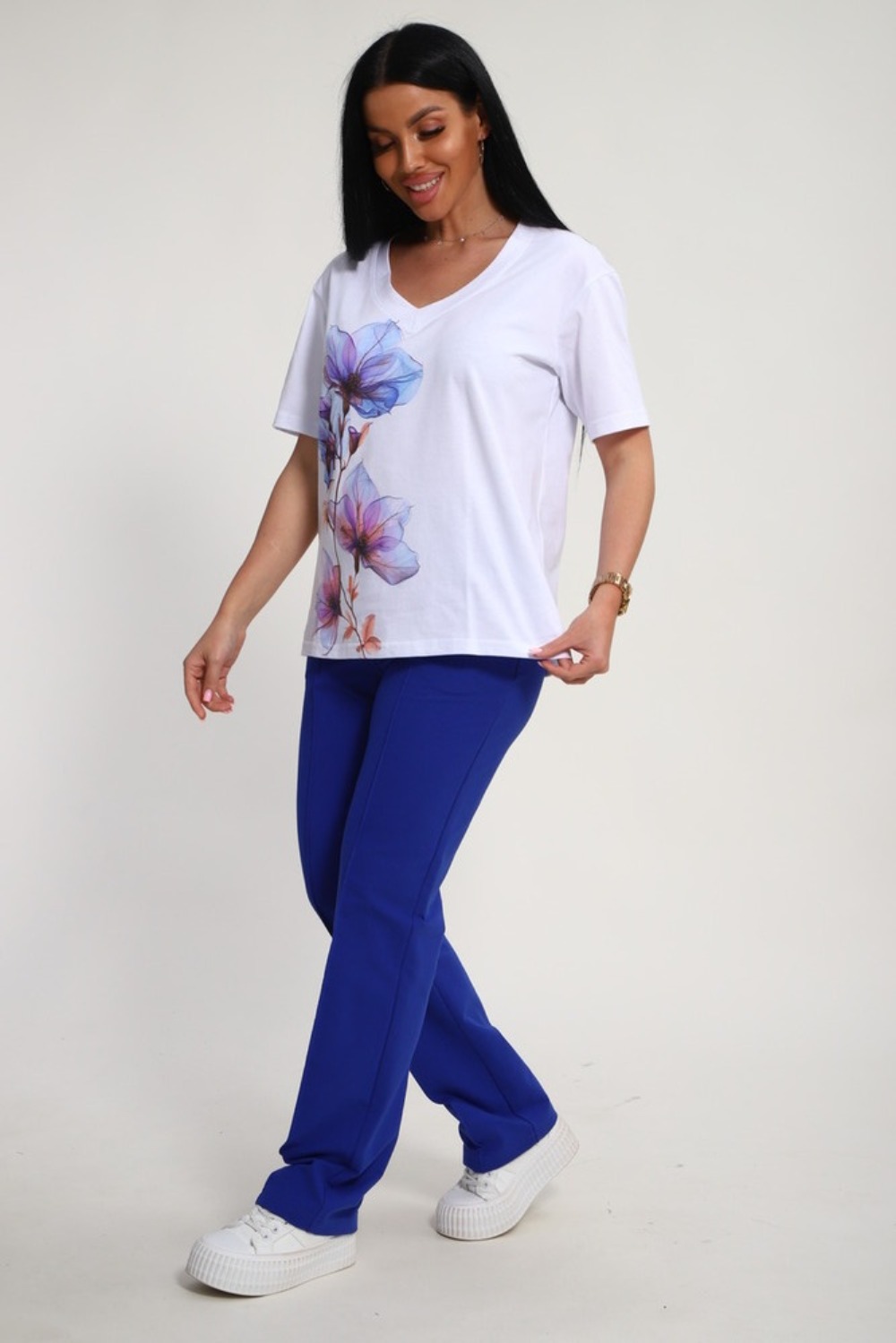 Костюм женский это стильный и идеальный предмет гардероба ,идеально подходящий для дома и отдыха на любой период :весенний ,осенний, летний и зимний. Комплект состоит из футболки с красочным принтом и брюки со стрелками, в контрастном цвете. В составе ткани 100% хлопок . Хлопковый материал очень комфортный и лёгкий в носке. Брюки с удобной посадкой придадут вашему образу стильный и модный вид. Базовый современный костюмчик популярный повседневный .