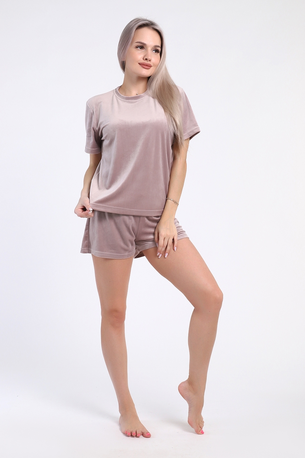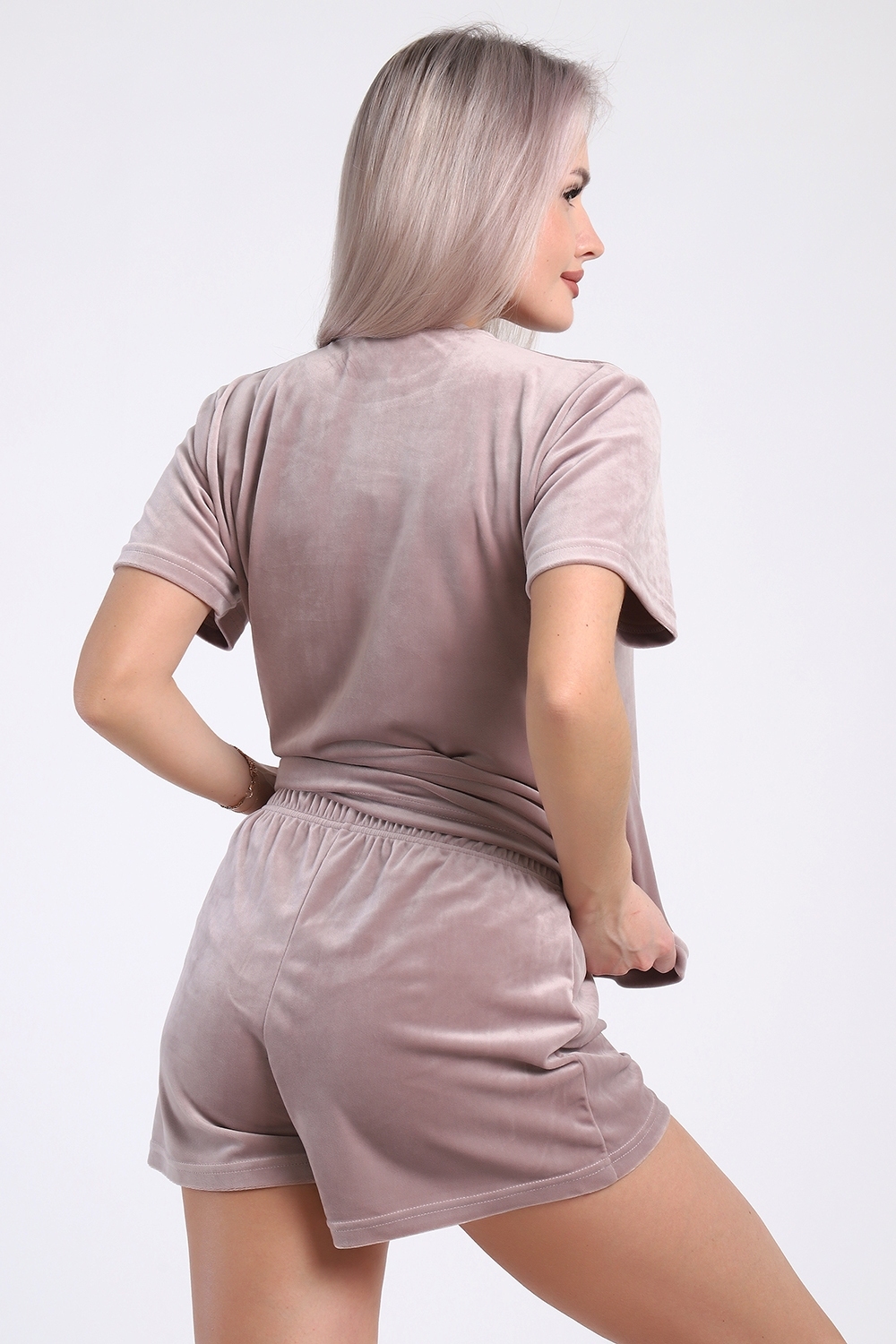 Женский костюм из велюра с шортами — это сочетание комфорта и стиля, подходящее для дома, отдыха или повседневных образов. Такие костюмы обычно состоят из футболки или толстовки и шорт на резинке, выполнены из мягкого материала, который приятен на ощупь.