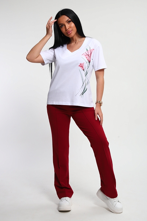 Костюм женский – это стильный и идеальный предмет гардероба ,идеально подходящий для дома и отдыха на любой период :весенний ,осенний, летний и зимний . Комплект состоит из футболки с красочным принтом и брюки в контрастном цвете. В составе ткани 100% хлопок . Хлопковый материал очень комфортный и лёгкий в носке . Брюки с удобной посадкой придадут вашему образу стильный и модный вид . Базовый современный костюмчик – популярный повседневный выбор на каждый день : на работу , для прогулок , праздников и на дачу . Универсальный стиль позволит вам создавать разнообразные образы , подходящие для любого события.