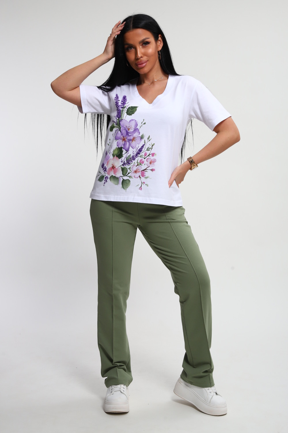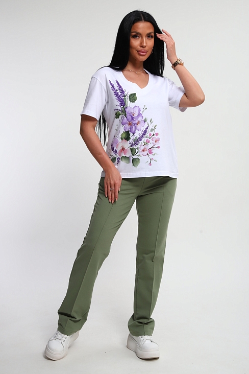 Костюм женский – это стильный и идеальный предмет гардероба ,идеально подходящий для дома и отдыха на любой период :весенний ,осенний, летний и зимний . Комплект состоит из футболки с красочным принтом и брюки в контрастном цвете. В составе ткани 100% хлопок . Хлопковый материал очень комфортный и лёгкий в носке . Брюки с удобной посадкой придадут вашему образу стильный и модный вид . Базовый современный костюмчик – популярный повседневный выбор на каждый день : на работу , для прогулок , праздников и на дачу . Универсальный стиль позволит вам создавать разнообразные образы , подходящие для любого события.