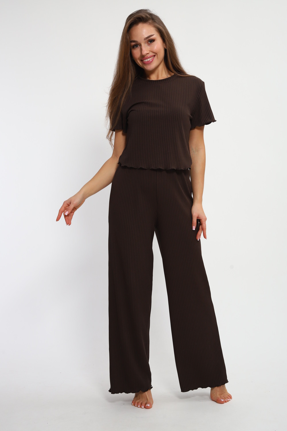 Базовая однотонная женская пижама со штанами и футболкой — идеальный стильный комплект для сна. Наши лёгкие брюки и красивая удобная футболка созданы для того, чтобы чувствовать себя комфортно и уютно. Благодаря широкой размерной сетки пижама подойдёт каждой девушке. Вискозная двойка из ткани с фактурой лапша практически не мнётся и быстро сохнет, что очень удобно. Рубчик добавляет интересный акцент, а трендовый шоколадный цвет делают этот костюм по-настоящему привлекательным.