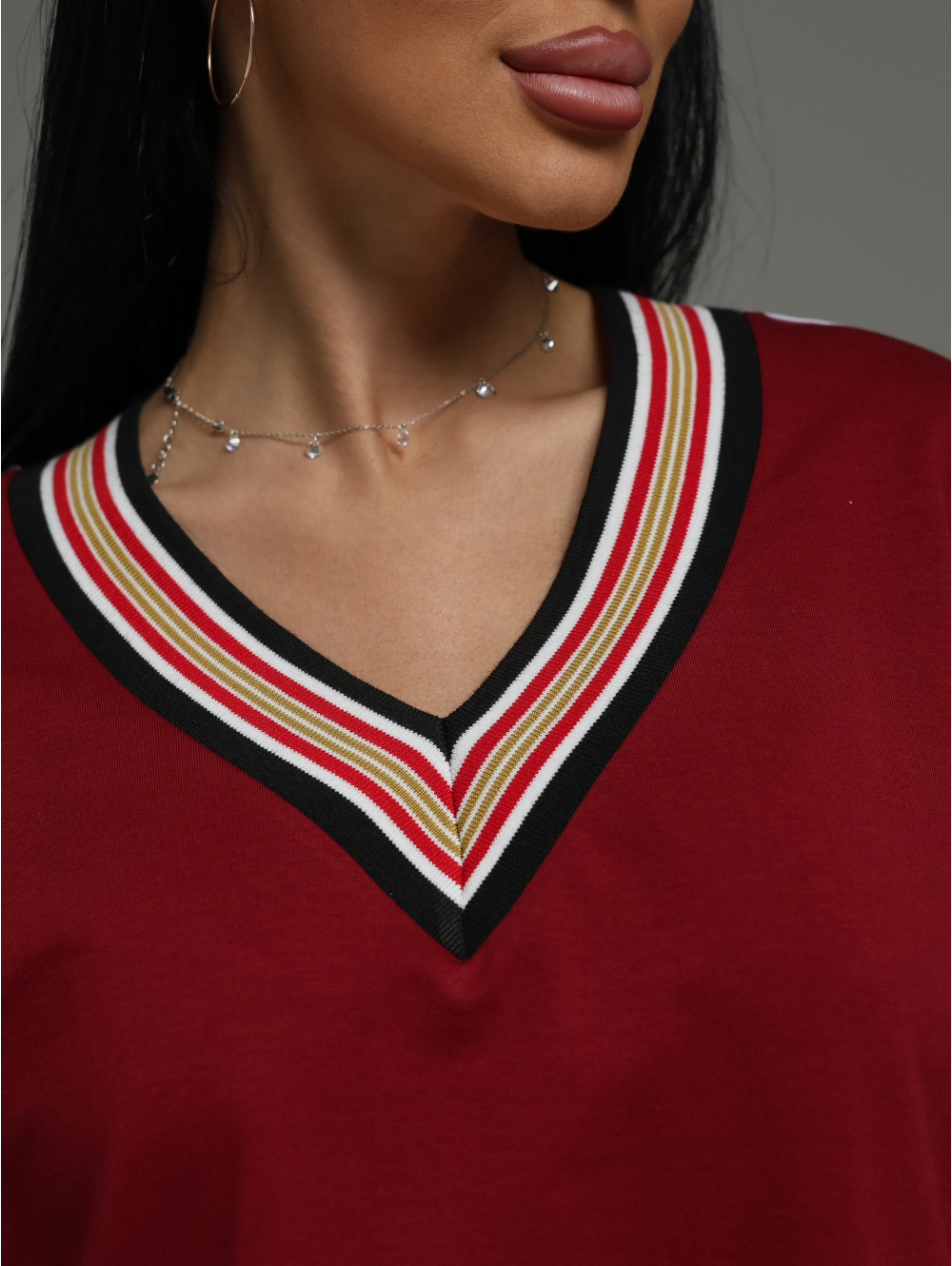 Горловина: Глубокий V-образный вырез, визуально вытягивающий шею и добавляющий образу женственности.