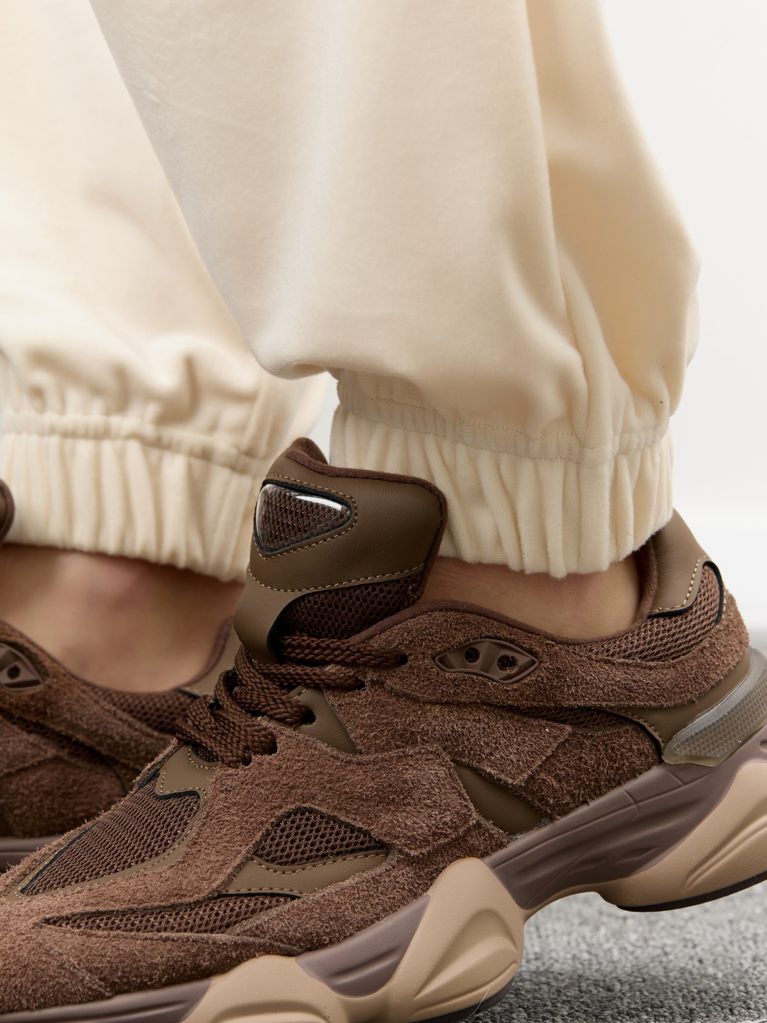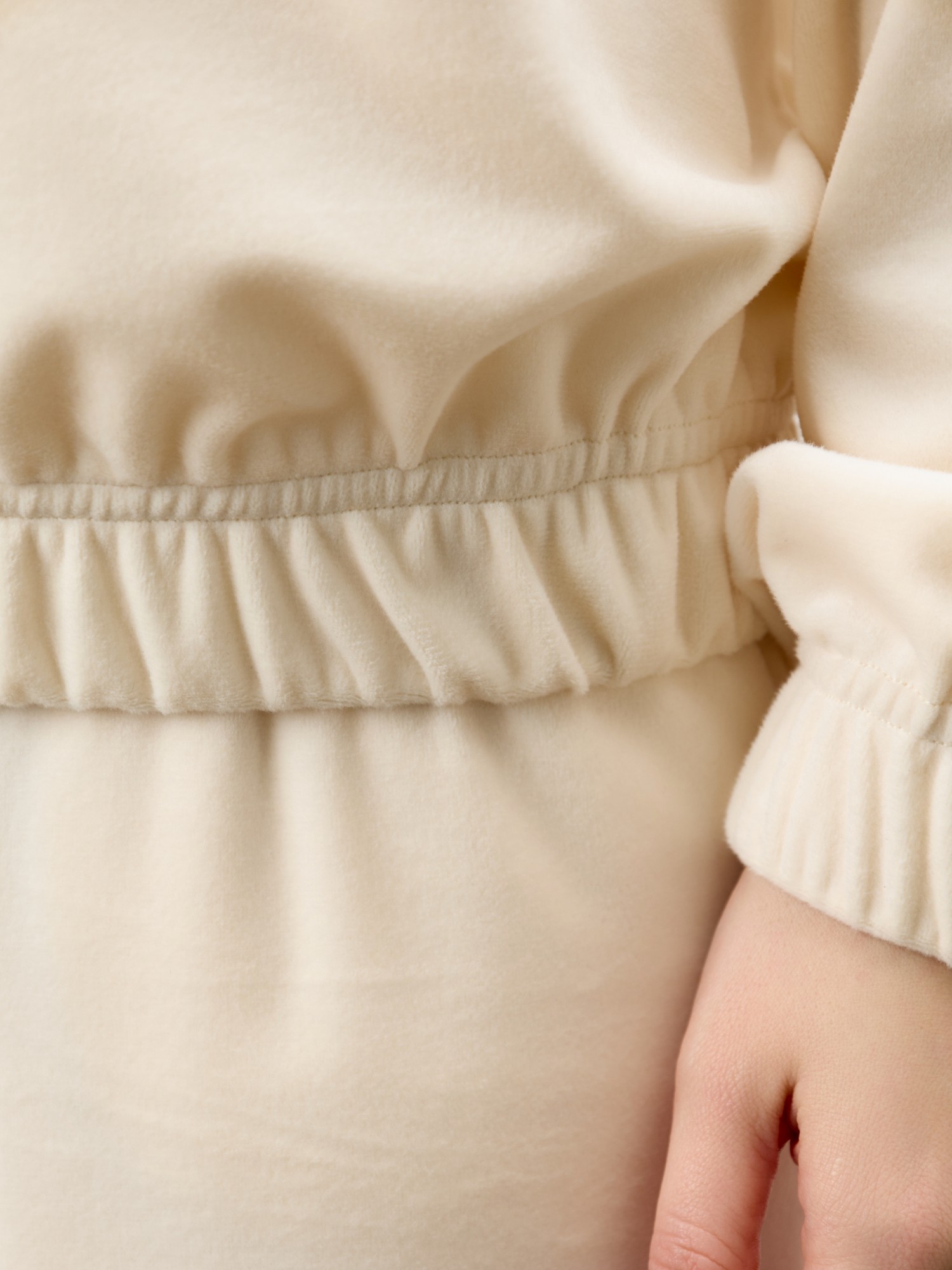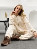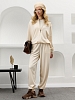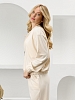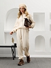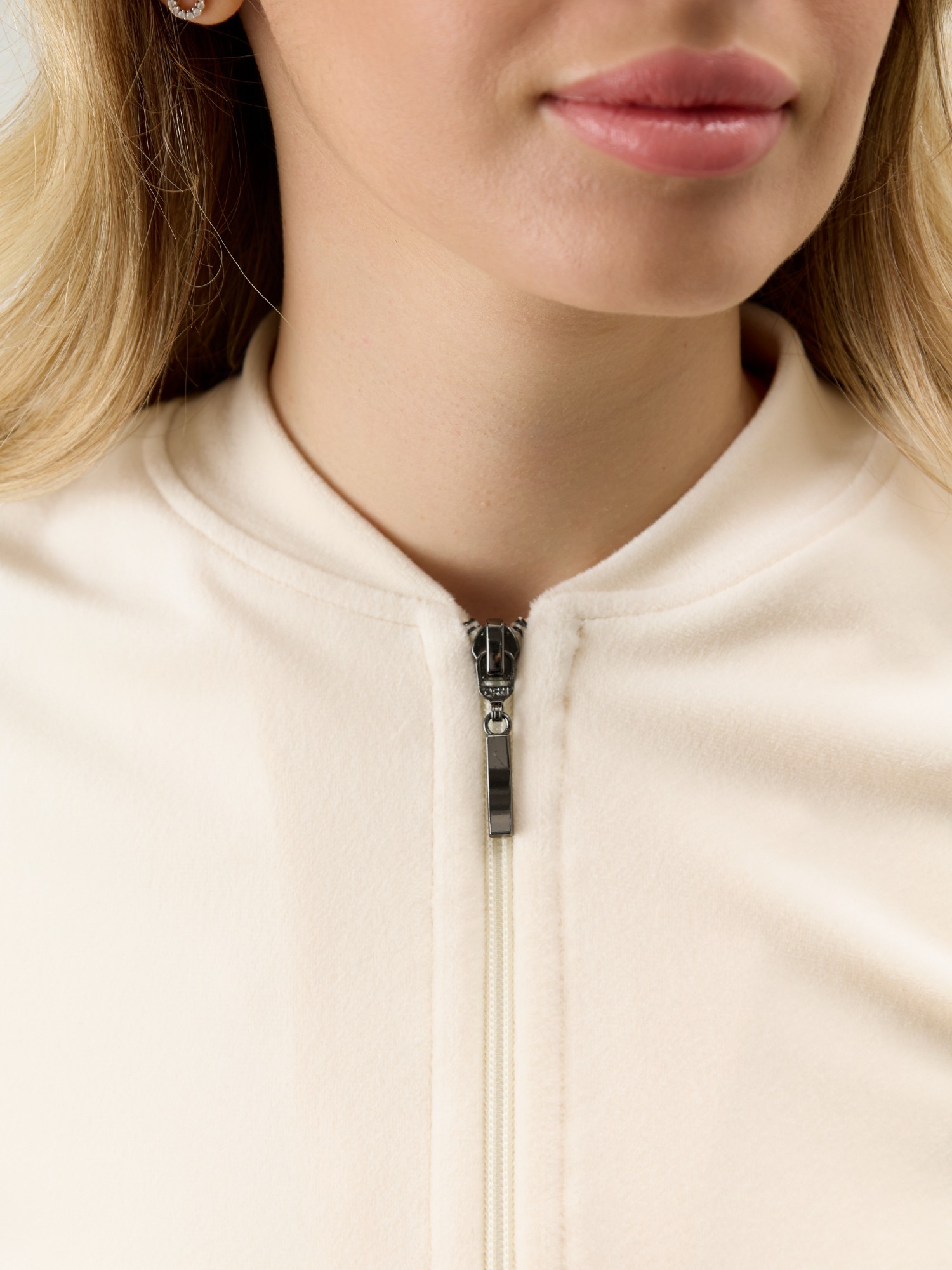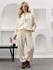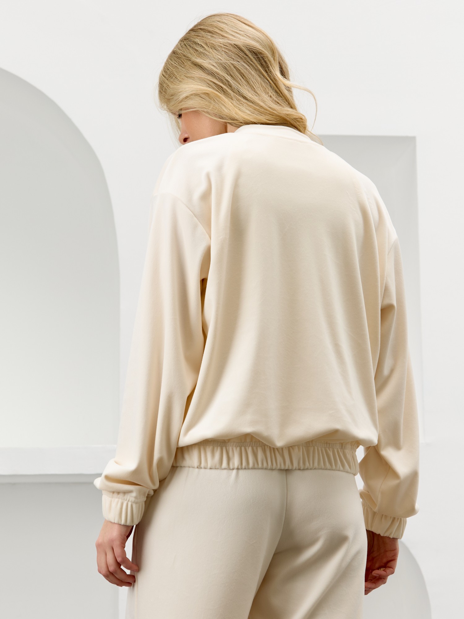 Костюм молодежный из гладкокрашенного полотна «велюр-стрейч», Куртка-бомбер прямого силуэта, свободная, с длинными втачными рукавами, горловиной овальной формы, обработанной втачной планкой, центральной бортовой застежкой на тесьму «молния». Низ изделия и нижние срезы рукавов обработаны подгибкой с вложением широкой эластичной тесьмы.Брюки – длинные, с карманами в боковых швах, на притачном поясе с эластичной тесьмой внутри. Нижние срезы обработаны подгибкой с вложением эластичной тесьмы.