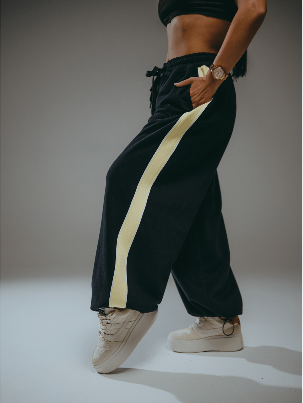 Стильные детали: Брюки дополнены модными лампасами из отделочного материала по боковым швам, что зрительно удлиняет ноги и создает целостный, продуманный образ.