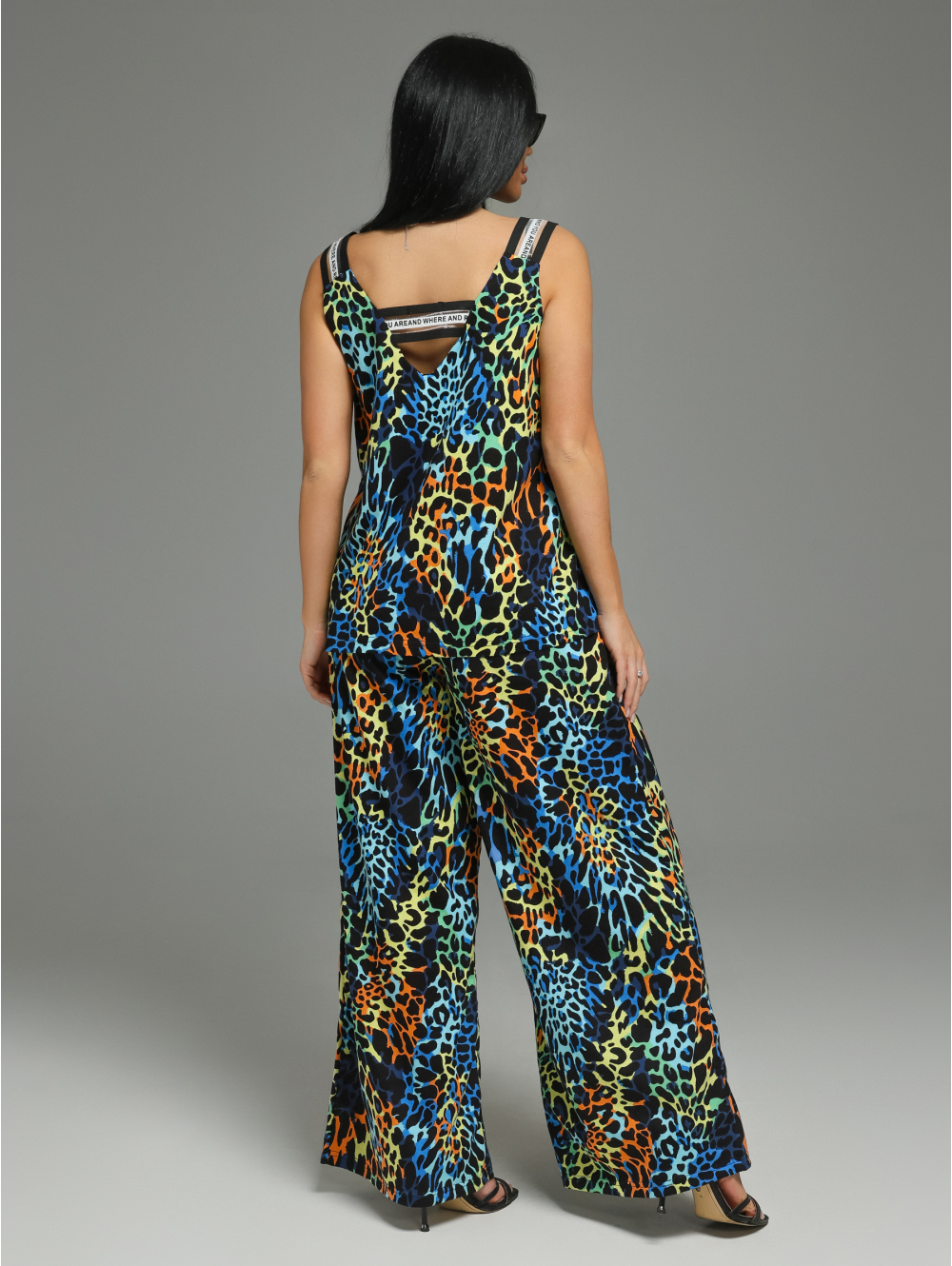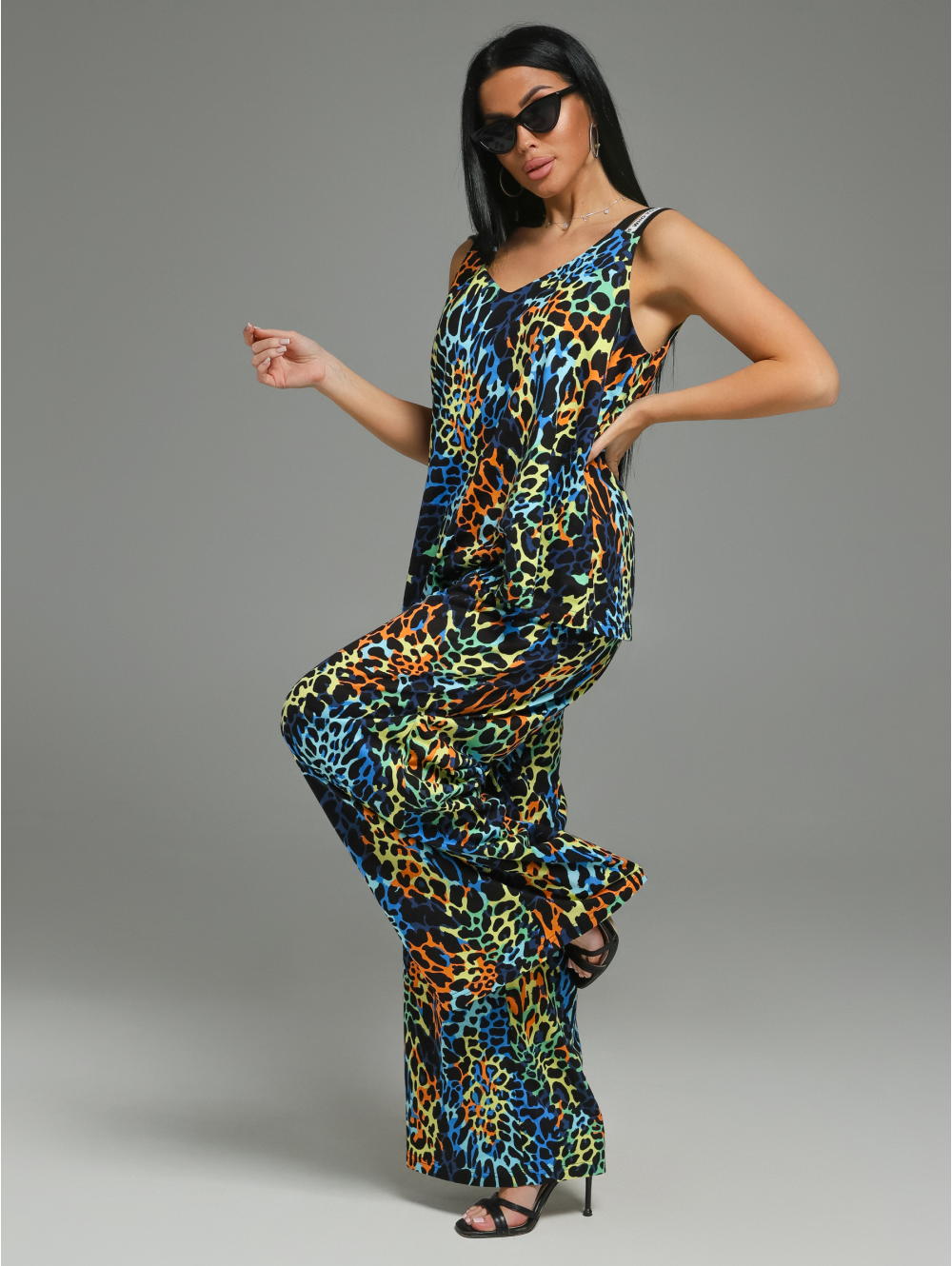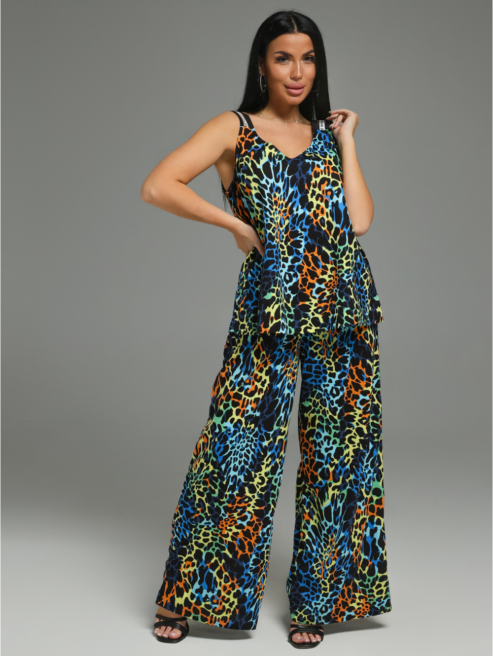 Костюм Аманда состоит из топа и брюк. Вырез горловины топа на полочке и спинке V-образный. Лямки топа выполнены из декоративной резинки. Брюки прямые от бедра с отрезным поясом.