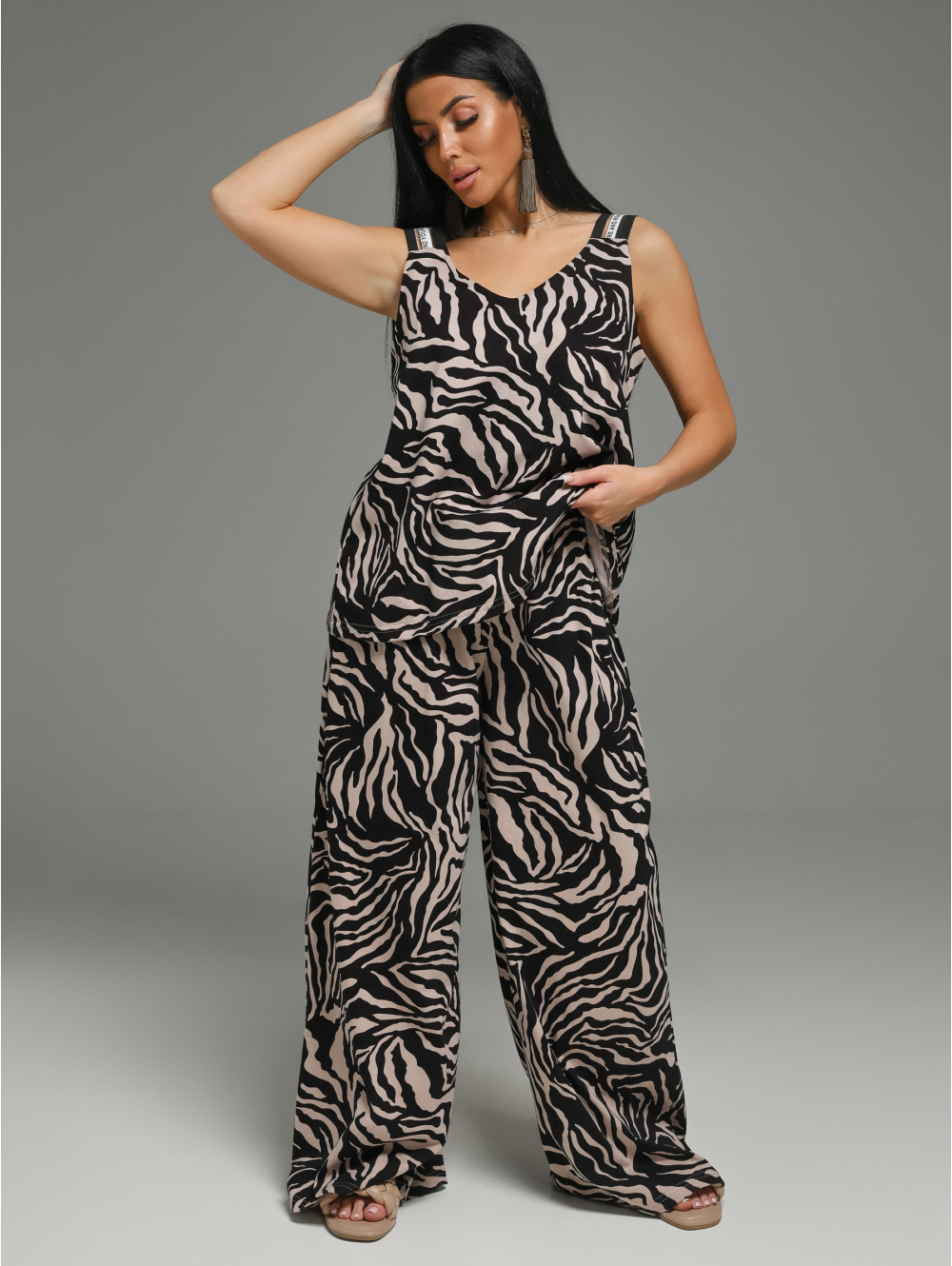 Костюм Аманда состоит из топа и брюк. Вырез горловины топа на полочке и спинке V-образный. Лямки топа выполнены из декоративной резинки. Брюки прямые от бедра с отрезным поясом.
