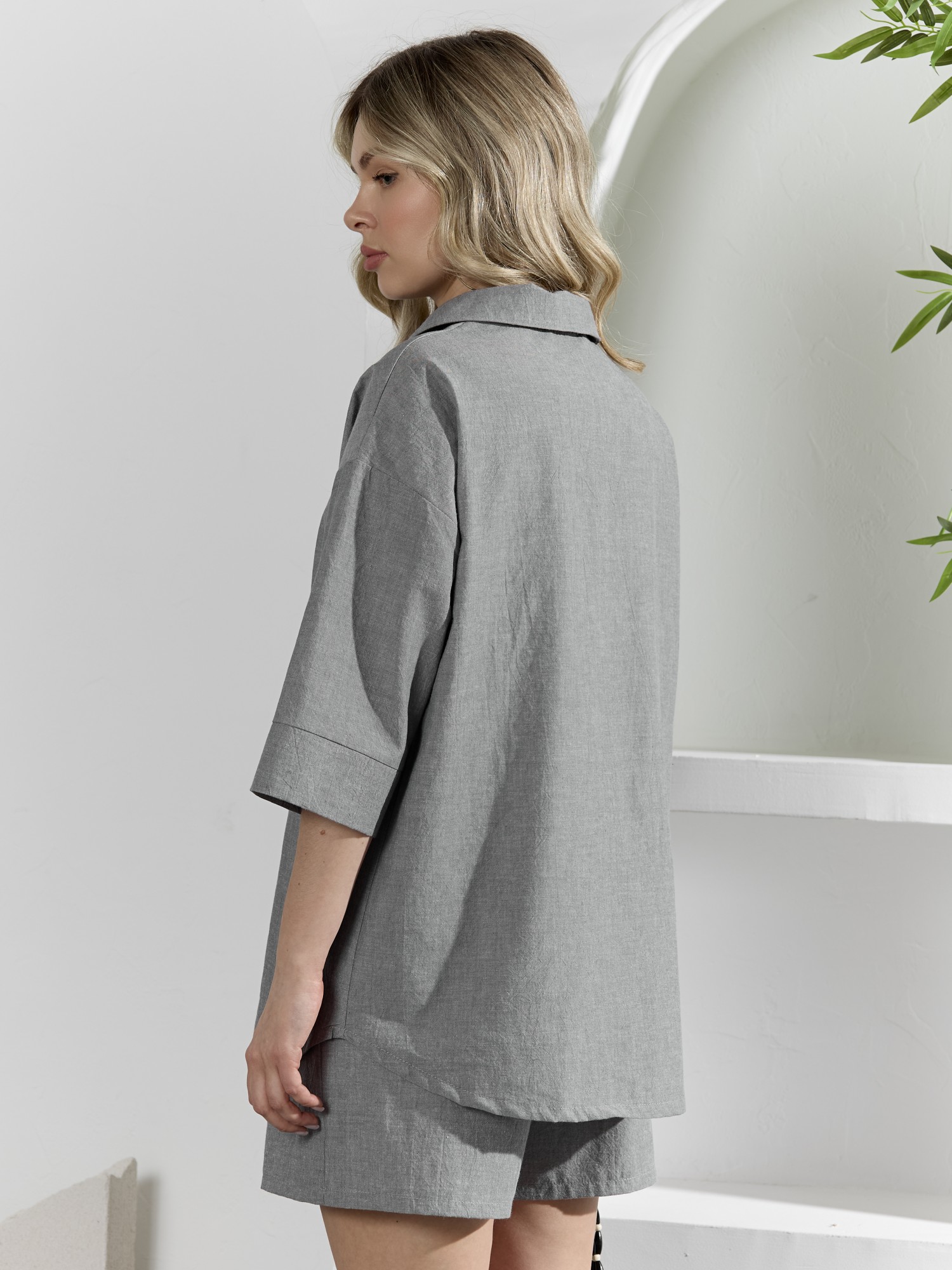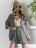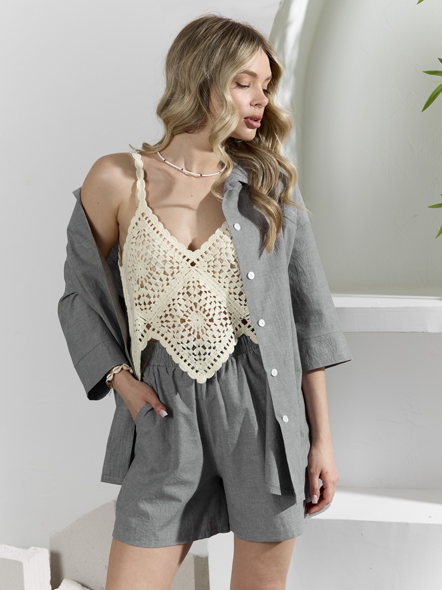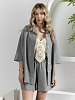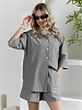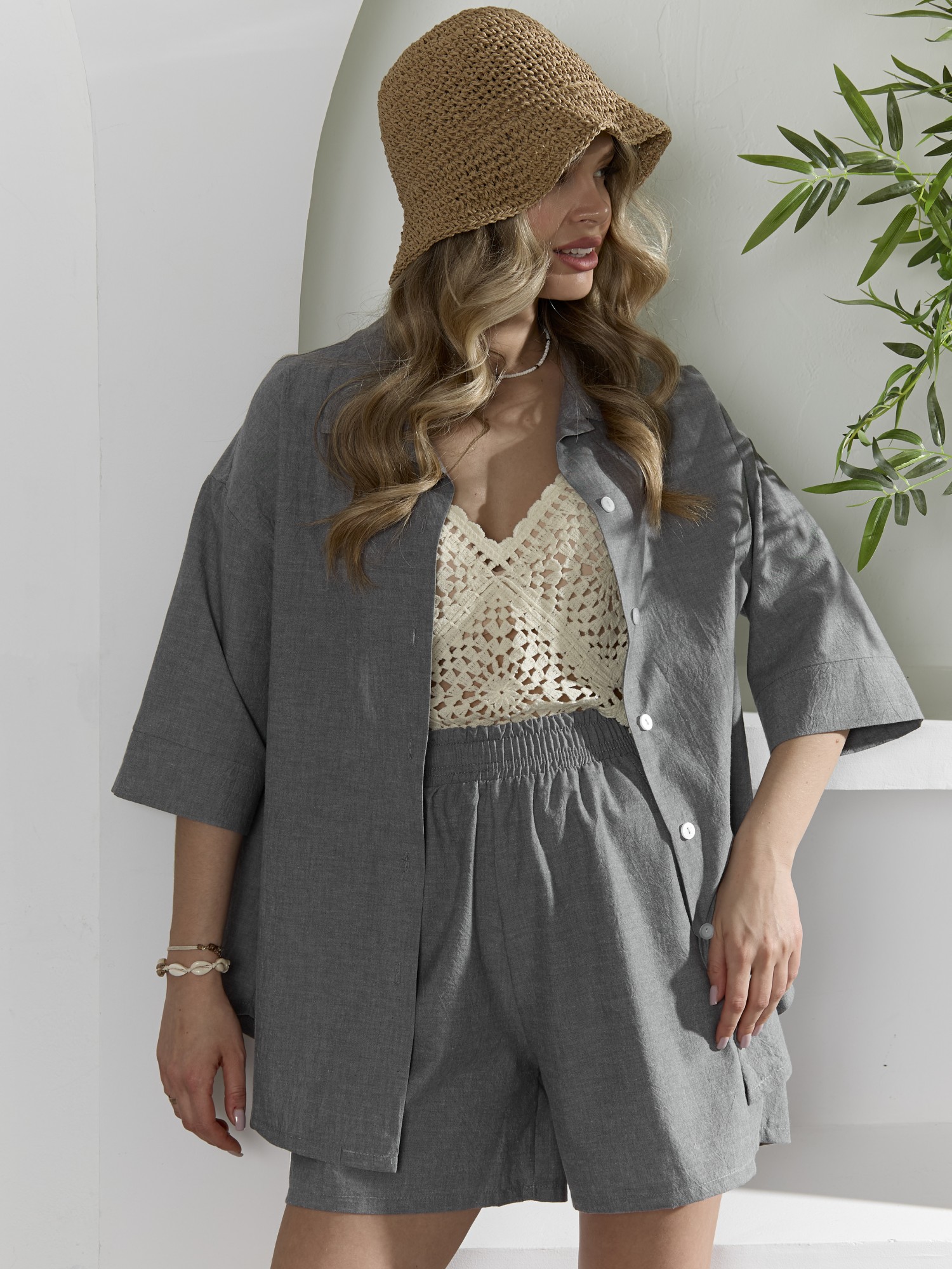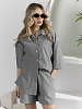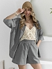 Костюм женский из гладкокрашеного фактурного полотна, состоящий их рубашки и шорт. Рубашка - с втачными рукавами длиной чуть ниже локтя, с приспущенным плечом, стояче-отложным воротником, фигурной линией низа и центральной бортовой застежкой на обметанные петли и пуговицы. Рукава - с притачными манжетами. Шорты - средней длины, на притачном поясе с эластичной тесьмой внутри, с карманами в боковых швах. Нижние срезы обработаны подгибкой.