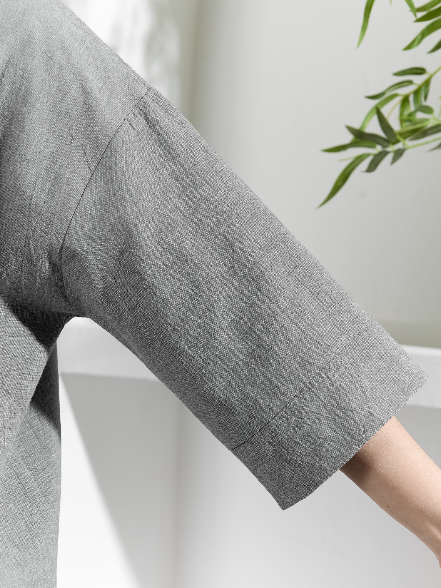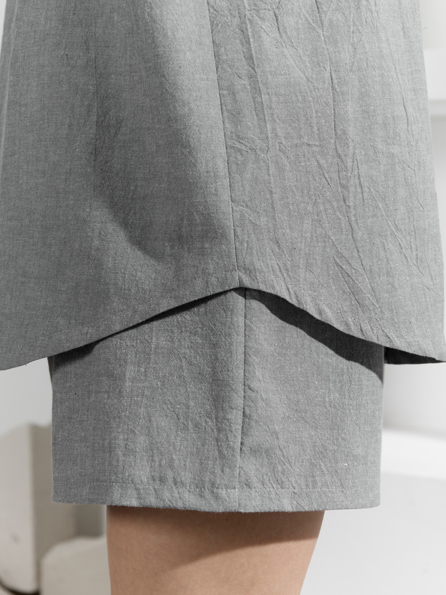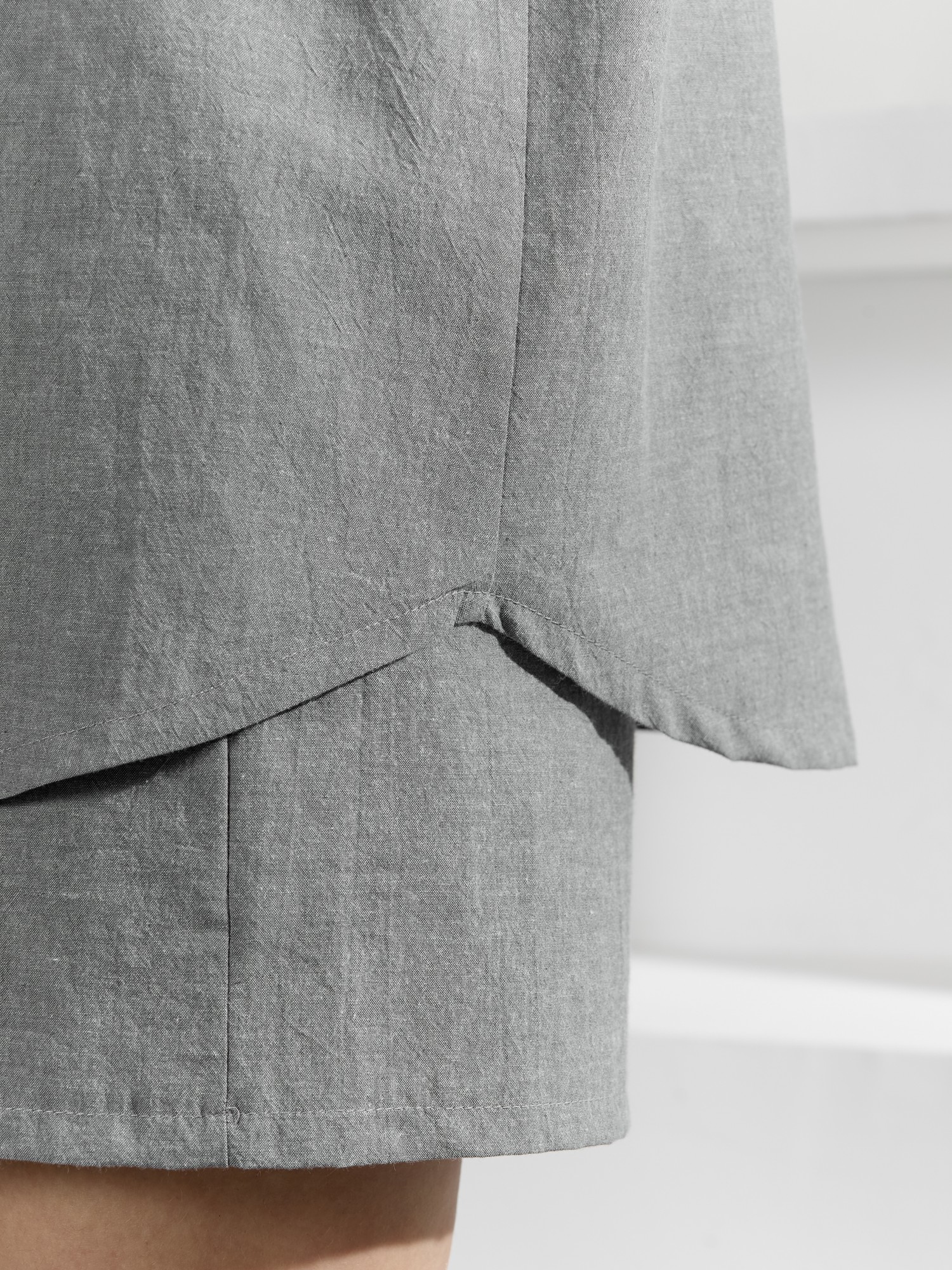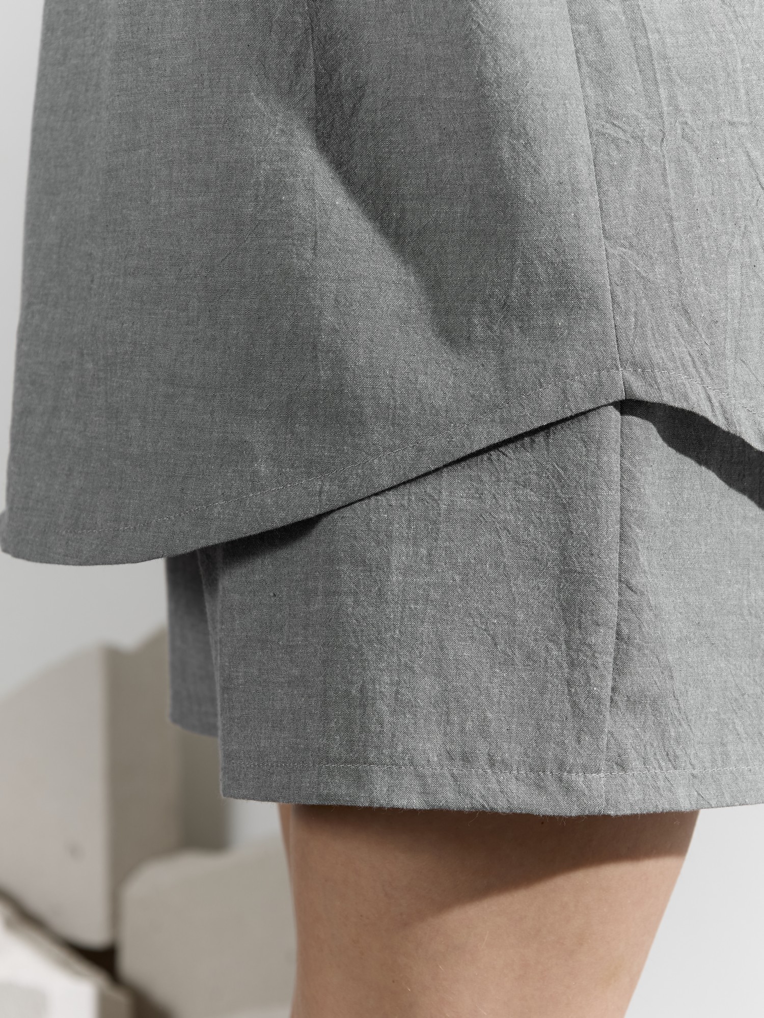 Костюм женский из гладкокрашеного фактурного полотна, состоящий их рубашки и шорт. Рубашка - с втачными рукавами длиной чуть ниже локтя, с приспущенным плечом, стояче-отложным воротником, фигурной линией низа и центральной бортовой застежкой на обметанные петли и пуговицы. Рукава - с притачными манжетами. Шорты - средней длины, на притачном поясе с эластичной тесьмой внутри, с карманами в боковых швах. Нижние срезы обработаны подгибкой.