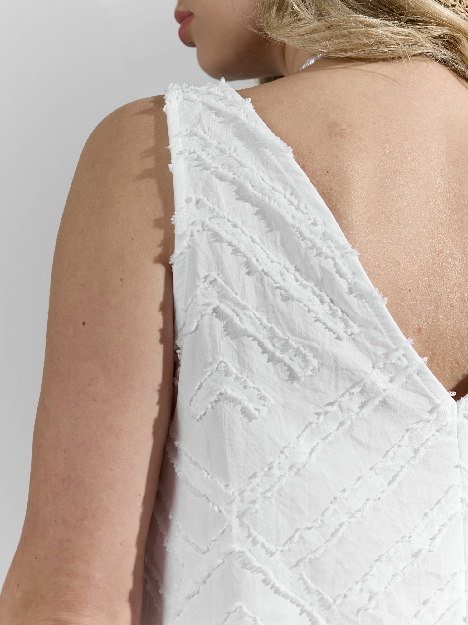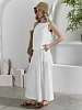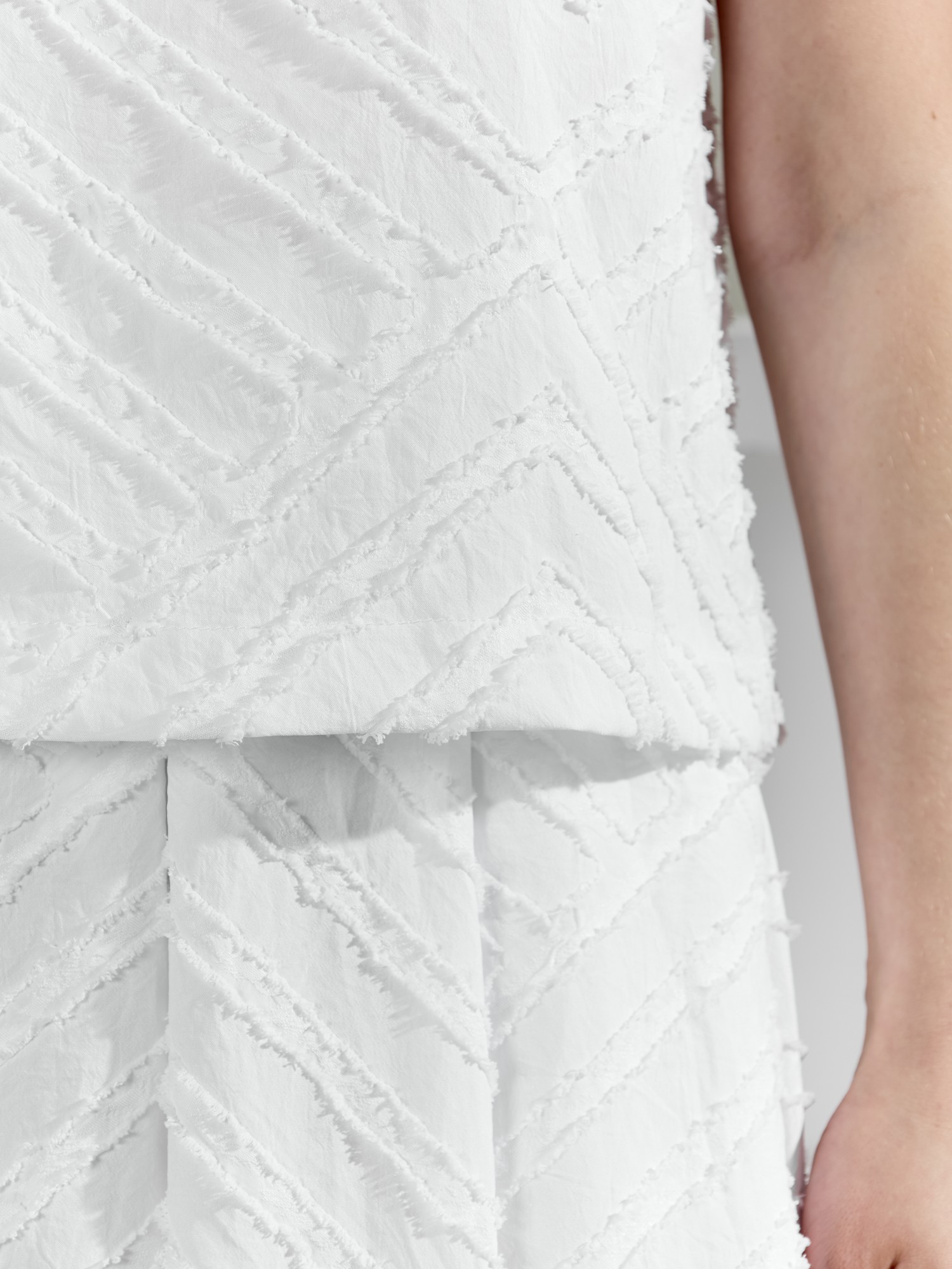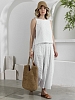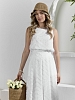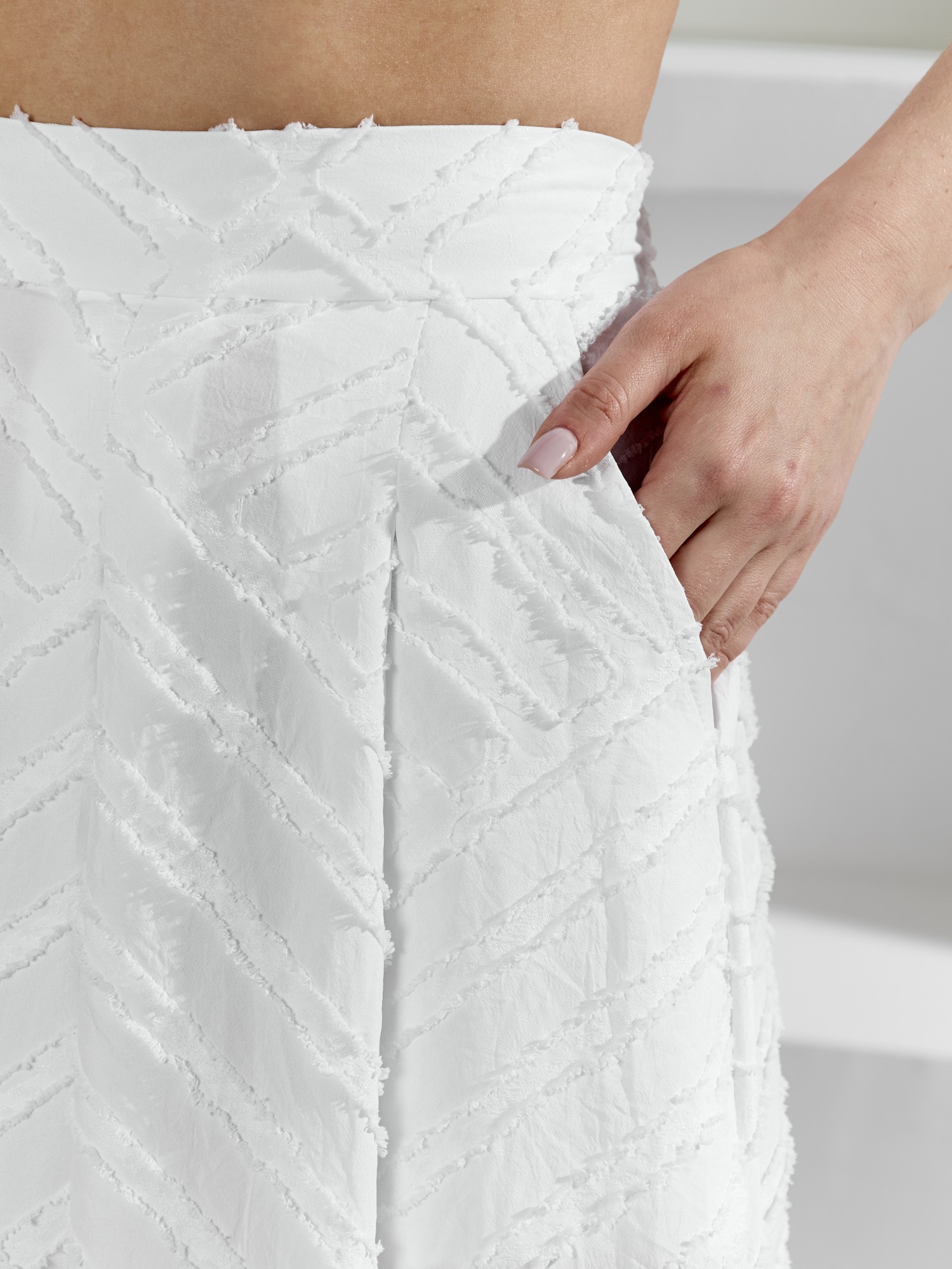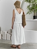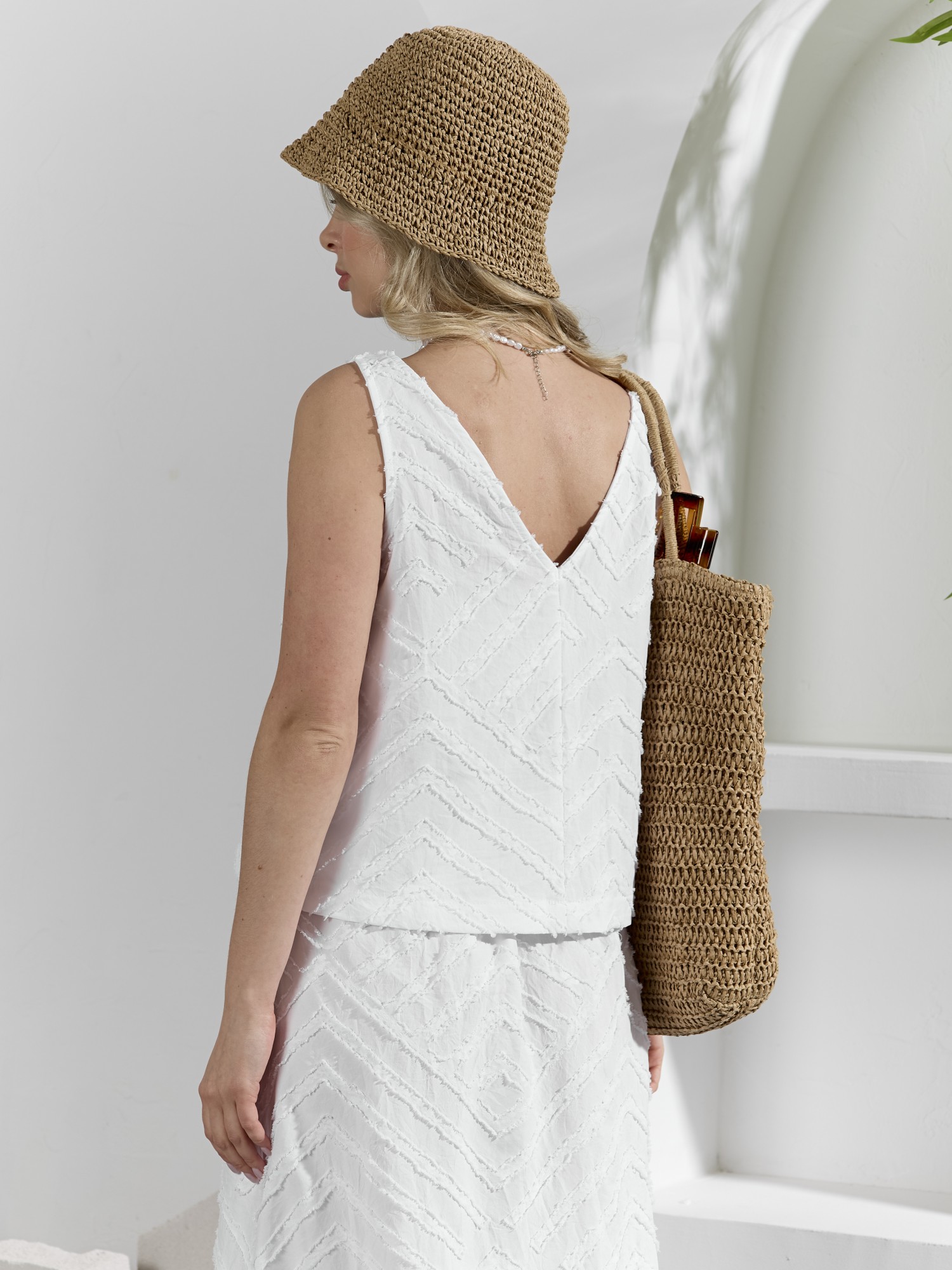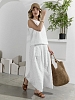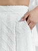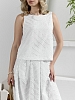 Костюм женский из фактурного полотна, свободного силуэта, состоящий из блузки-топ и юбки. Блузка-топ без застежки, с задним средним швом и фигурной горловиной. Юбка с боковыми карманами, на притачном поясе с отстроченной эластичной тесьмой. На переднем полотнище юбки заложены складки.