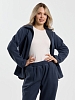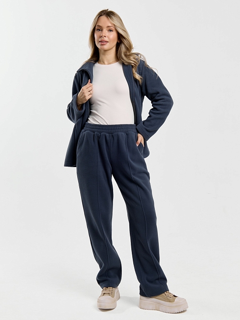 Костюм молодежный из гладкокрашенного трикотажного полотна «флис», Толстовка - полуприлегающего силуэта, с длинными втачными рукавами, воротником «стойка», карманами в рельефных швах, центральной бортовой застежкой на тесьму «молния». Брюки длинные, полуприлегающего силуэта, на притачном поясе с эластичной тесьмой внутри и карманами в боковых швах. Передние половины застрочены поцентральным линиям, низ брюк обработан подгибкой с вложением эластичной тесьмы и регулируется по ширине с помощью фиксаторов.