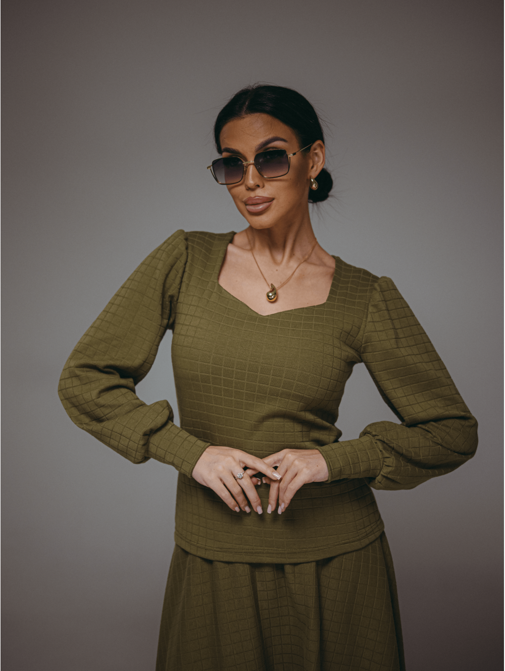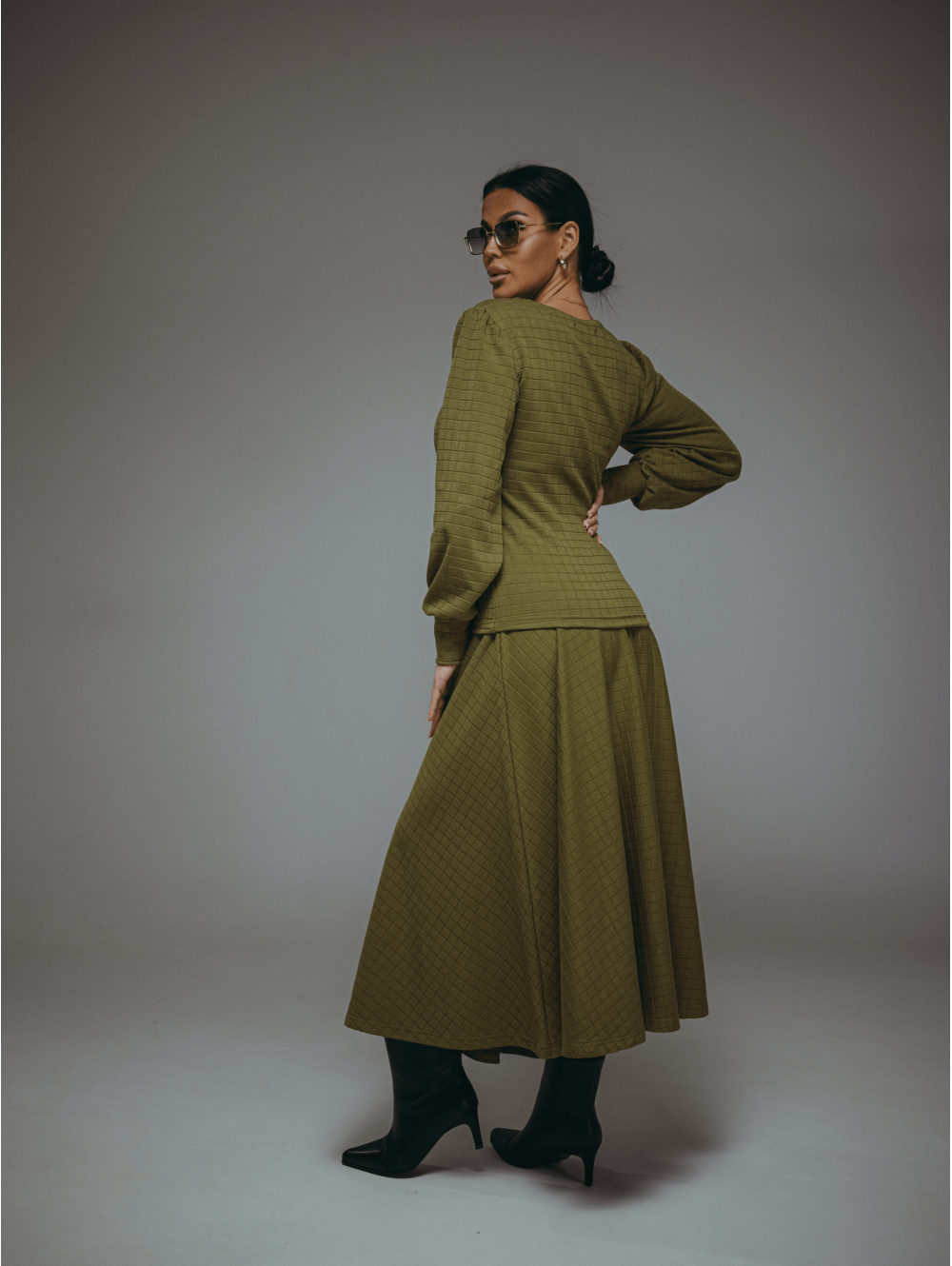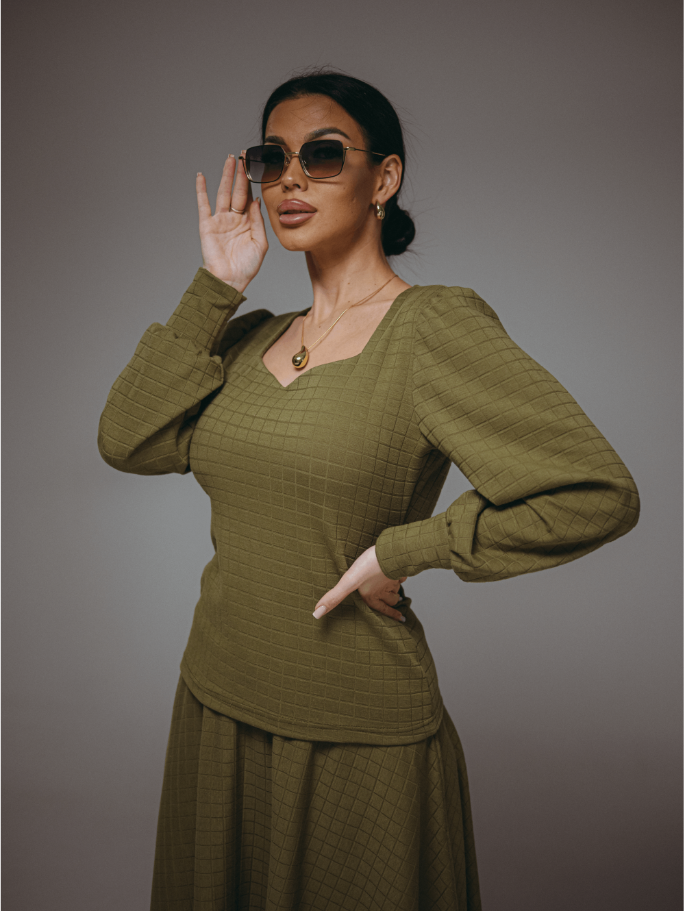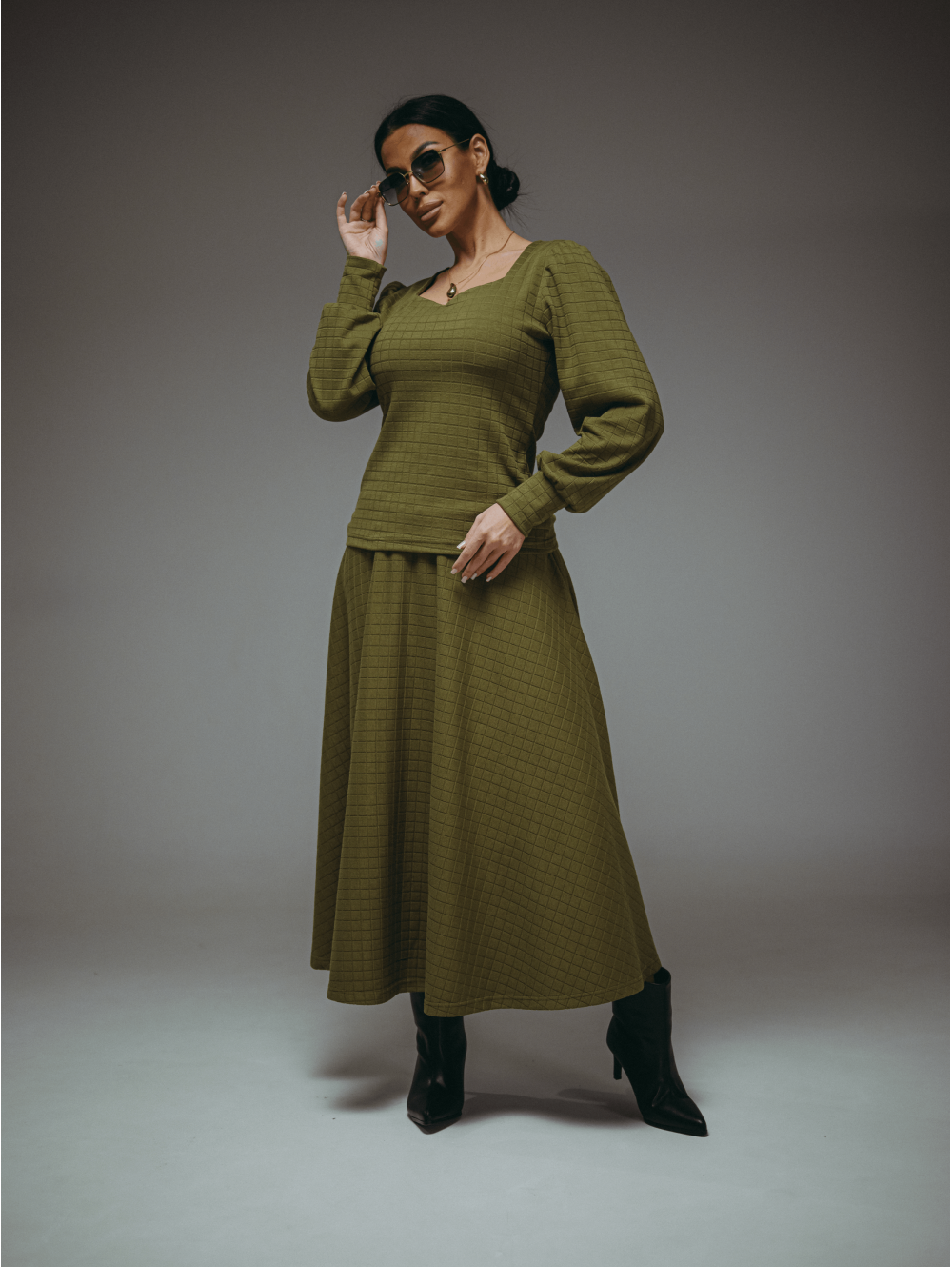 Костюм женский Беатрис состоит из лонгслива и юбки. Лонгслив прилегающего силуэта длиной до бёдер с объёмными рукавами. Юбка-полусолнце длиной до середины икры, на поясе.