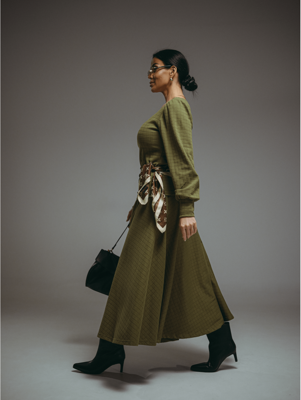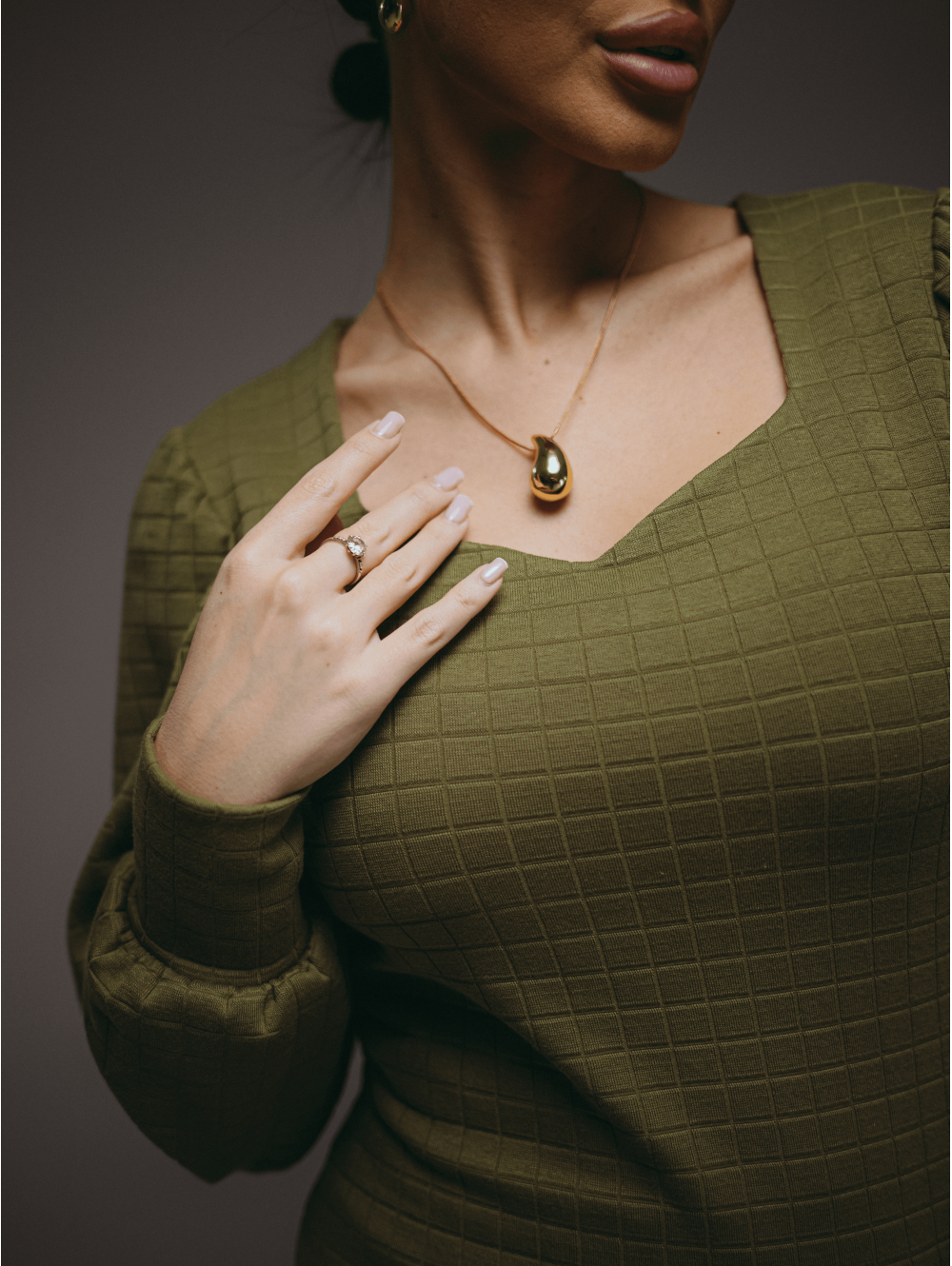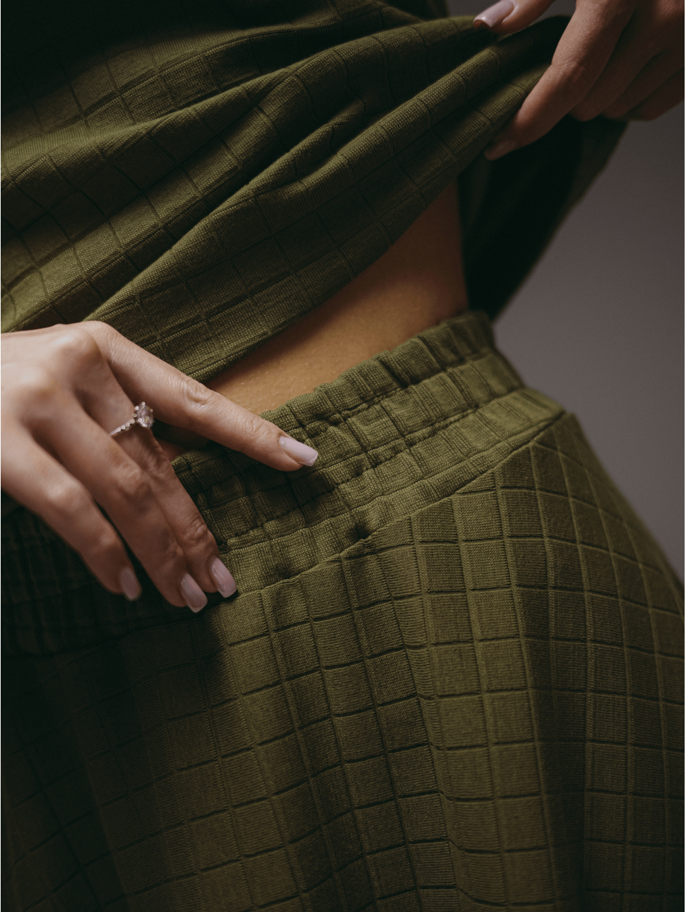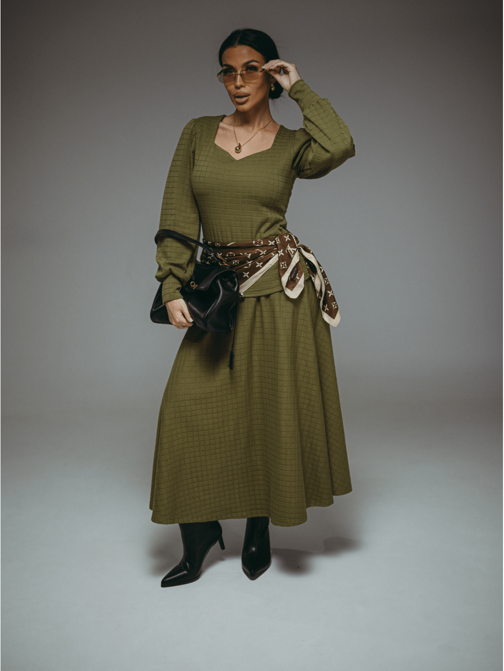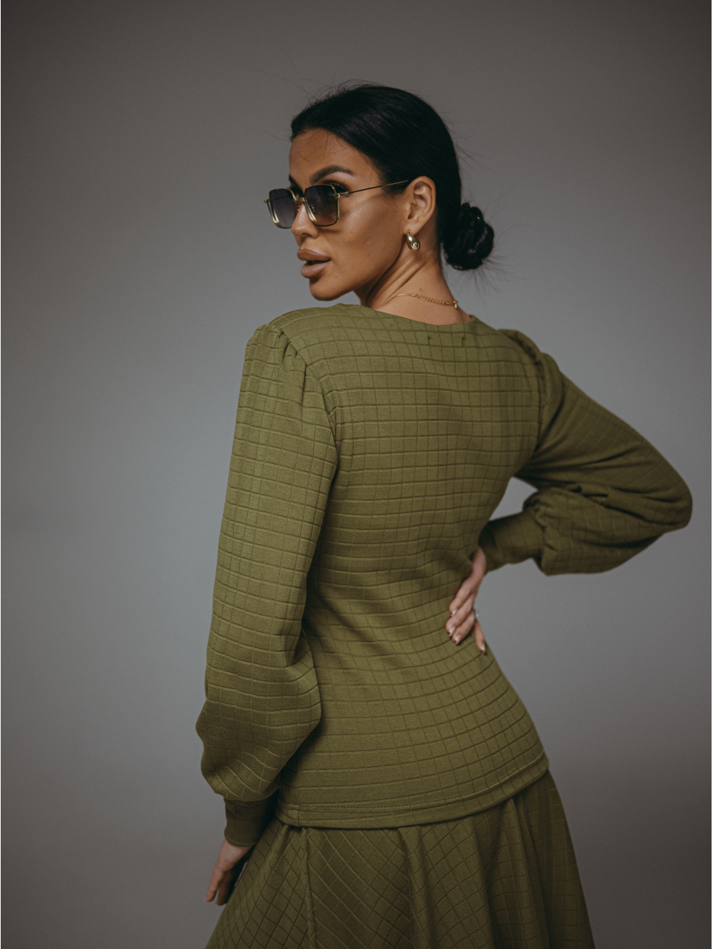Костюм женский Беатрис состоит из лонгслива и юбки. Лонгслив прилегающего силуэта длиной до бёдер с объёмными рукавами. Юбка-полусолнце длиной до середины икры, на поясе.