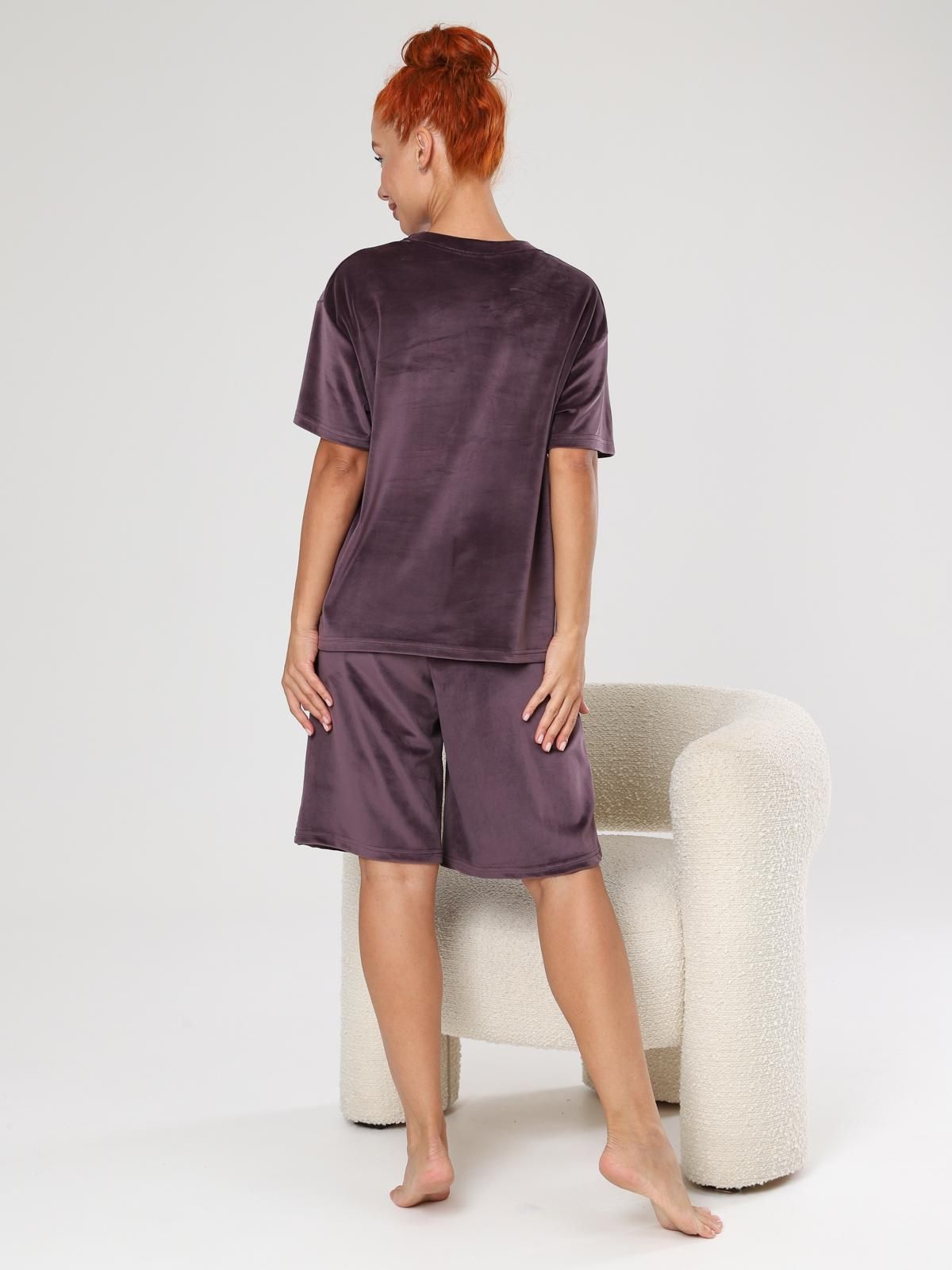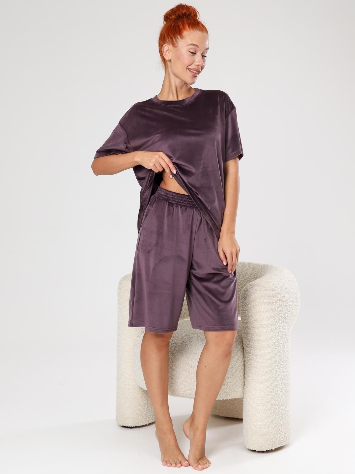 Женский велюровый костюм с шортами. Костюм состоит из свободной футболки и шорт, выполненных из мягкого велюра. Этот материал приятен на ощупь, хорошо сохраняет тепло и подходит для домашнего отдыха или сна.