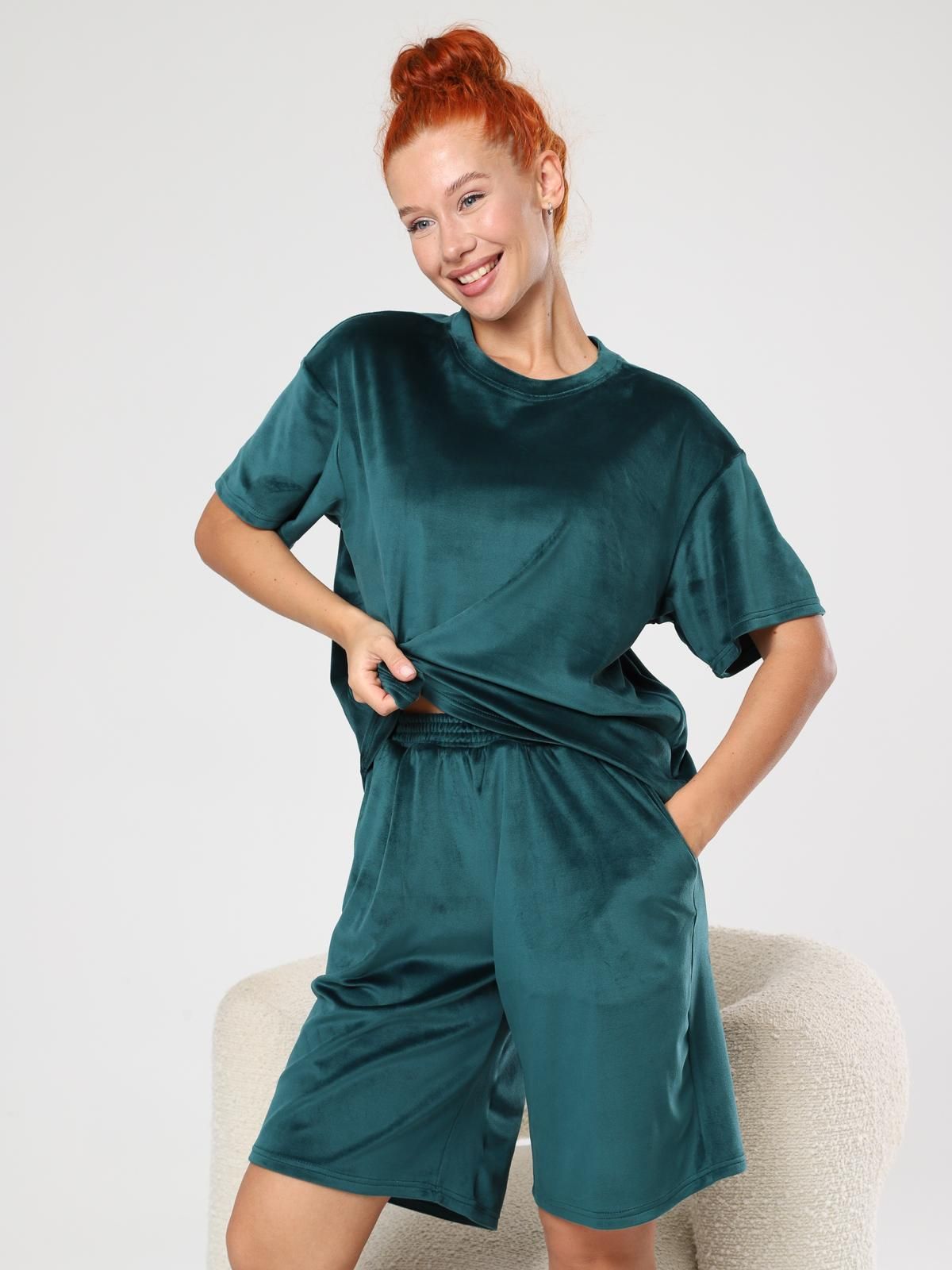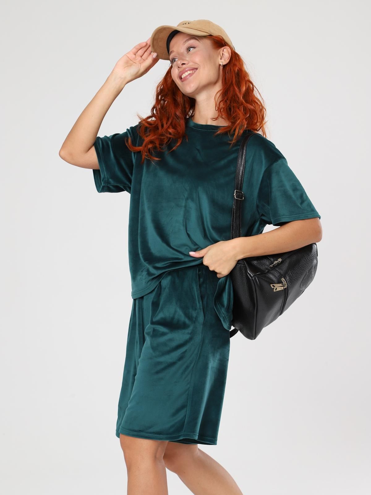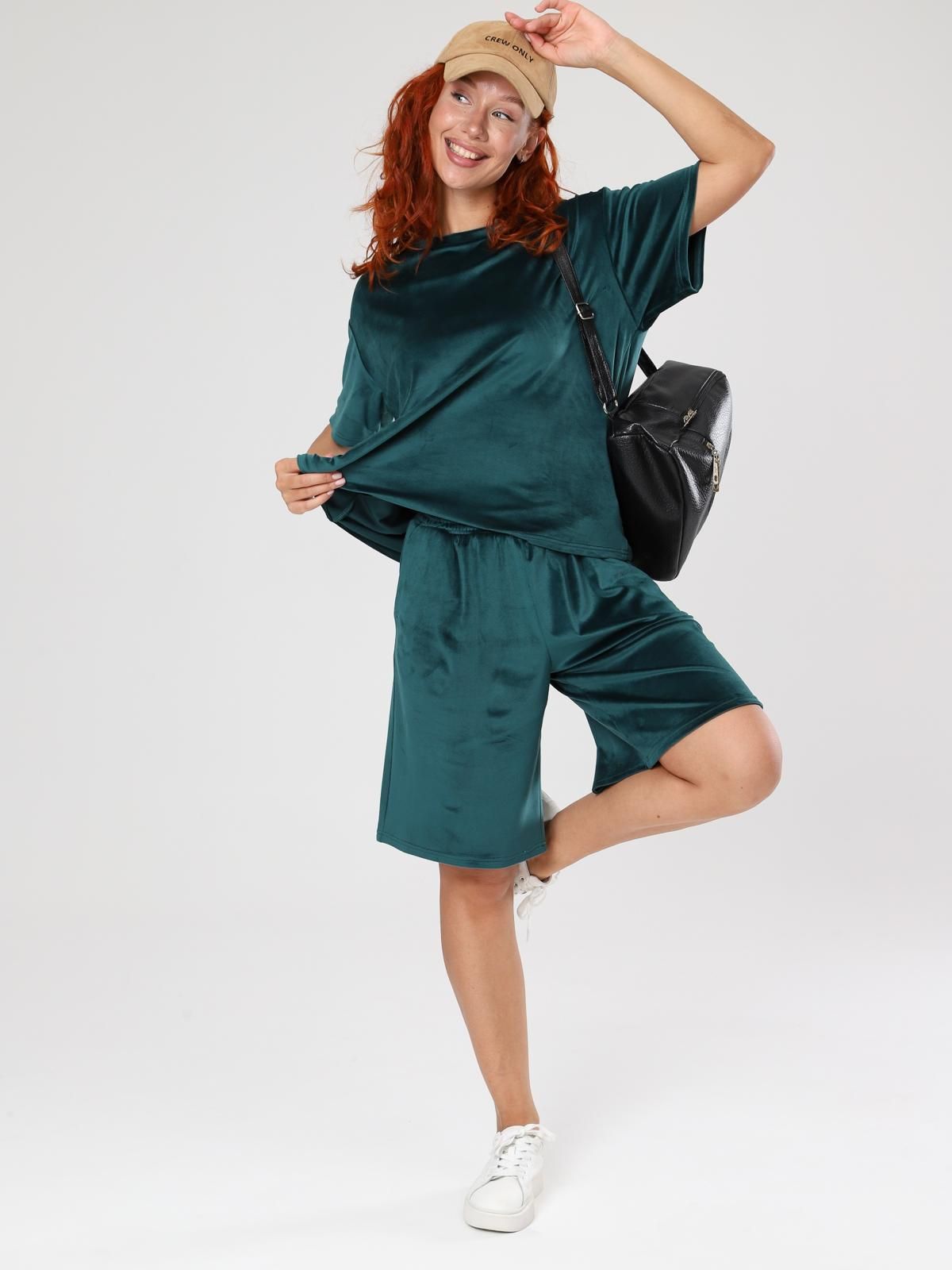 Женский велюровый костюм с шортами. Костюм состоит из свободной футболки и шорт, выполненных из мягкого велюра. Этот материал приятен на ощупь, хорошо сохраняет тепло и подходит для домашнего отдыха или сна.