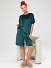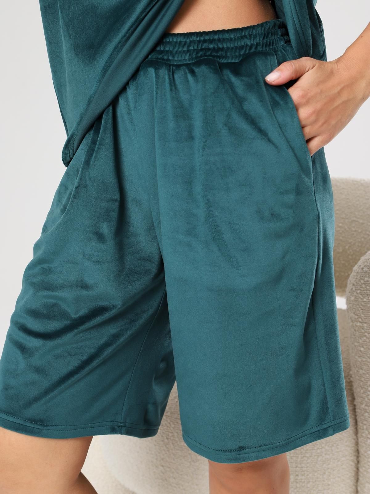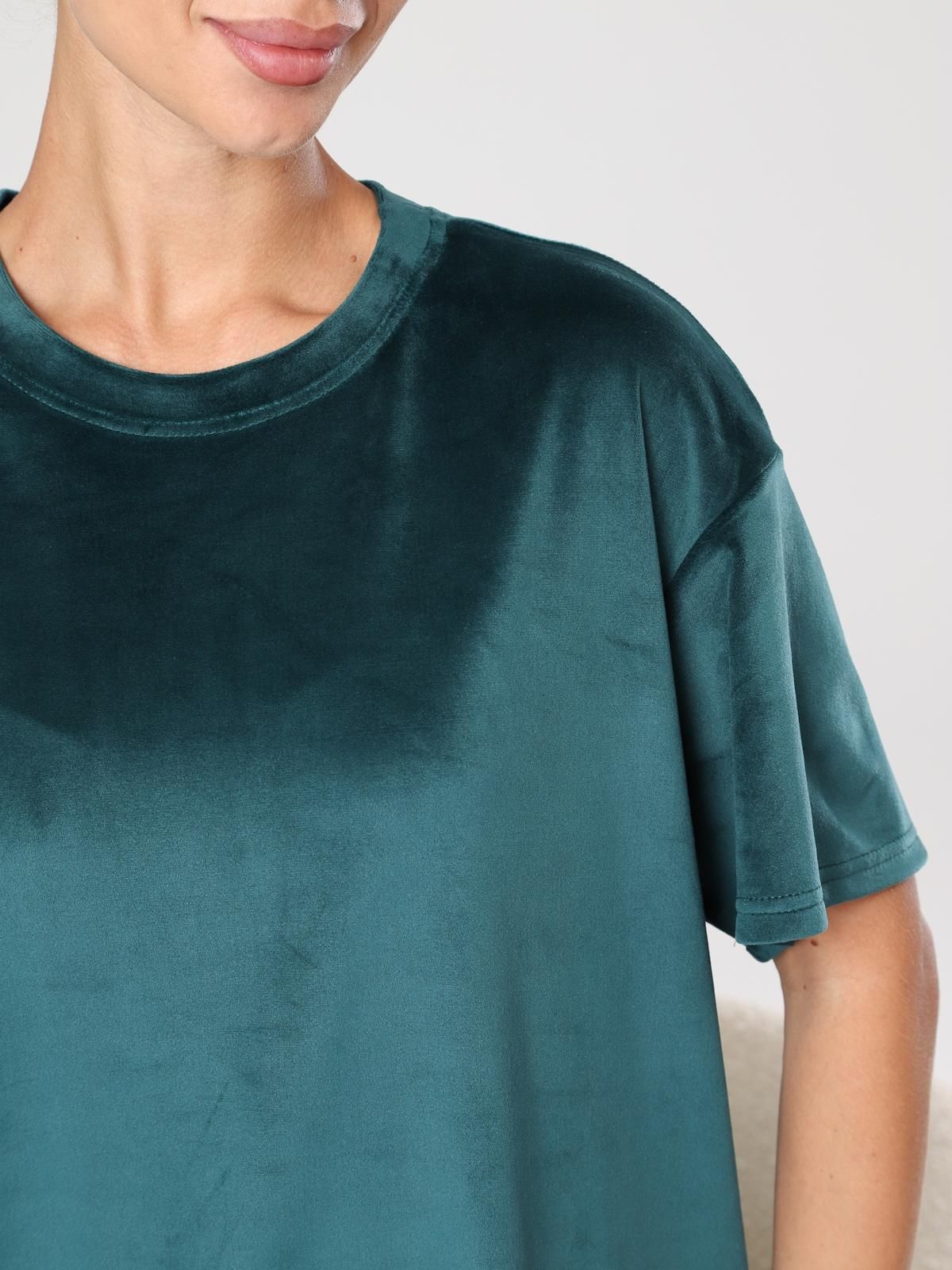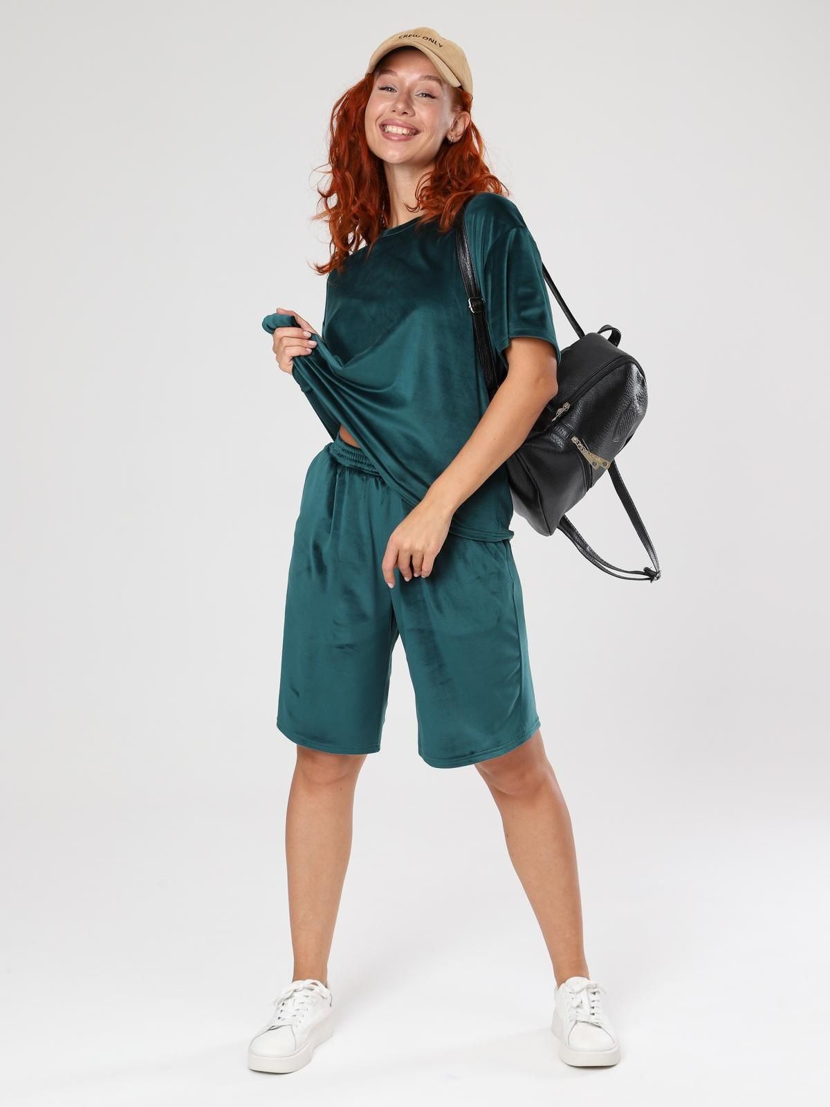 Женский велюровый костюм с шортами. Костюм состоит из свободной футболки и шорт, выполненных из мягкого велюра. Этот материал приятен на ощупь, хорошо сохраняет тепло и подходит для домашнего отдыха или сна.