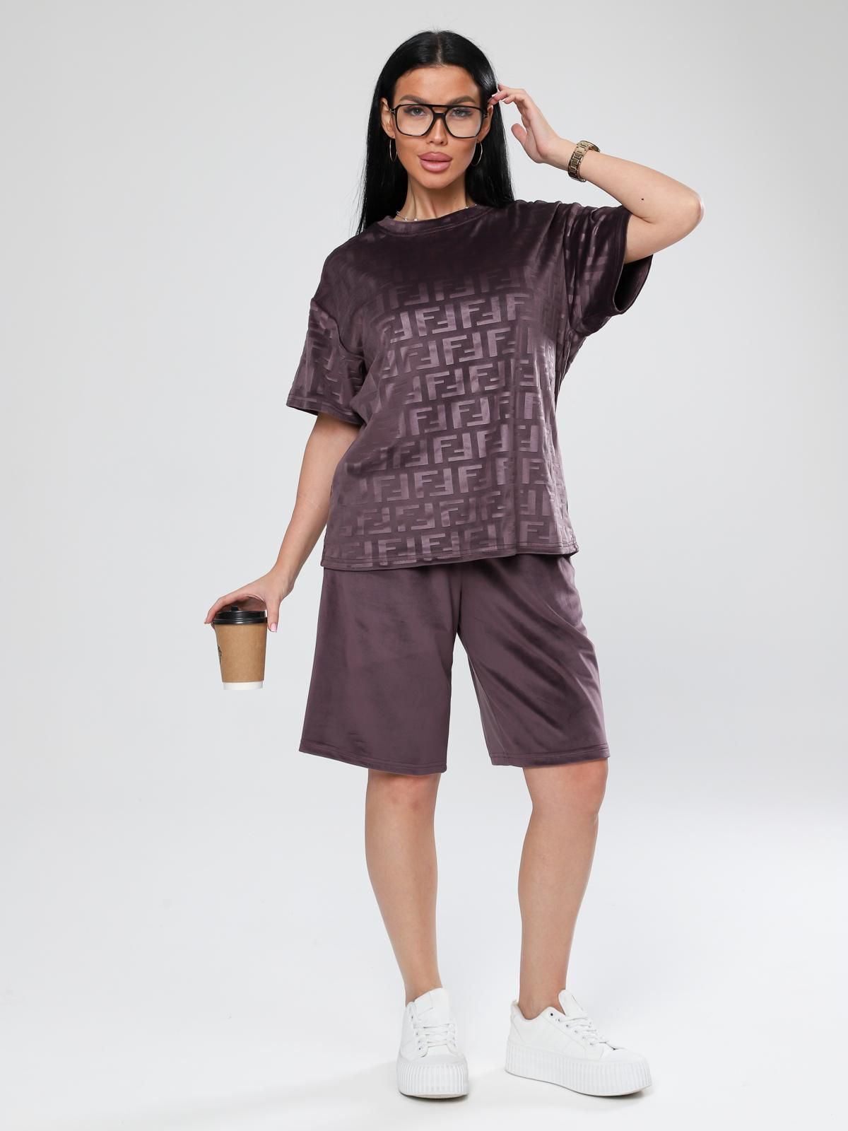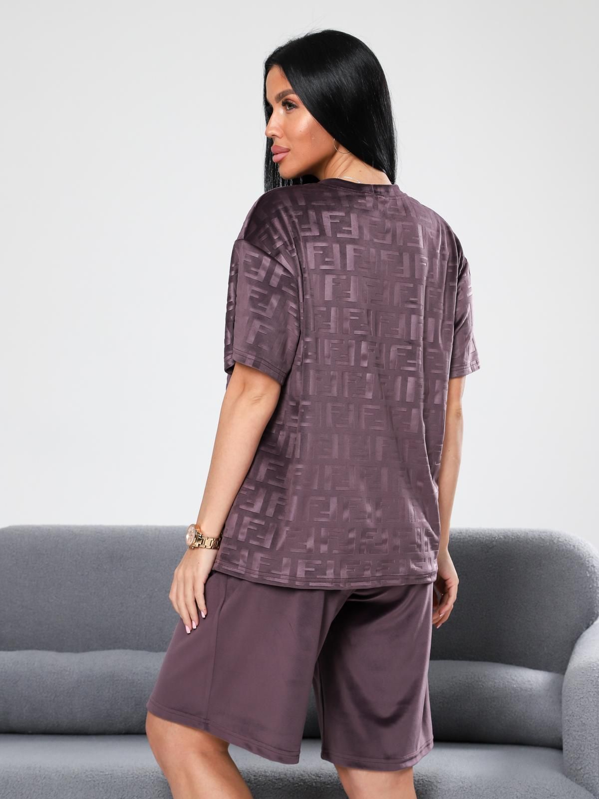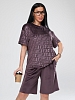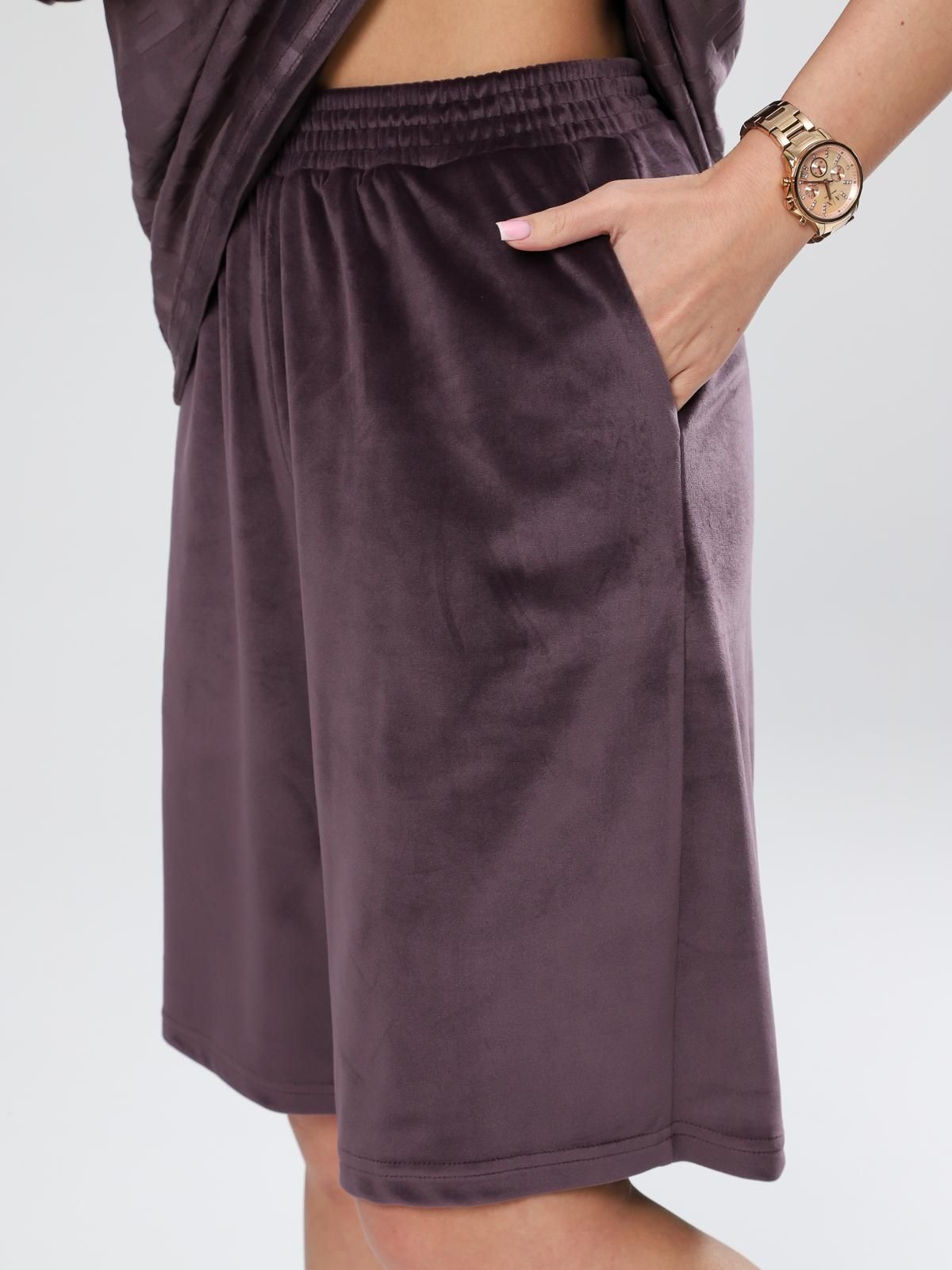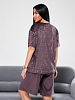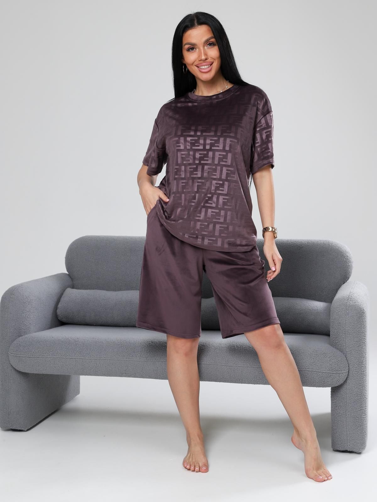 Женский велюровый костюм с шортами. Костюм состоит из свободной футболки и шорт, выполненных из мягкого велюра. Этот материал приятен на ощупь, хорошо сохраняет тепло и подходит для домашнего отдыха или сна.