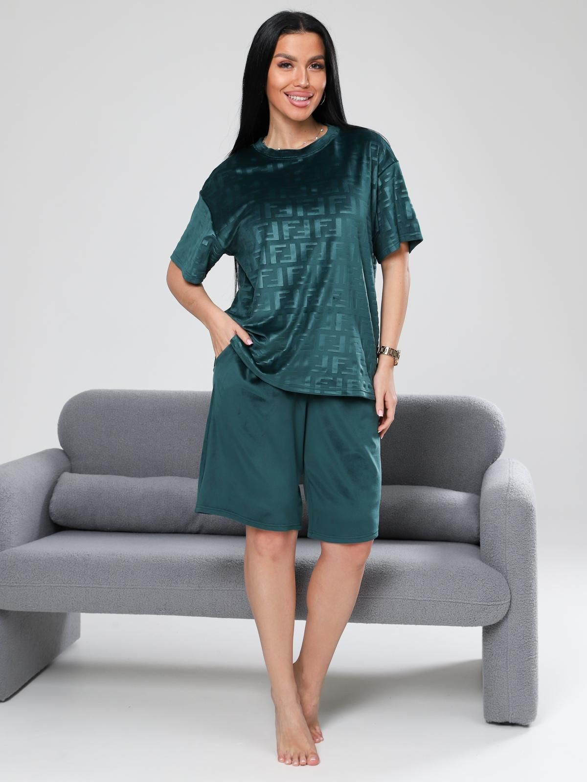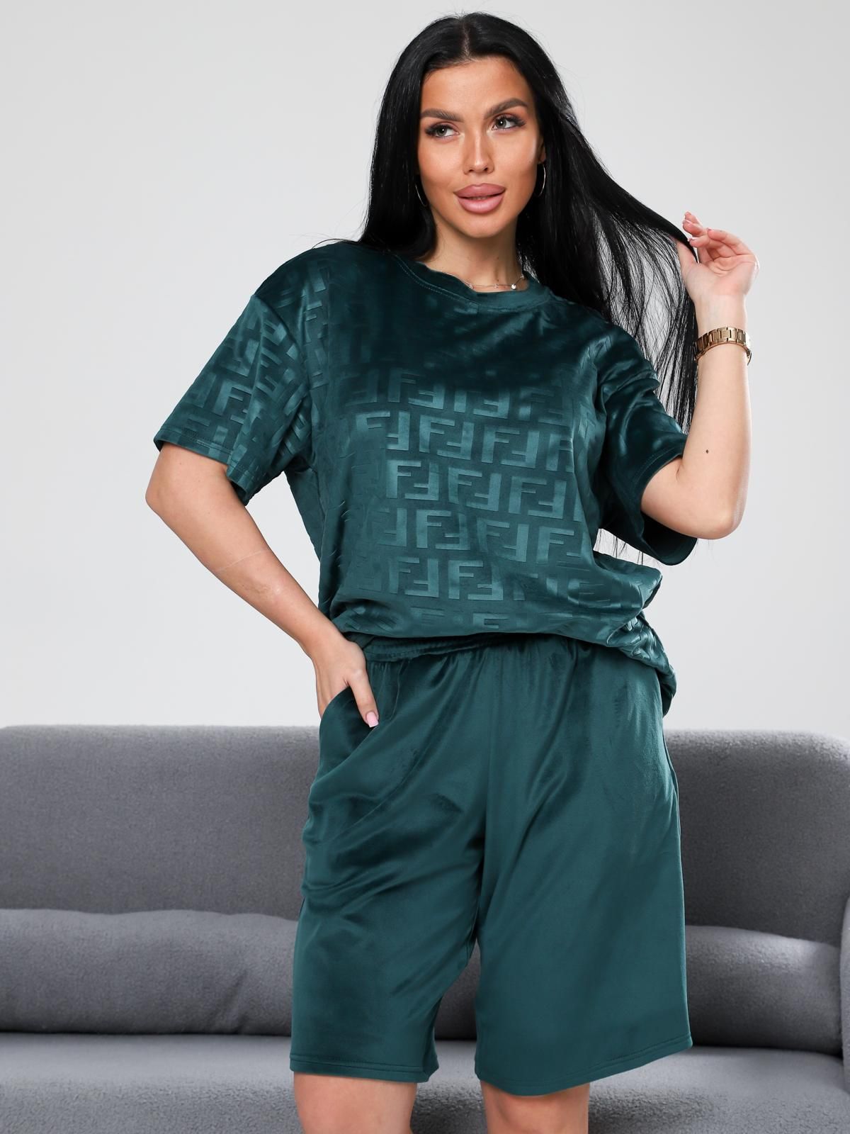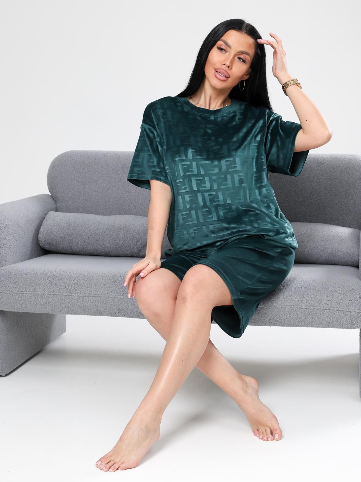 Женский велюровый костюм с шортами. Костюм состоит из свободной футболки и шорт, выполненных из мягкого велюра. Этот материал приятен на ощупь, хорошо сохраняет тепло и подходит для домашнего отдыха или сна.