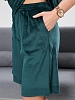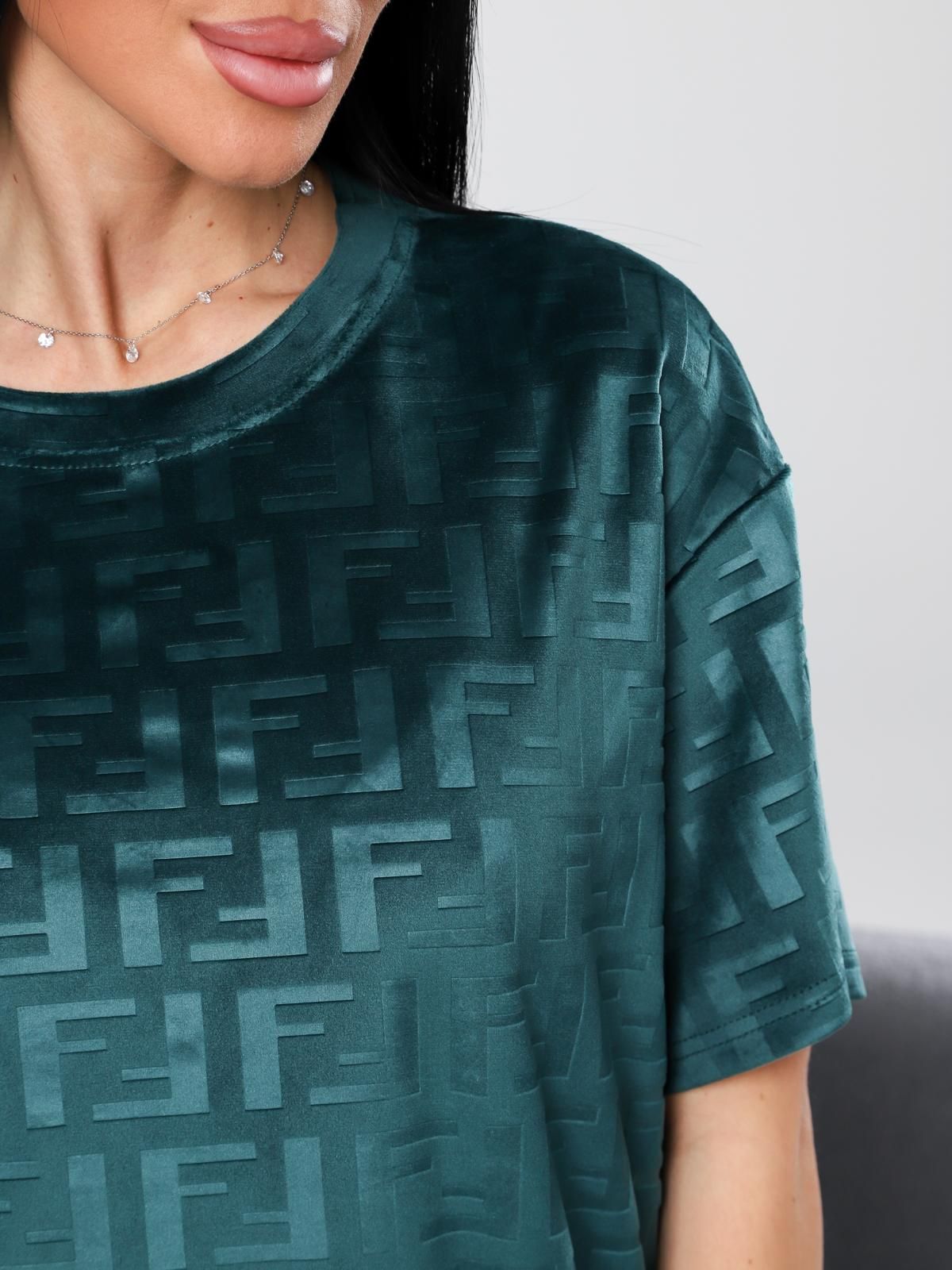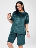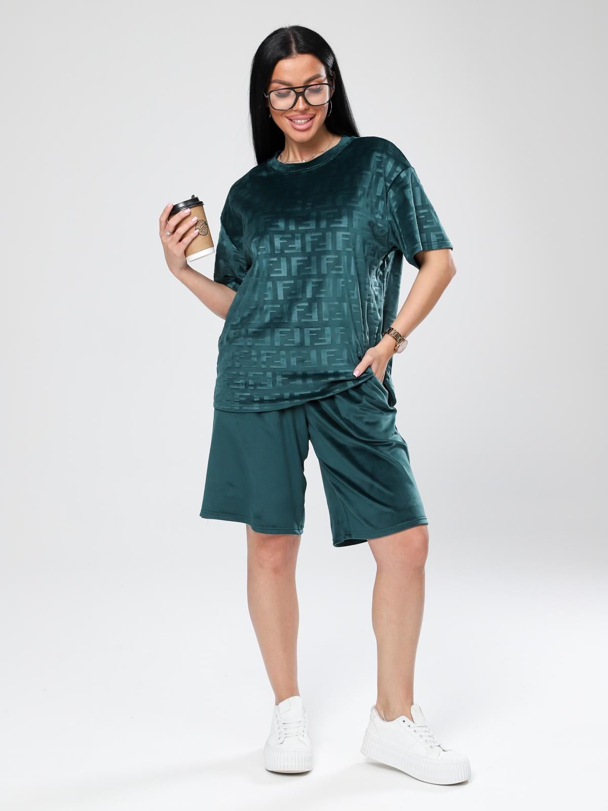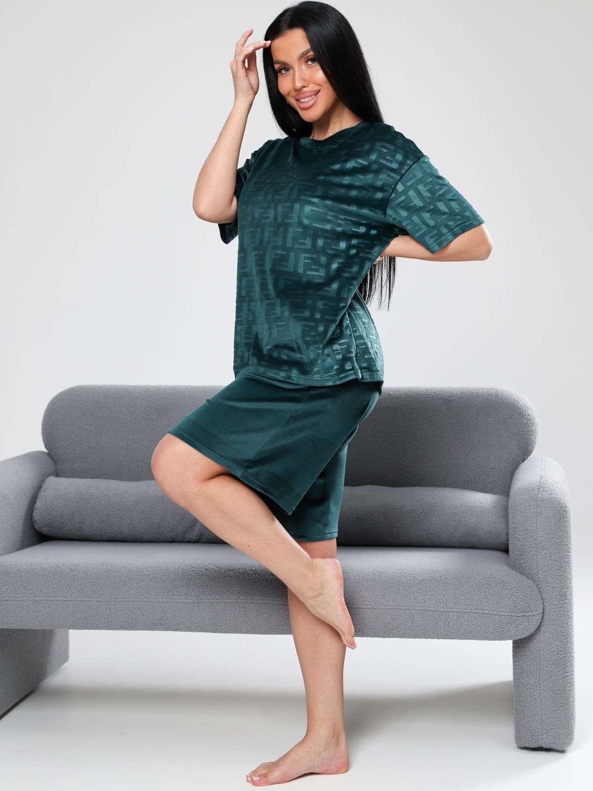 Женский велюровый костюм с шортами. Костюм состоит из свободной футболки и шорт, выполненных из мягкого велюра. Этот материал приятен на ощупь, хорошо сохраняет тепло и подходит для домашнего отдыха или сна.