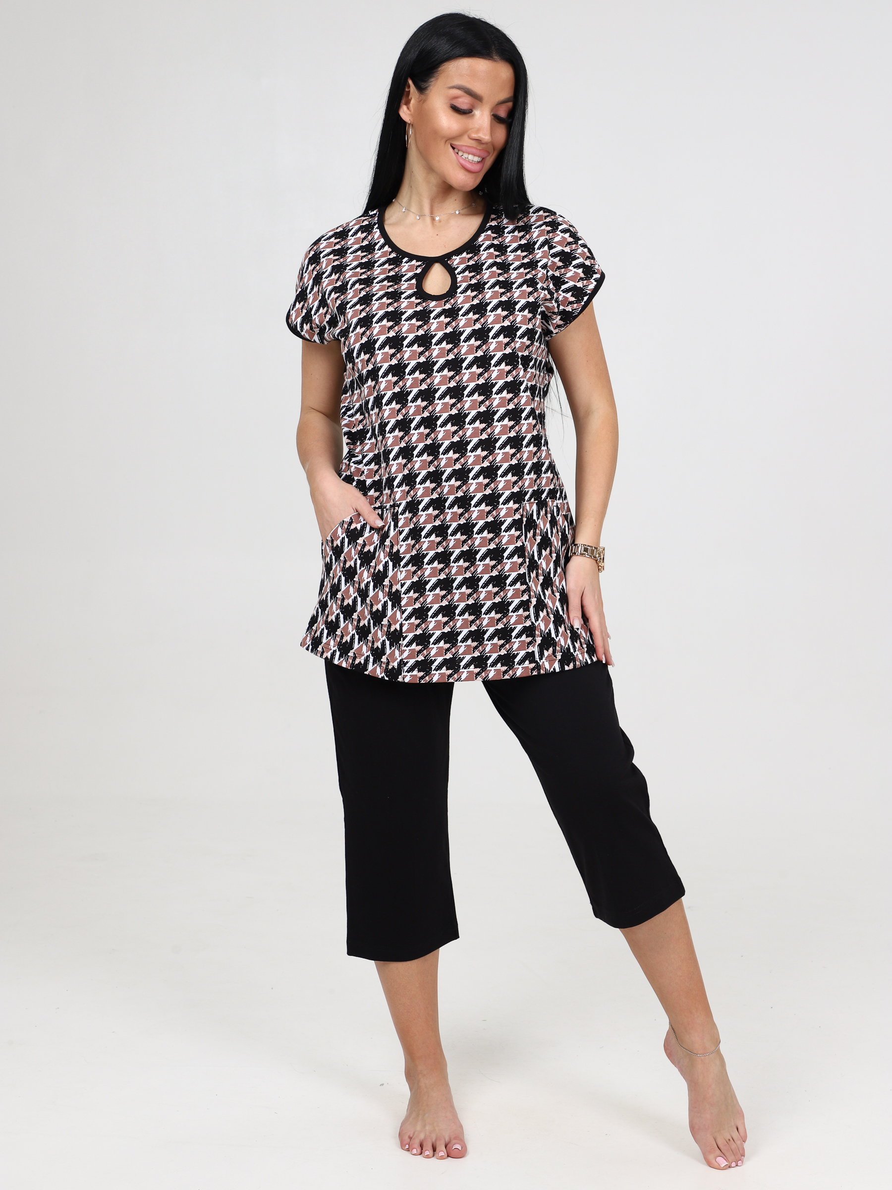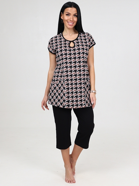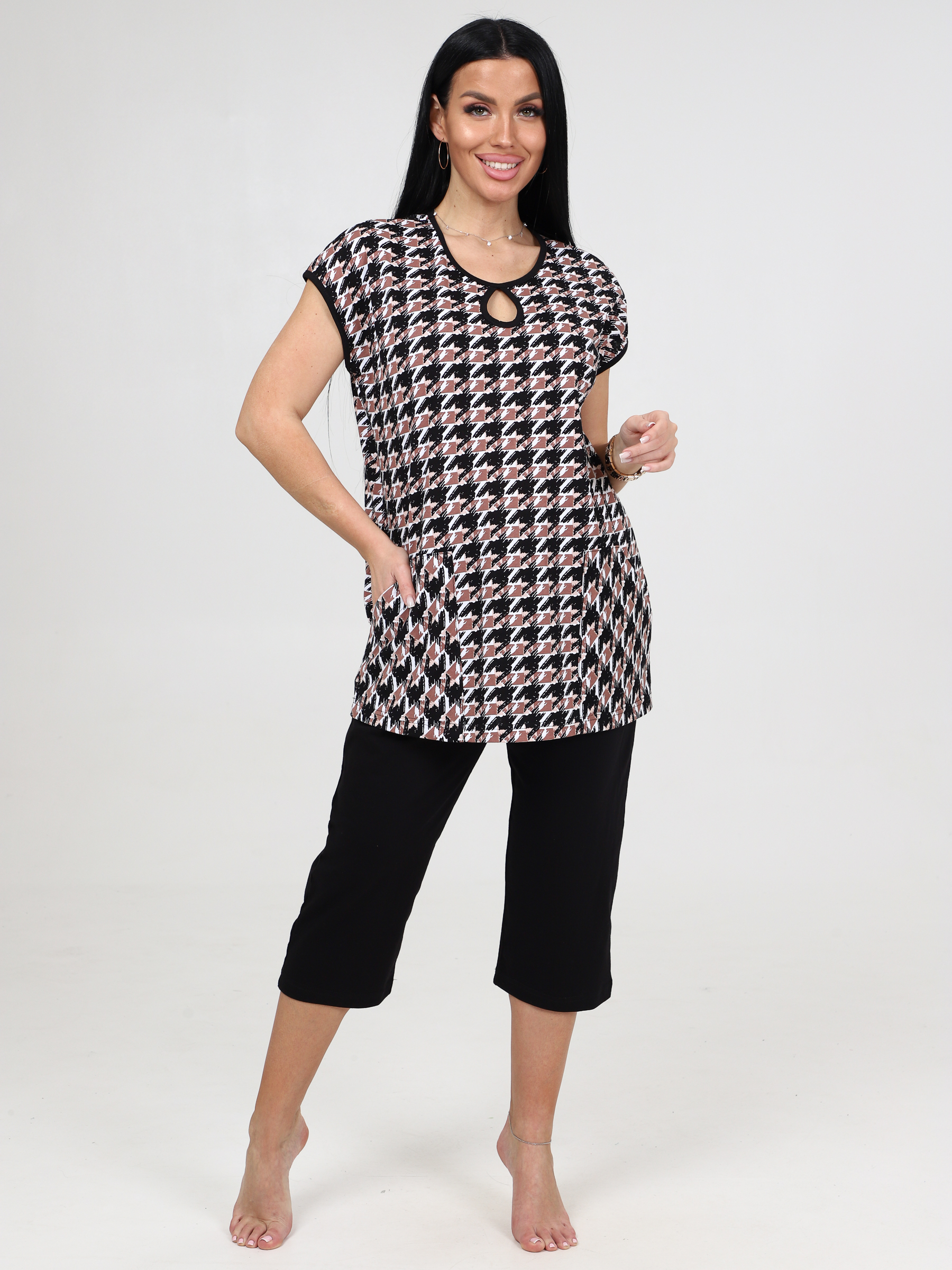 Женский костюм с бриджами из кулирки — это комплект из футболки или туники и бриджей, выполненный из трикотажного полотна из 100% хлопка. Такая одежда подходит для дома, отдыха, прогулок или повседневной носки. Кулирка хорошо пропускает воздух, не вызывает аллергии и сохраняет форму после стирок.