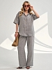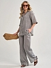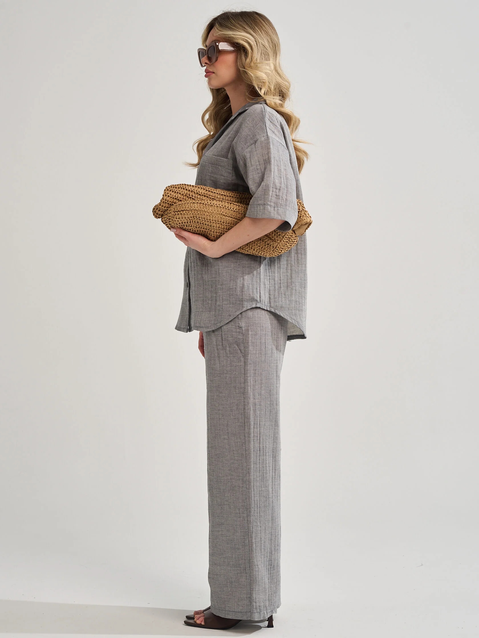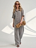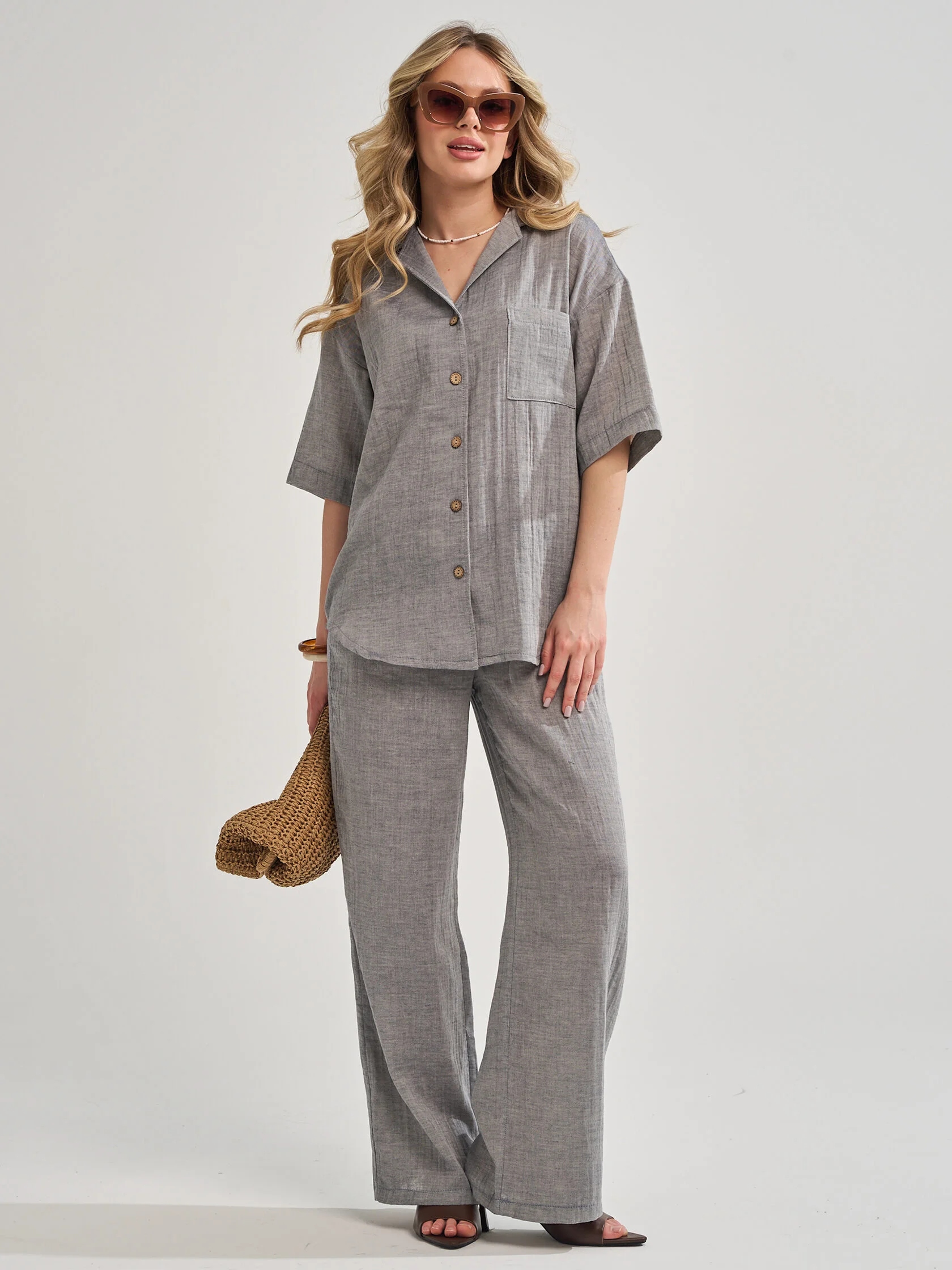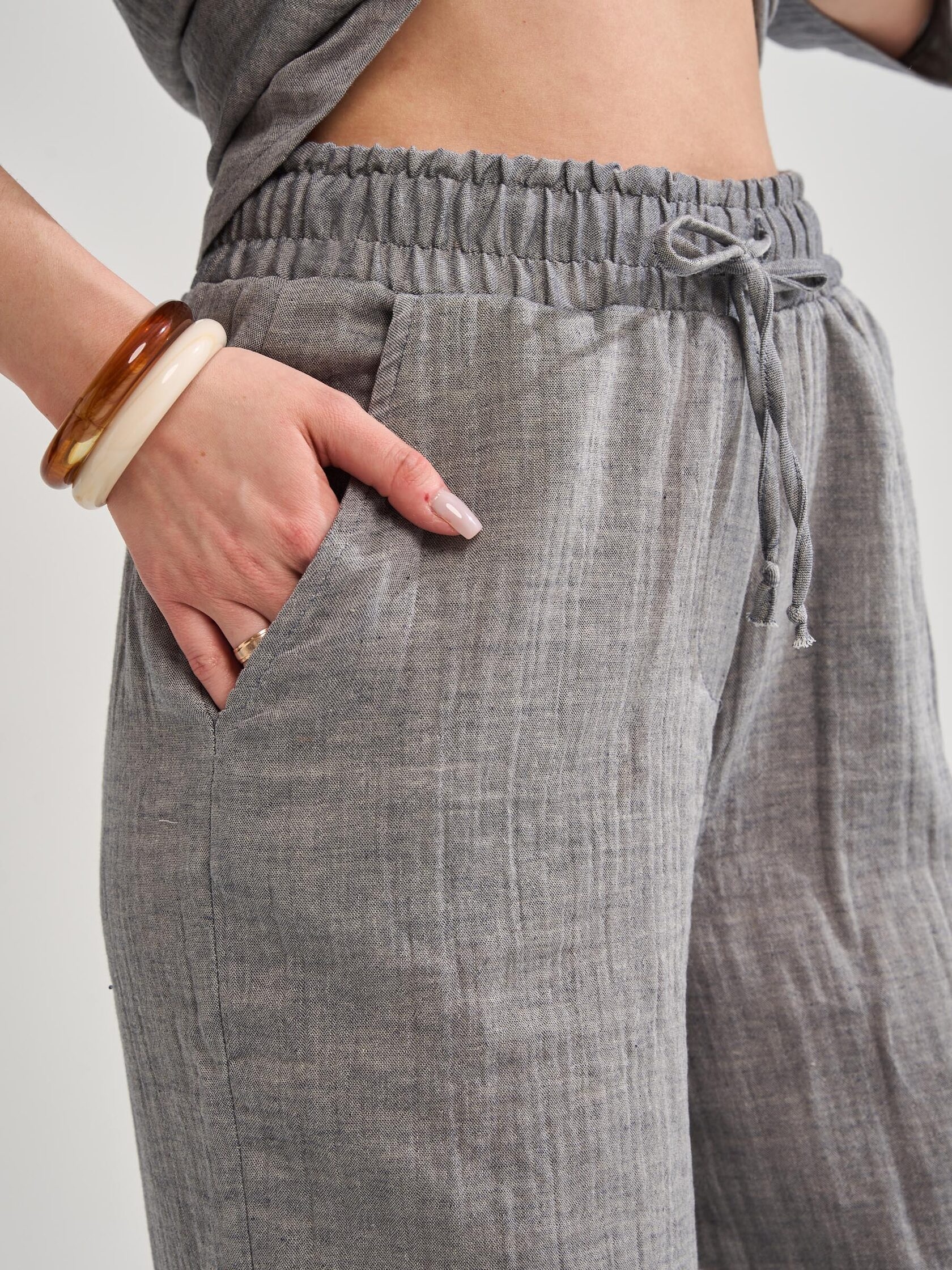 Женский костюм с брюками из муслина — лёгкий и комфортный комплект, подходящий для лета, дома, отдыха или офиса. Муслин — это 100% хлопок, который хорошо пропускает воздух, не вызывает аллергии и сохраняет форму после стирок.