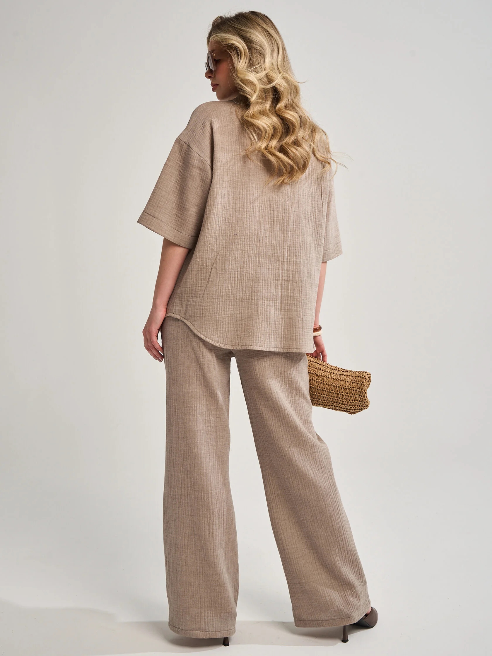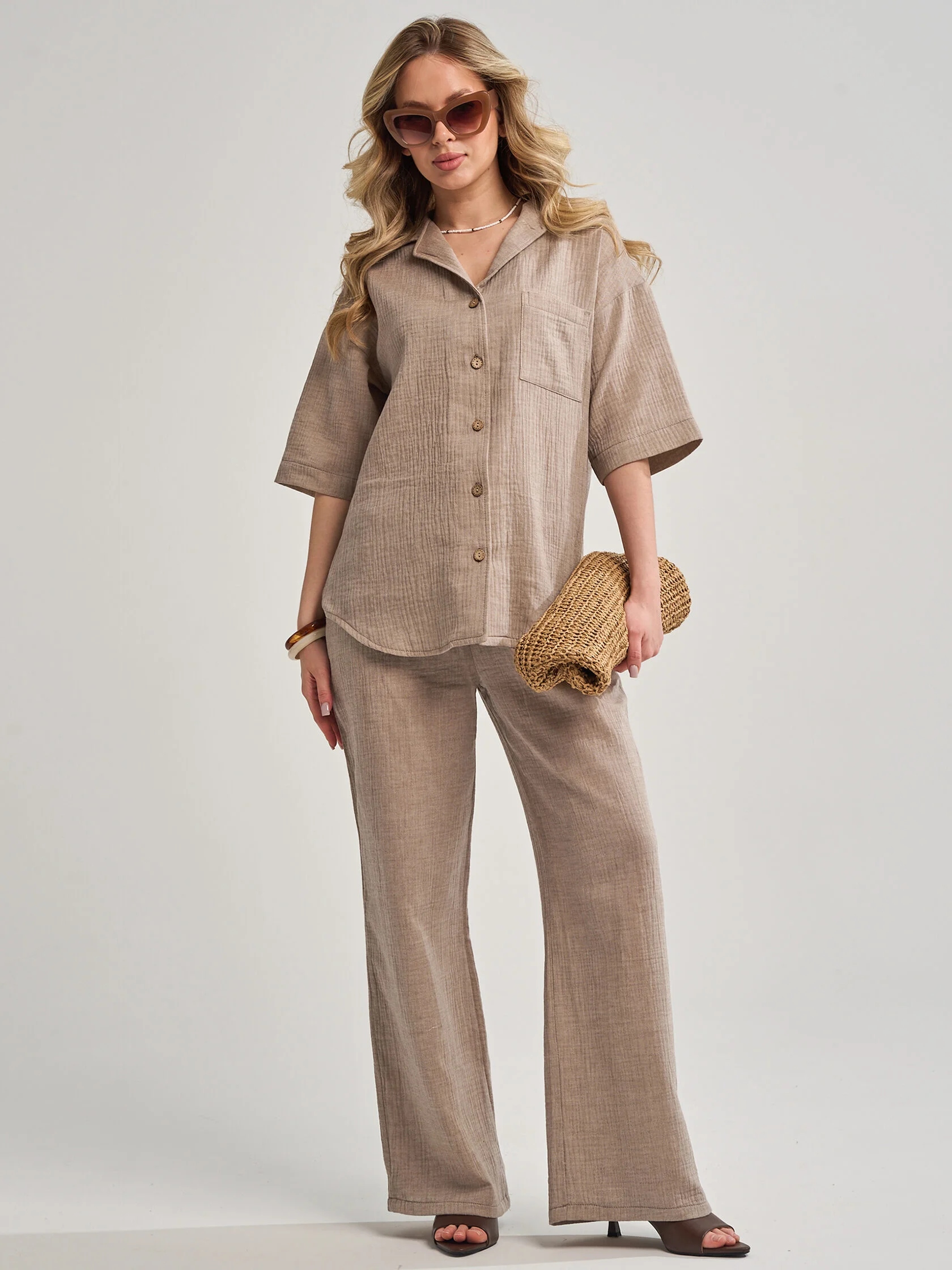 Женский костюм с брюками из муслина — лёгкий и комфортный комплект, подходящий для лета, дома, отдыха или офиса. Муслин — это 100% хлопок, который хорошо пропускает воздух, не вызывает аллергии и сохраняет форму после стирок.