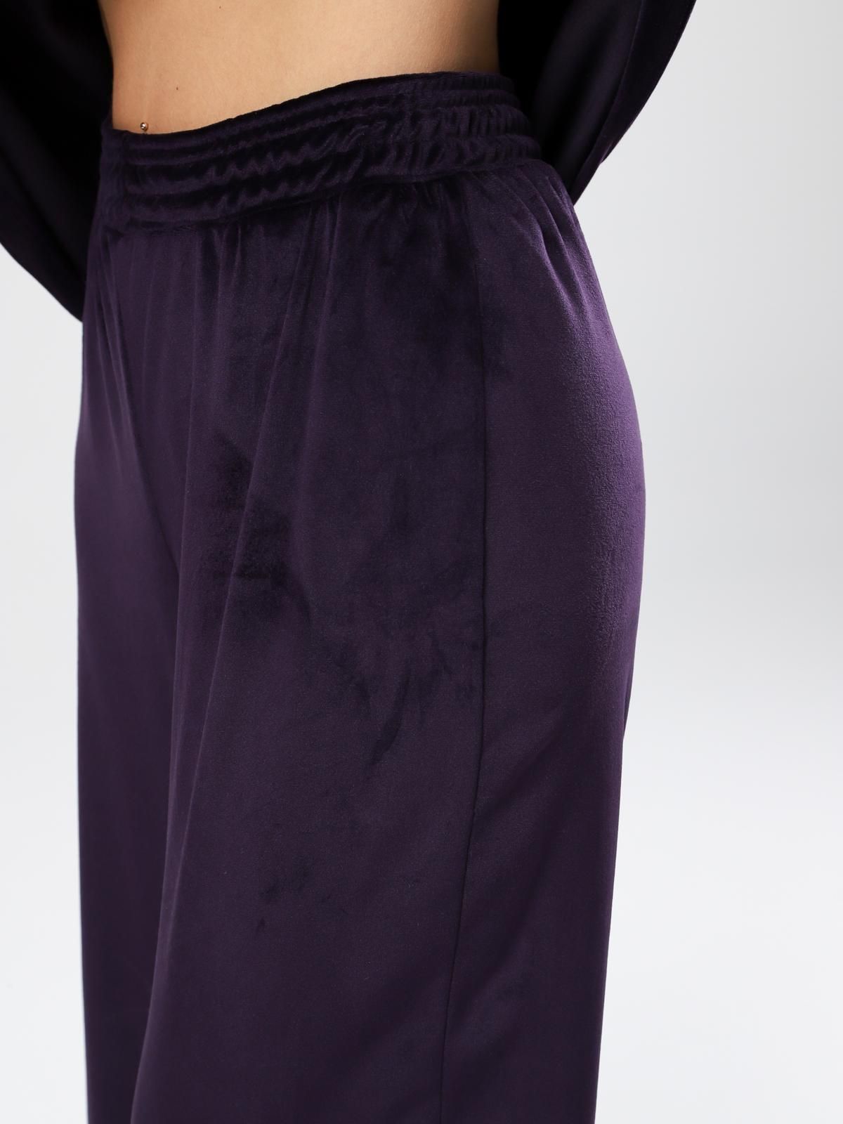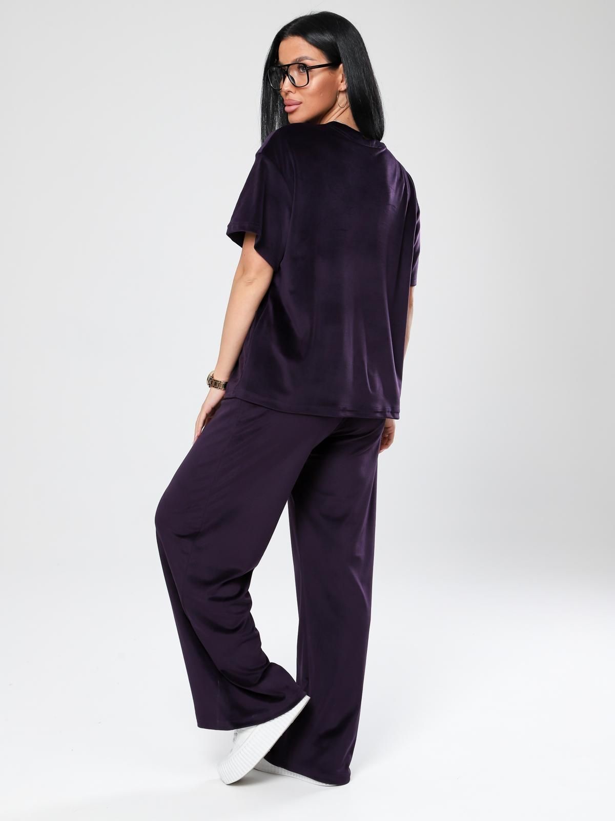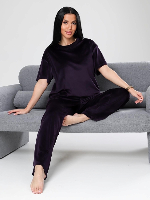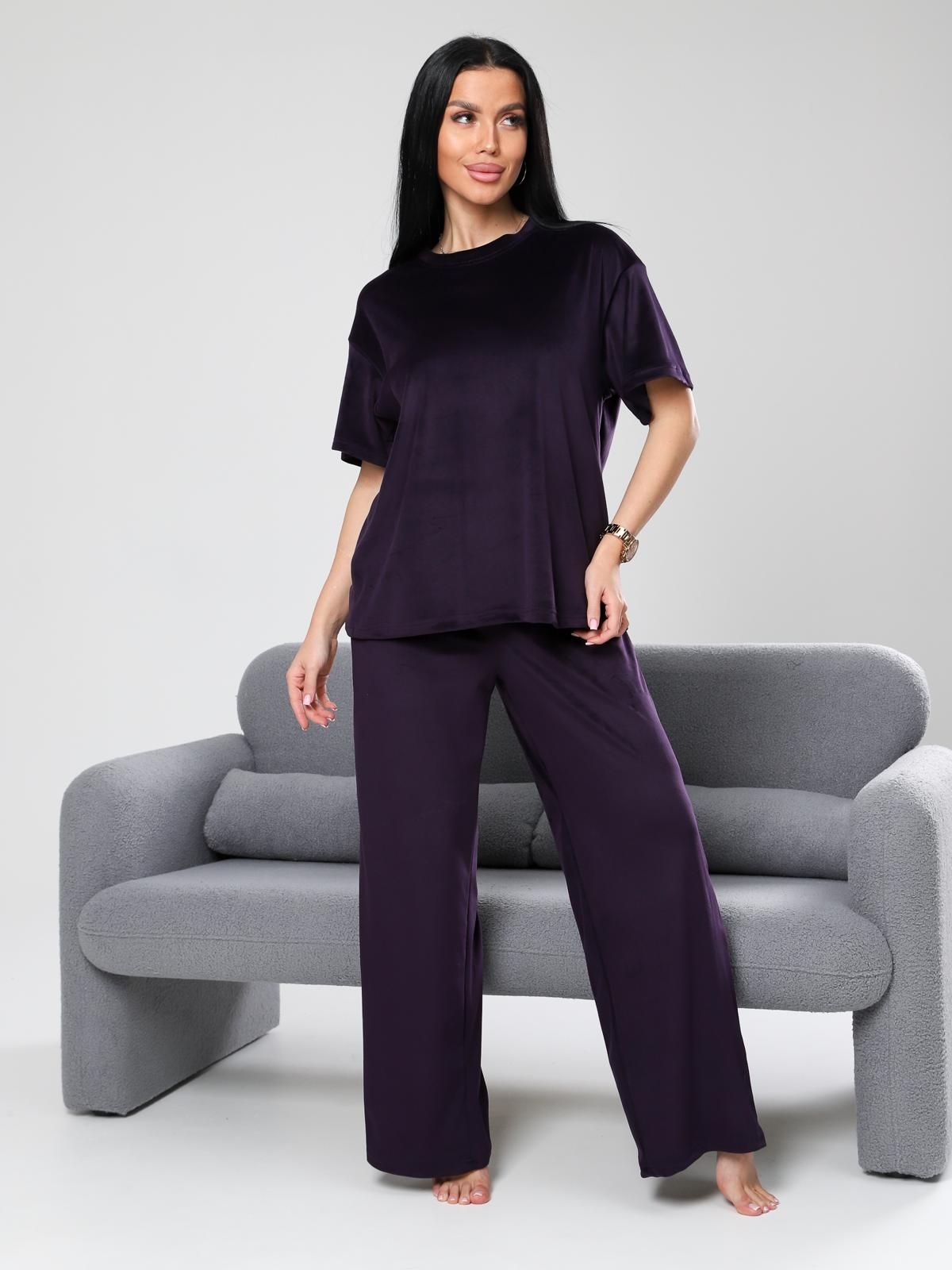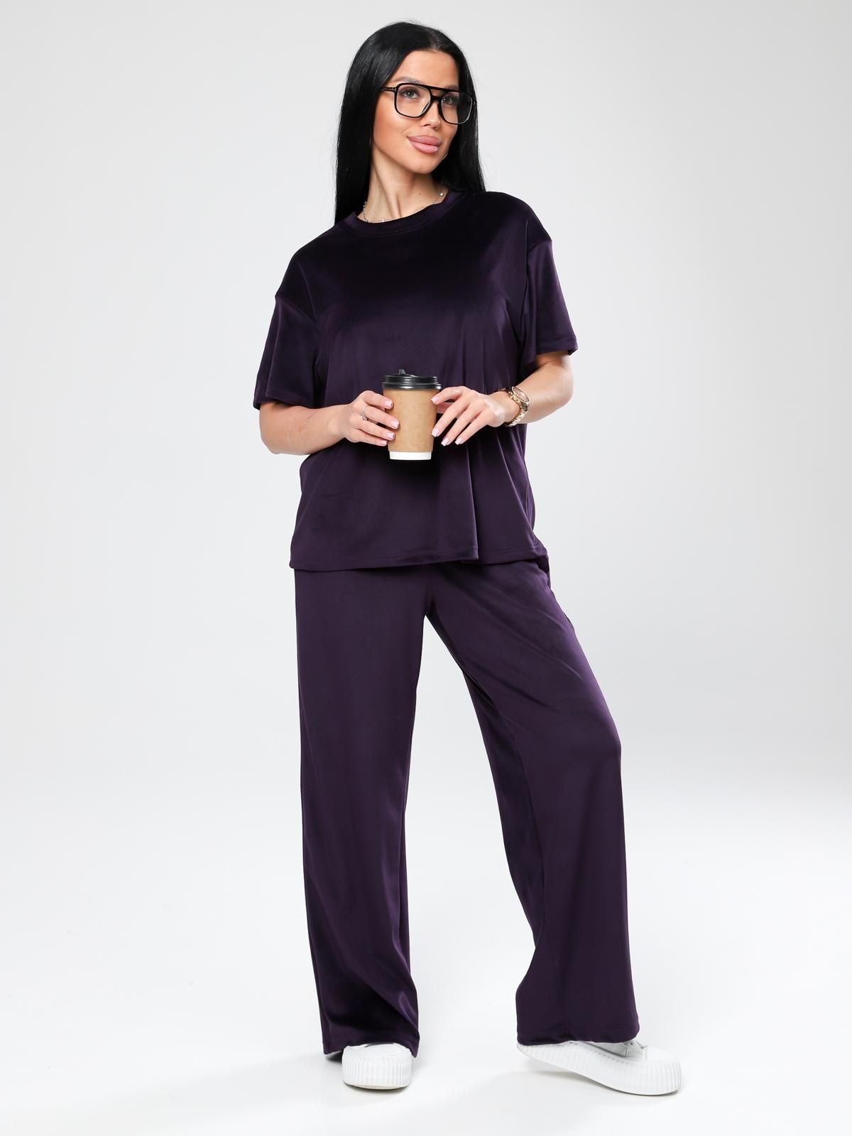 Женский велюровый костюм, состоящий из свободного свитшота и брюк прямого кроя. Костюм выполнен из мягкого велюра, что делает его комфортным для повседневной носки, прогулок или домашнего отдыха.