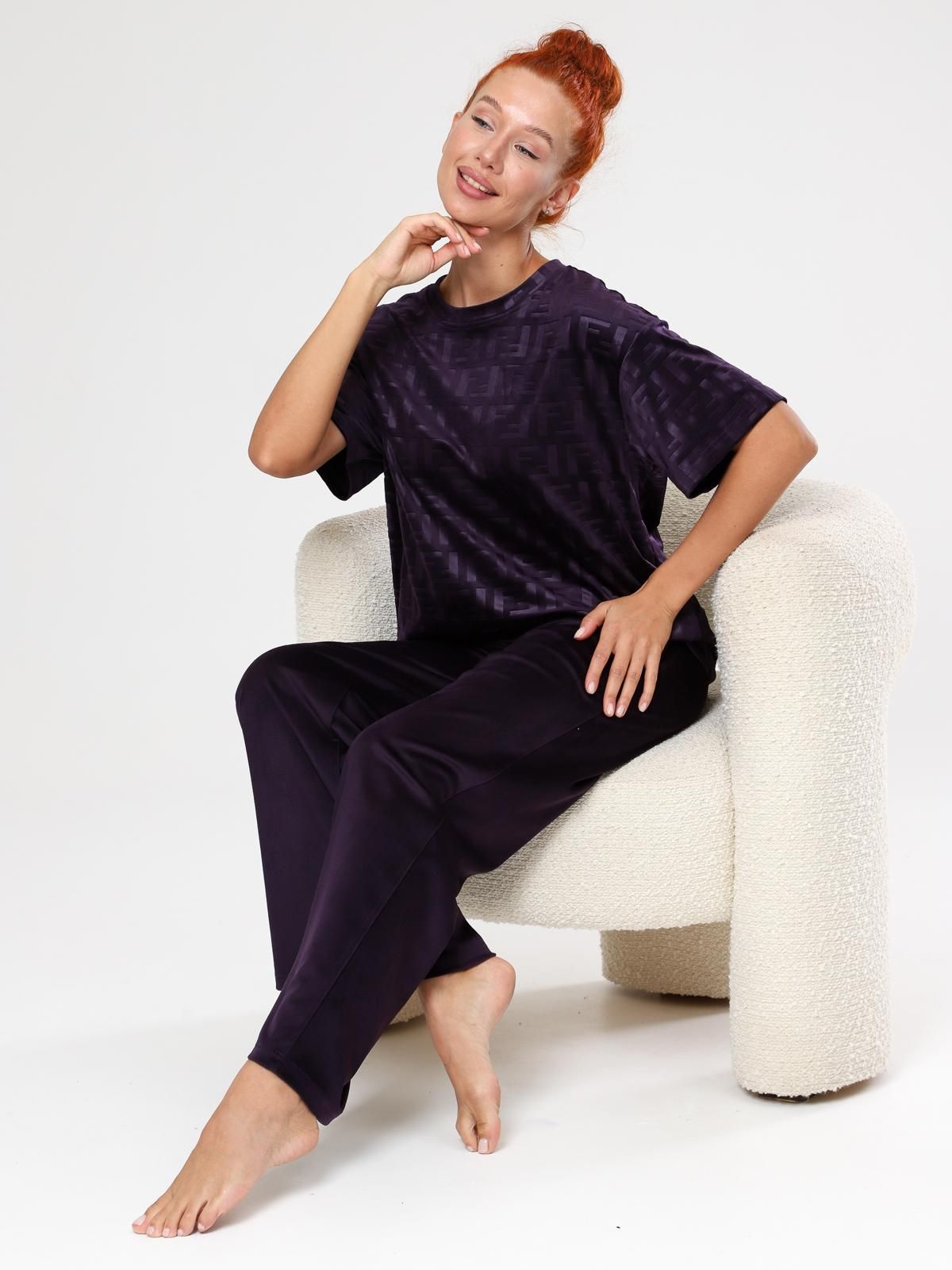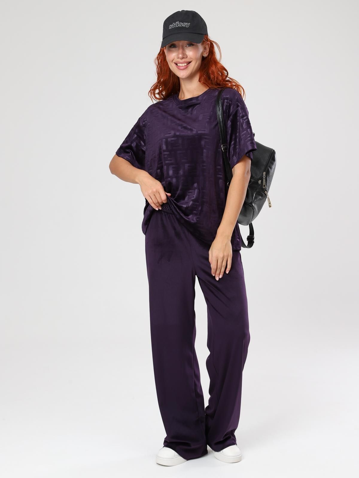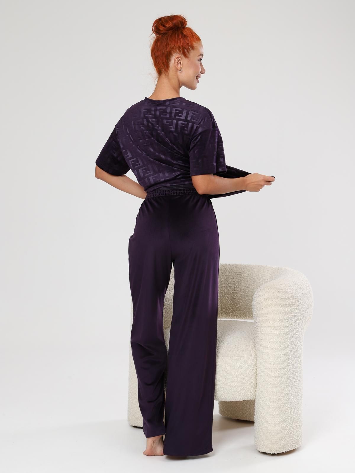 Женский велюровый костюм, состоящий из свободного свитшота и брюк прямого кроя. Костюм выполнен из мягкого велюра, что делает его комфортным для повседневной носки, прогулок или домашнего отдыха.
