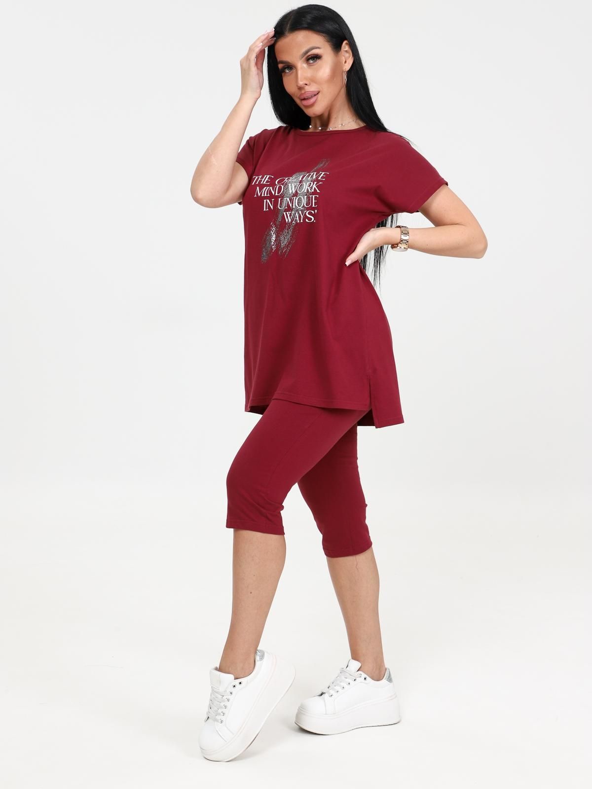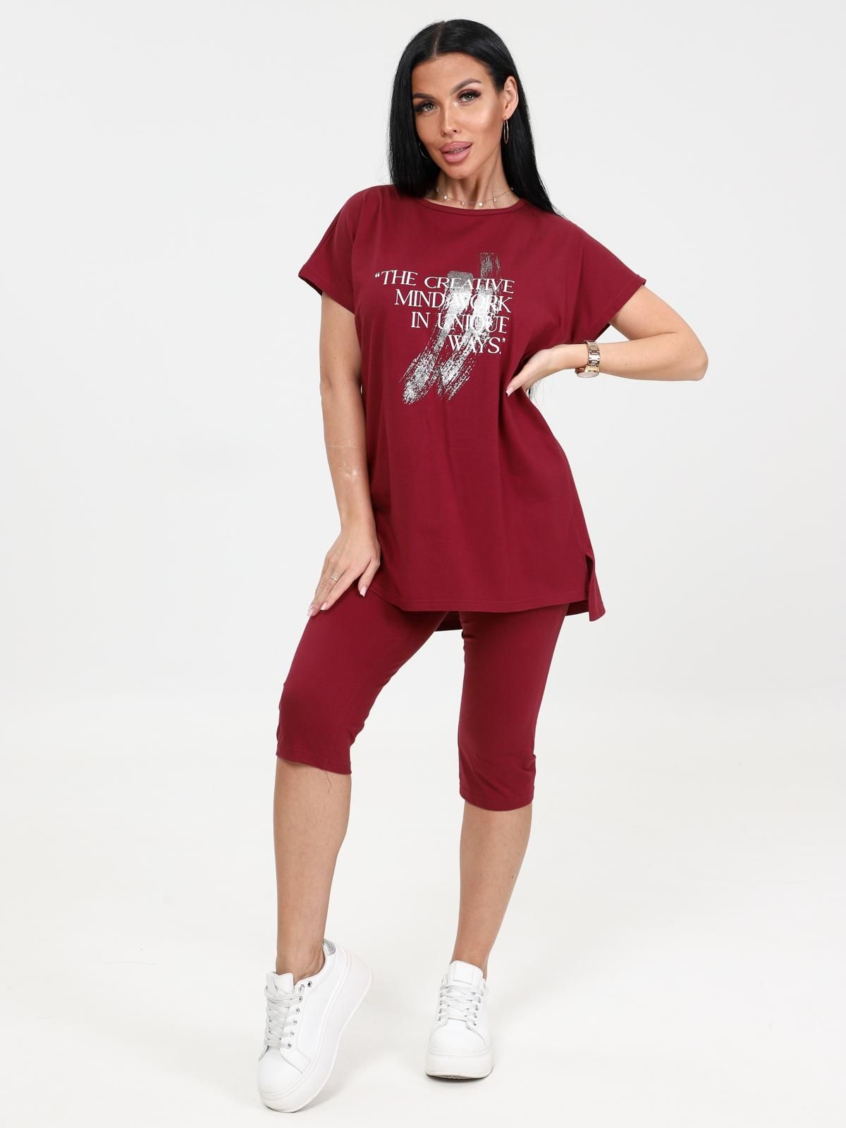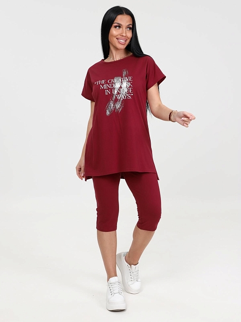 Костюм «Эпюр» — это стильный и удобный комплект, состоящий из футболки и бриджей. Он выполнен из качественного материала, который обеспечивает комфорт и долговечность. Футболка имеет свободный крой и украшена надписью «The creative mind works in unique ways», что добавляет образу оригинальности. Бриджи укороченные, что делает комплект идеальным для теплого времени года.
