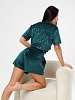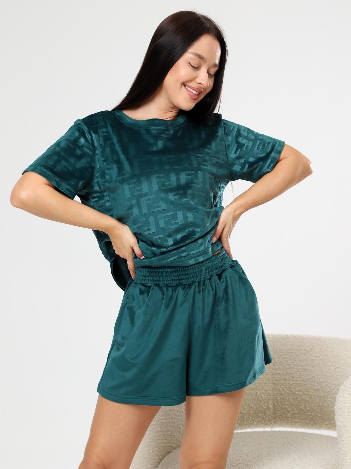 Велюровый женский комплект домашней одежды (пижама), состоящий из футболки и шорт.