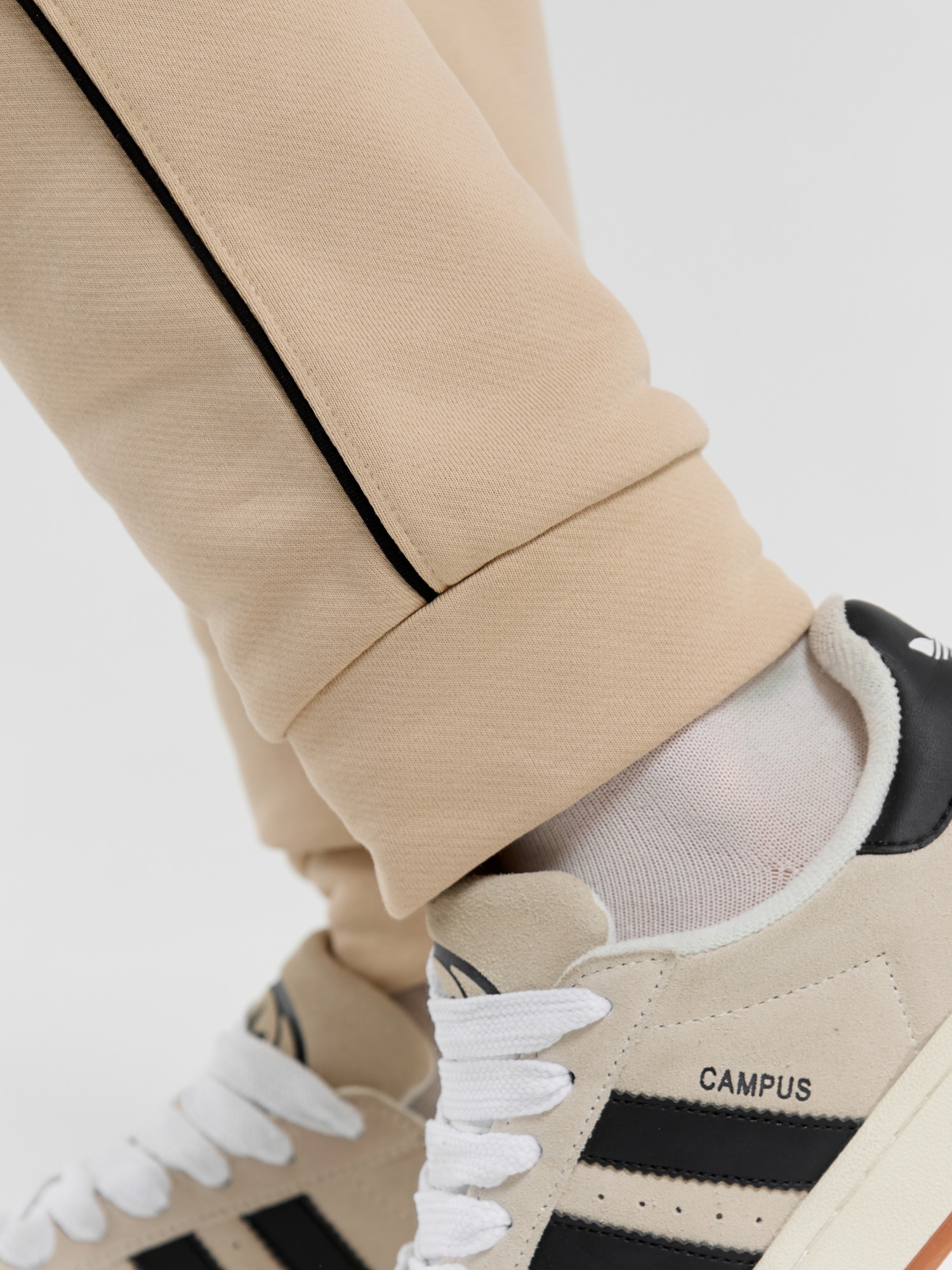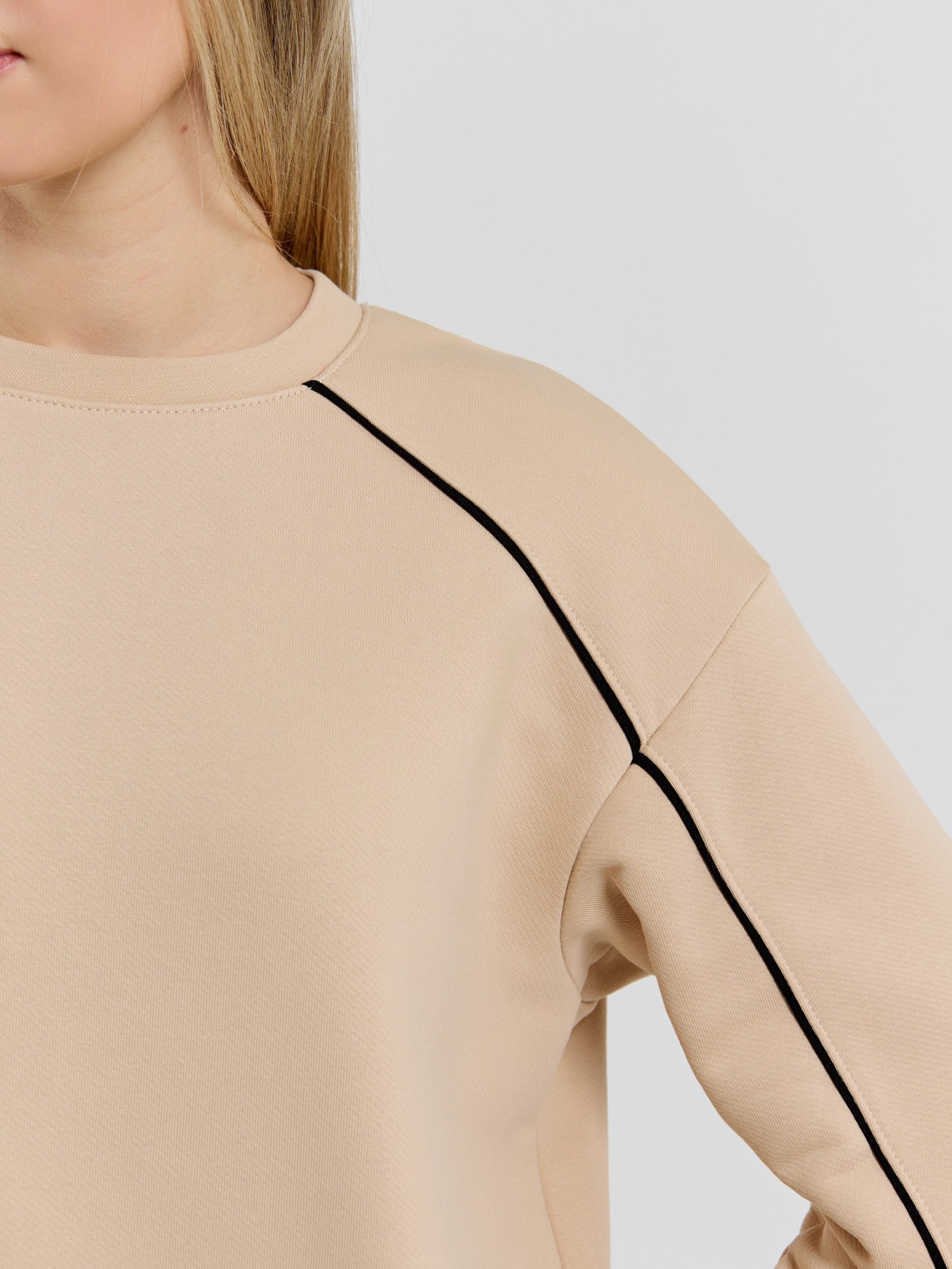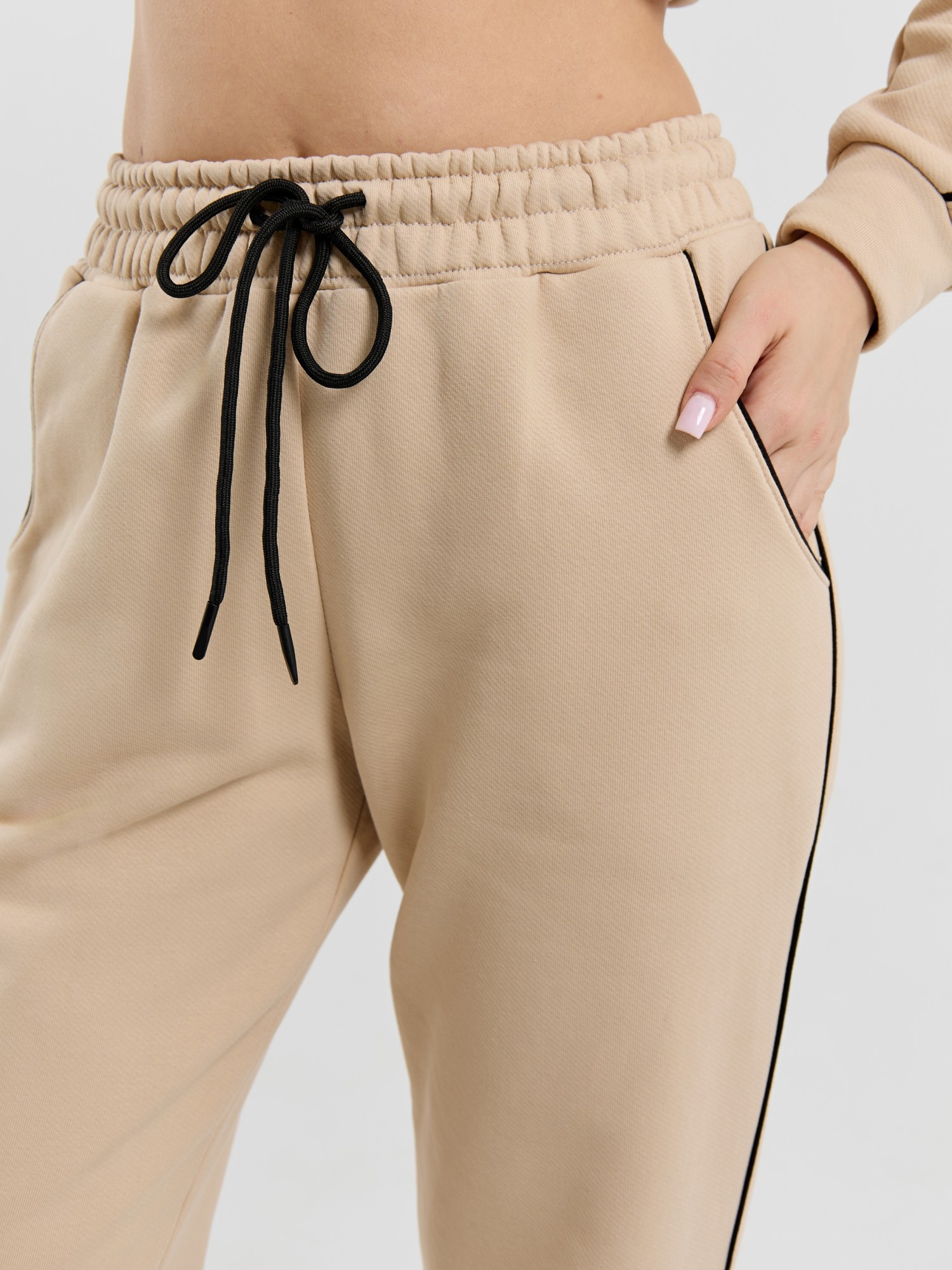 Костюм молодежный из трикотажного полотна «футер 3-х нитка диагональ» состоящий из джемпера и брюк. Джемпер – прямого силуэта, с длинными втачными рукавами, обработанными манжетами, горловиной овальной формы с втачной планкой и притачным поясом по низу изделия. Полочка и рукава состоят из двух деталей в шве соединения, которых, вставлен кант контрастного цвета, переходящий с полочки на рукава и образующий единую линию. Брюки – полуприлегающего силуэта, на притачном поясе с эластичной тесьмой внутри и шнурком, продетым через две петли в центре пояса. Боковые швы брюк, входы в карман- с кантом контрастного цвета в швах соединения. Нижние срезы брюк обработаны манжетами.