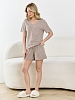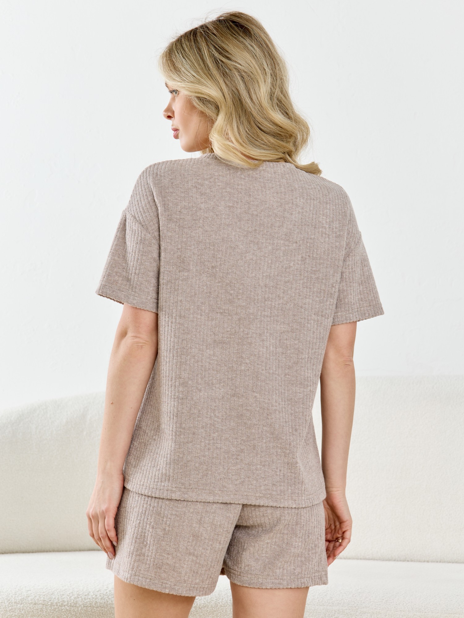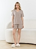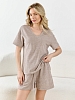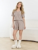 Костюм молодежный из гладкокрашеного трикотажного махрового полотна, состоящий из футболки и шорт. Футболка – классического покроя, с короткими втачными рукавами и V-образной горловиной, обработанной втачной планкой. Шорты - средней длины, свободные, на притачном поясе с эластичной тесьмой внутри и шнурком, продетым через две петли в центре пояса.