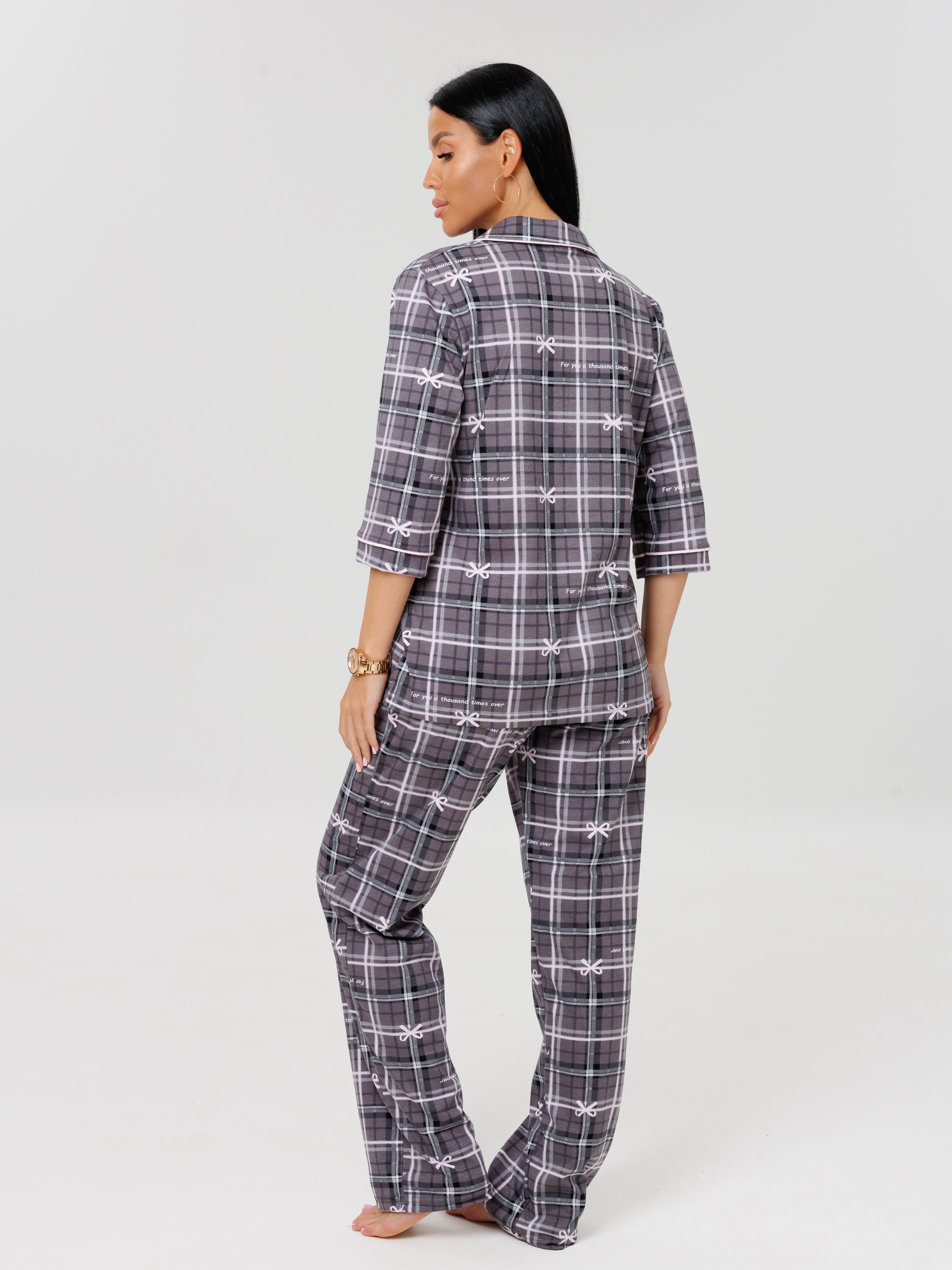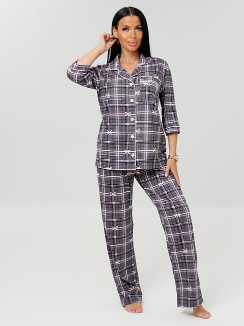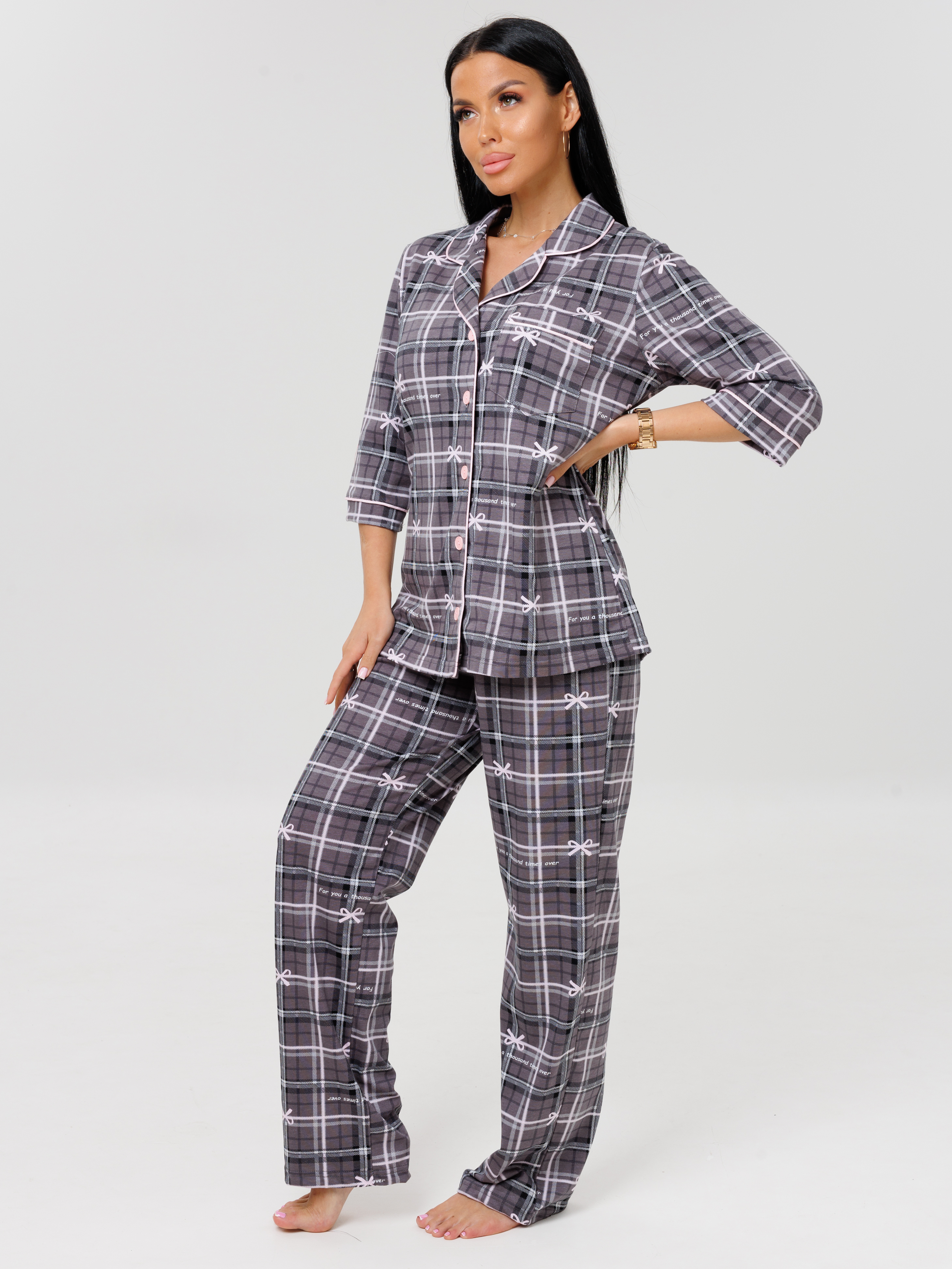 Женский костюм К-132(К) из кулирки, 100% хлопок. Женская пижама состоит из рубашки на пуговицах, с рукавами 3/4 и пижамных брюк.