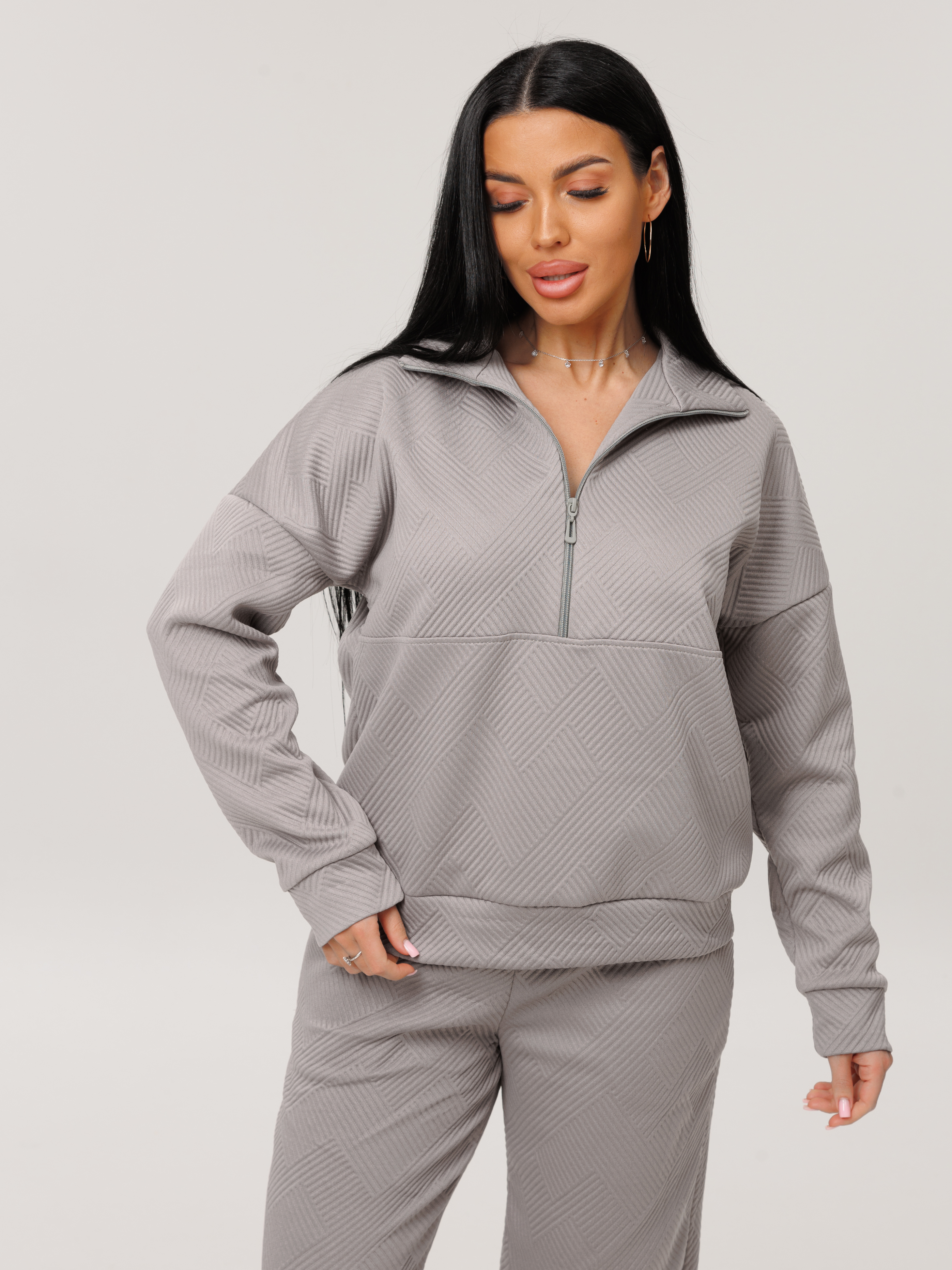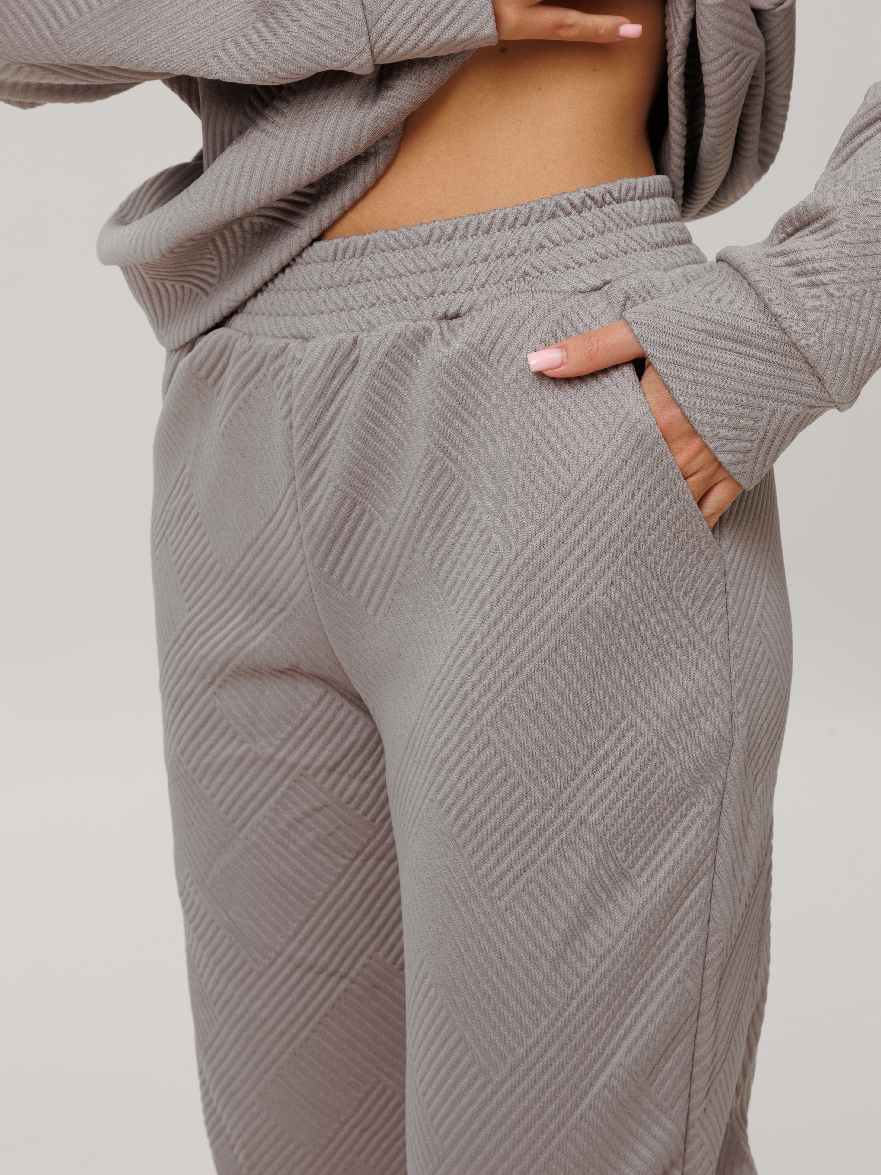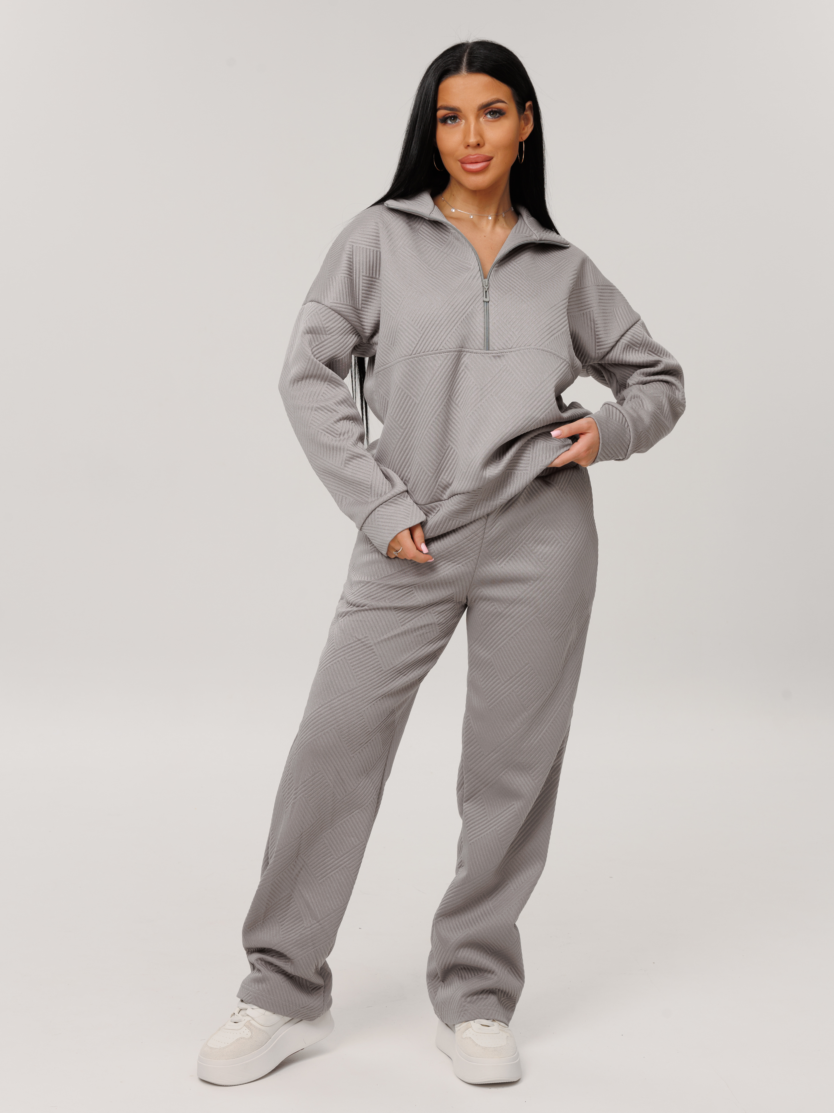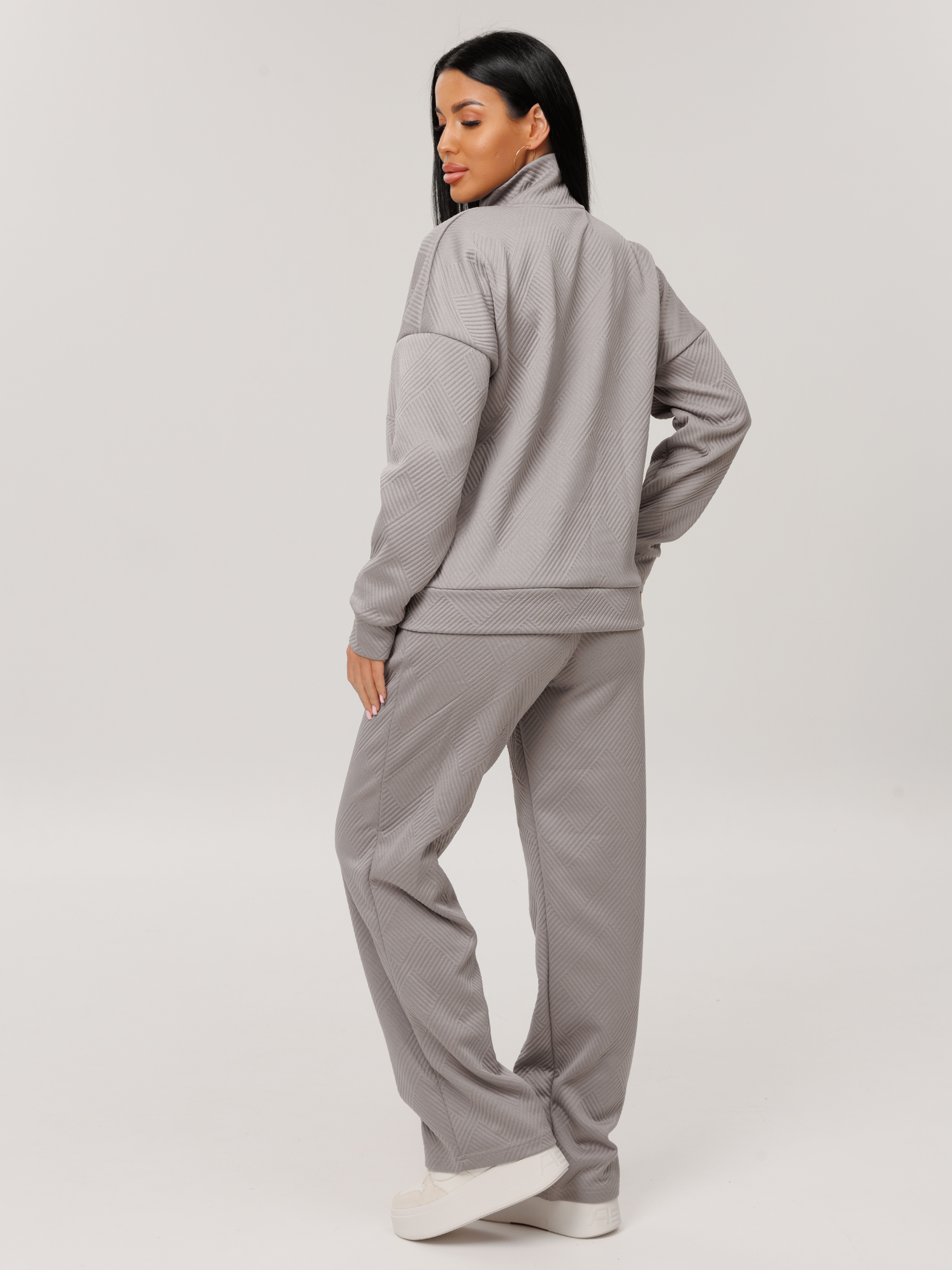 Женский костюм с брюками из жаккарда — это комплект одежды, состоящий из толстовки и брюк, изготовленный из жаккардовой ткани. Жаккард — высокотехнологичный материал с рельефным узором, который отличается прочностью, эластичностью и воздухопроницаемостью. Он не мнётся, не деформируется и сохраняет форму после стирки.