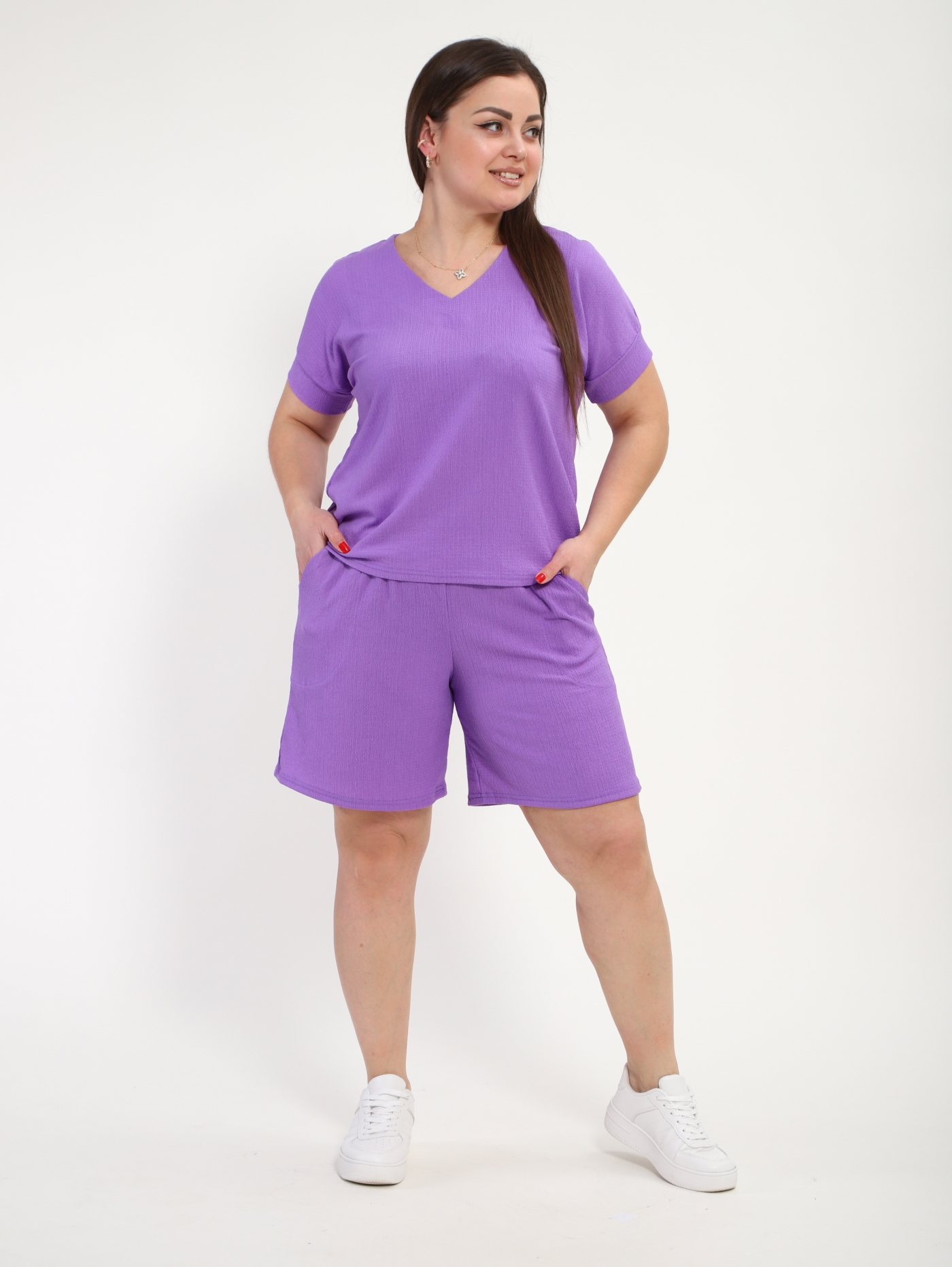 Женский костюм с шортами из жатки — это лёгкий и комфортный комплект, состоящий из шорт и футболки или рубашки, выполненный из ткани с рельефной текстурой («мятой» структурой). Жатка хорошо тянется, не мнётся, быстро сохнет и подходит для повседневной носки, отдыха или прогулок.