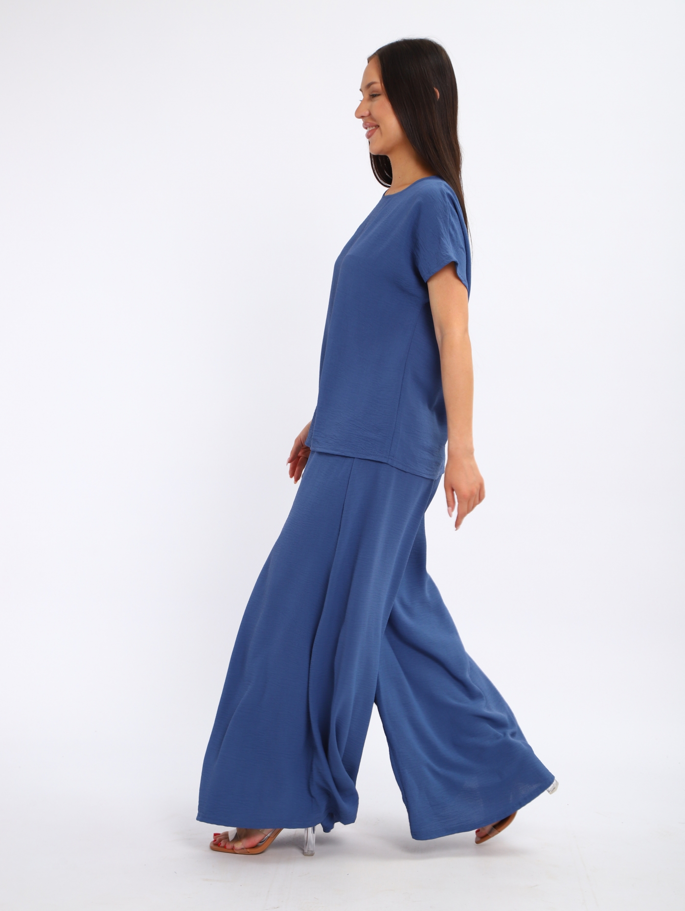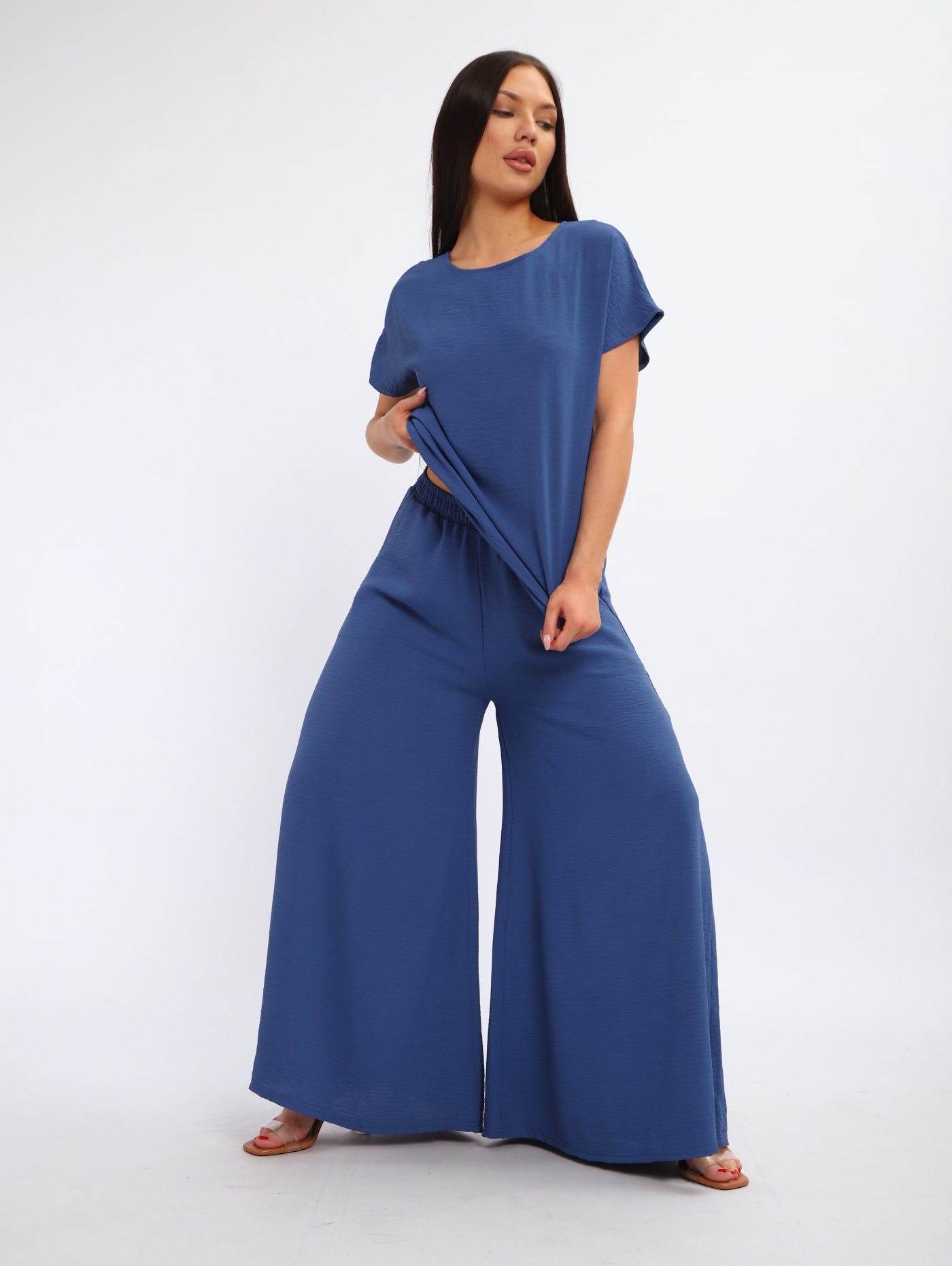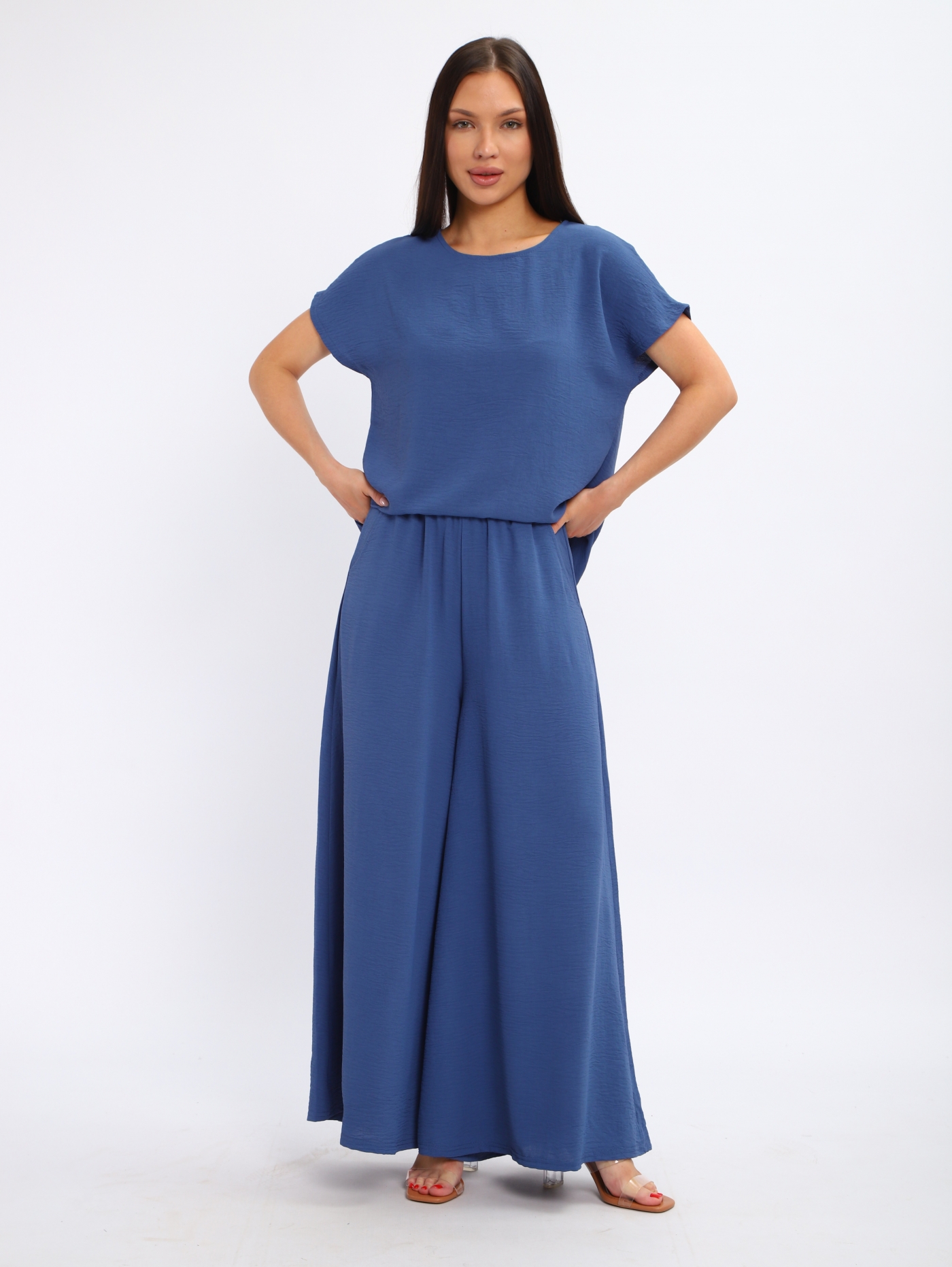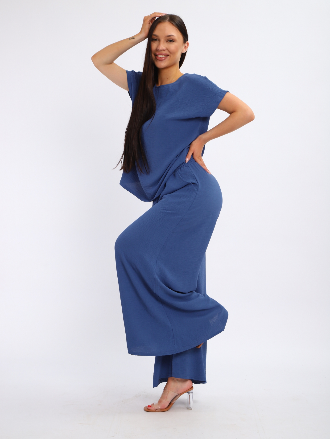 Женский костюм со свободными брюками из жатки — это комплект, сочетающий комфорт и стиль. Жатка — это ткань с рельефной поверхностью, которая не мнётся, хорошо драпируется и подходит для повседневной носки. Такие костюмы часто включают брюки свободного кроя и блузу или тунику.