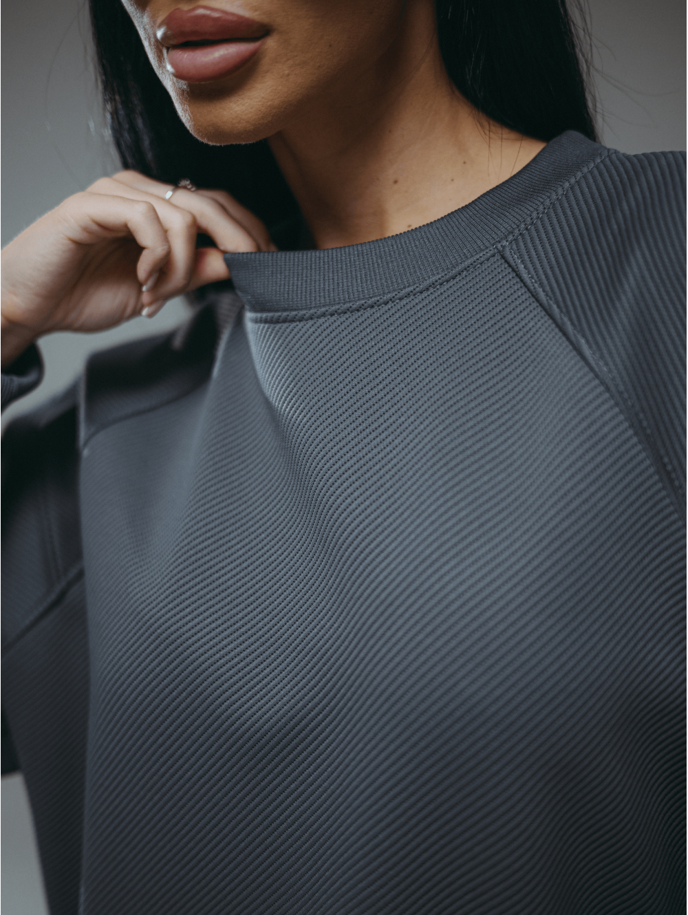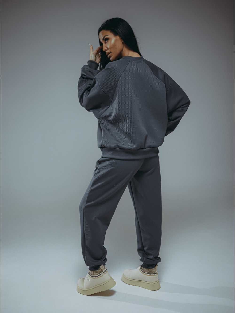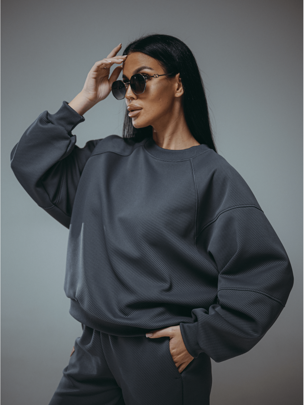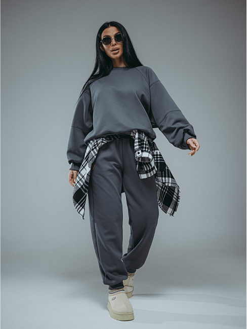 Костюм Калипсо состоит из свитшота и брюк. Свитшот прямого силуэта, с рукавом реглан со вставками. Рукав состоит из трёх частей. Низ рукавов и низ свитшота на манжете из кашкорсе. Брюки на резинке с цельнокроеным поясом. В боковых швах прорезной карман. Низ брюк обработан манжетой из кашкорсе.