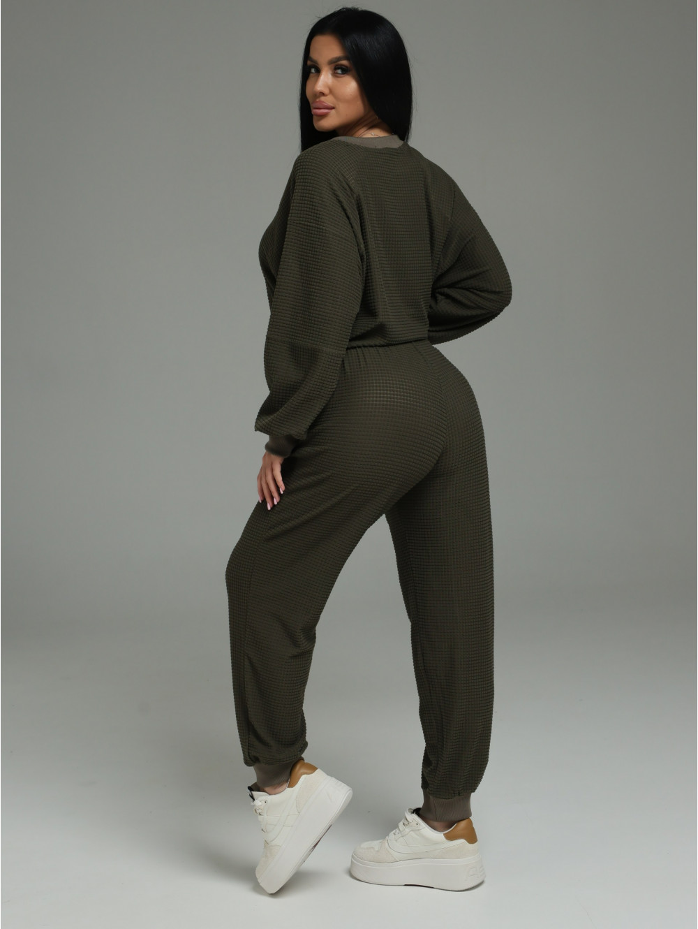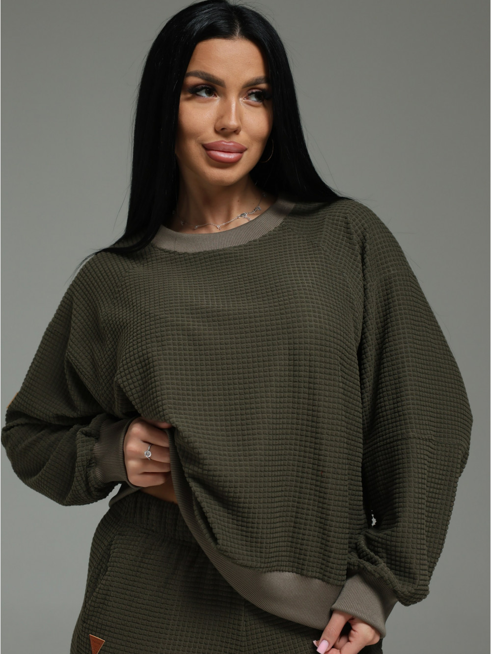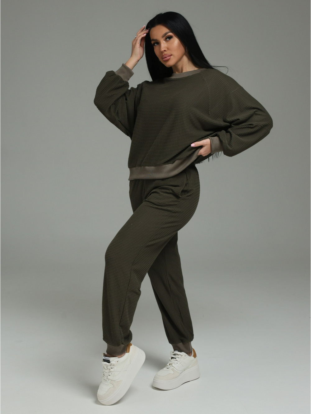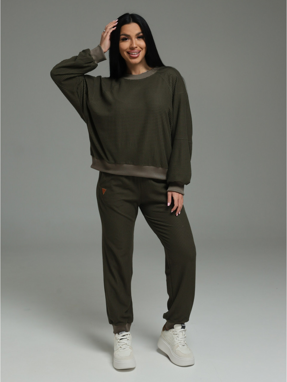 Костюм состоит из свитшота и брюк. Свитшот прямого силуэта с рукавом реглан со вставками. Рукав состоит из трёх частей.