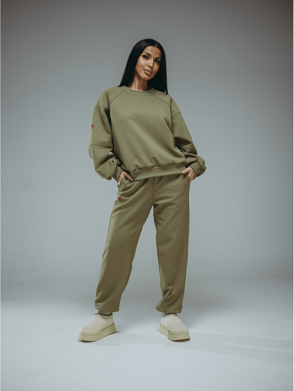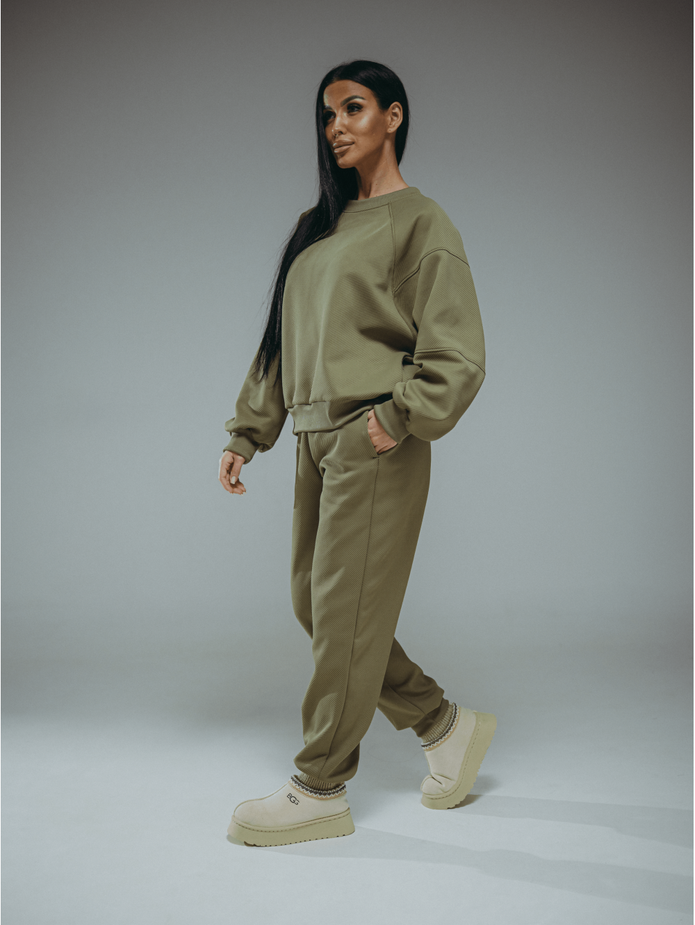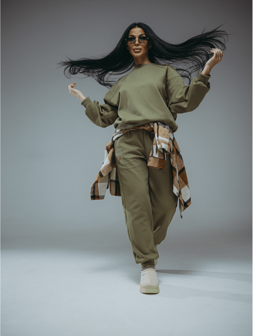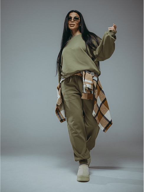 Костюм Калипсо состоит из свитшота и брюк. Свитшот прямого силуэта, с рукавом реглан со вставками. Рукав состоит из трёх частей. Низ рукавов и низ свитшота на манжете из кашкорсе. Брюки на резинке с цельнокроеным поясом. В боковых швах прорезной карман. Низ брюк обработан манжетой из кашкорсе.