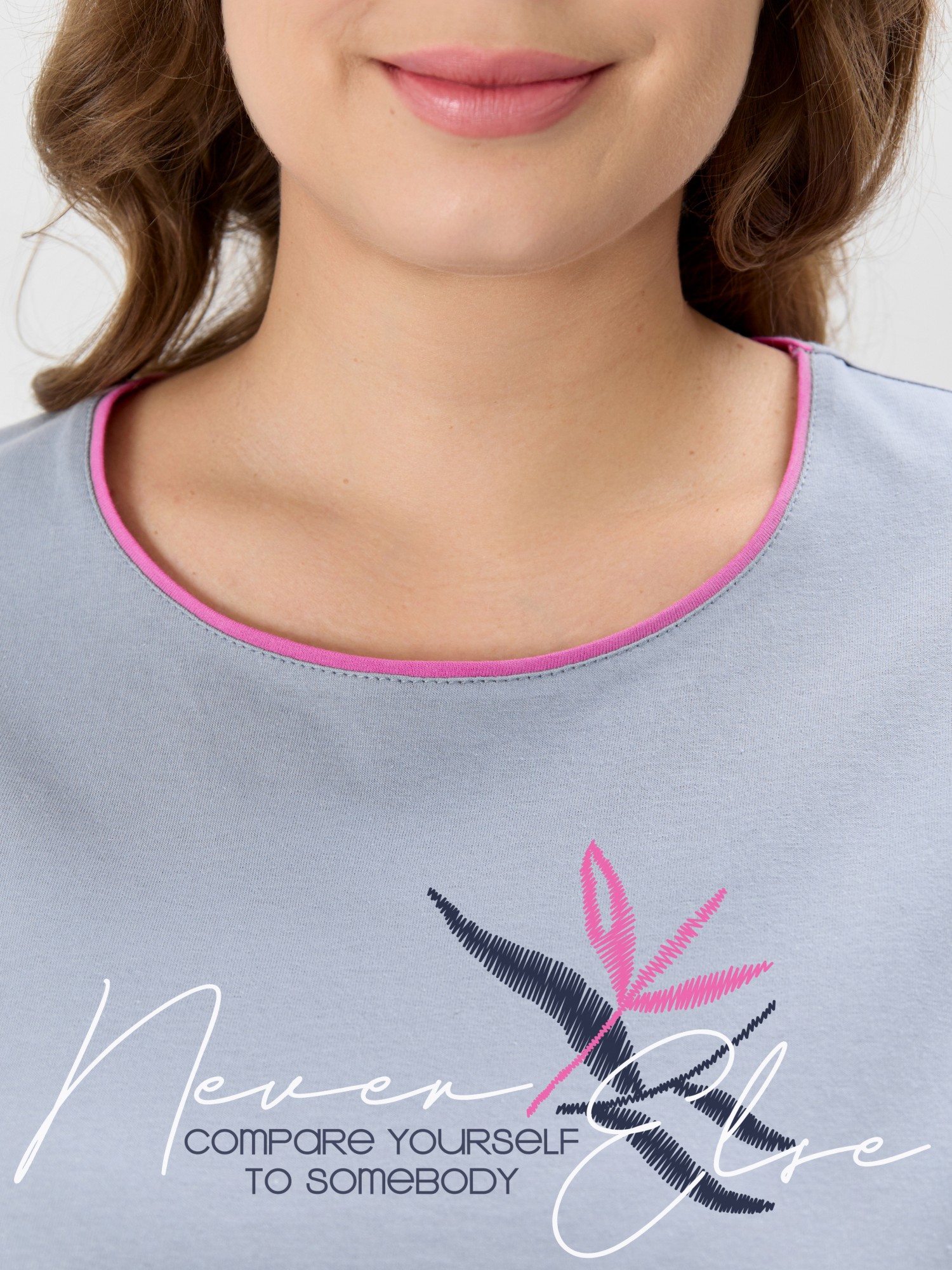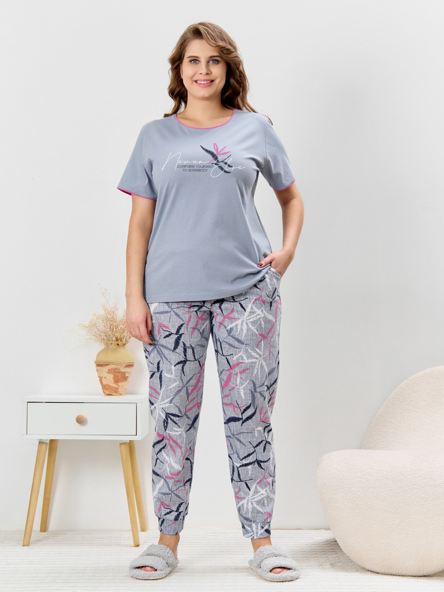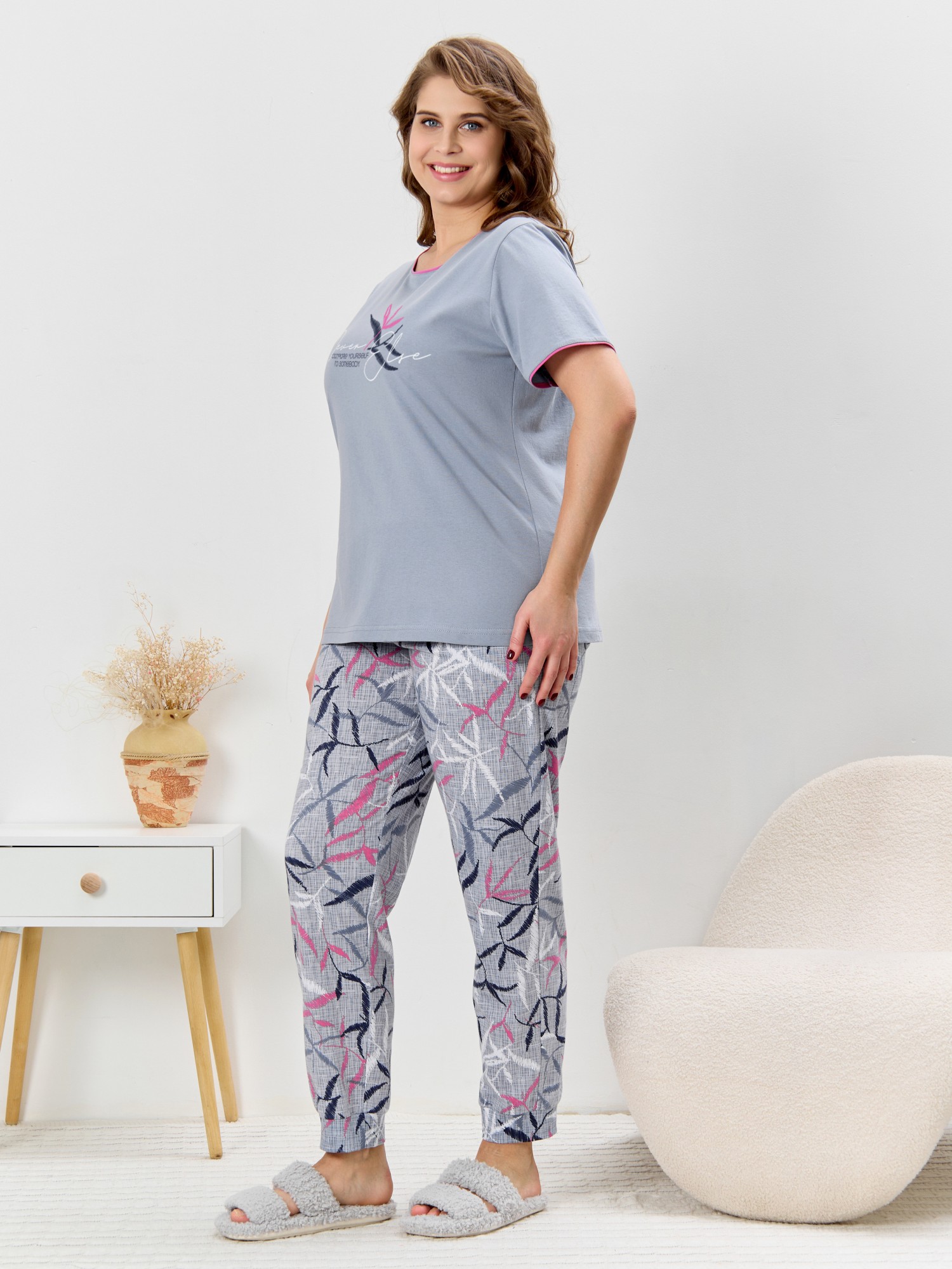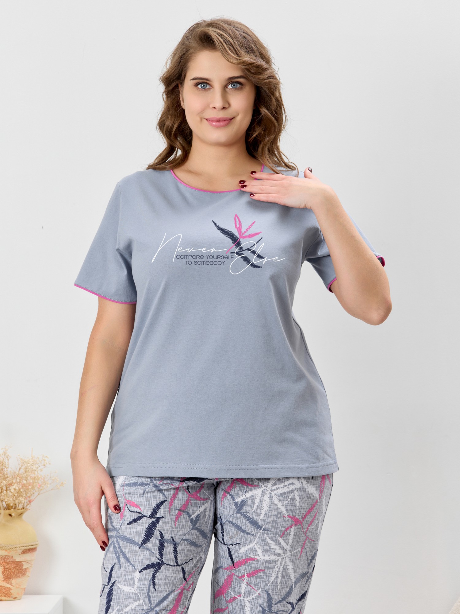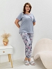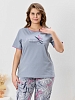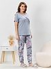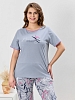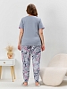 Костюм молодежный из трикотажного полотна «кулирка» в комбинации двух видов: с набивным рисунком и гладкокрашеного в единой цветовой гамме, состоящий из футболки и брюк. Футболка - из гладкокрашеного полотна, классического покроя, с короткими втачными рукавами, горловиной овальной формы и принтом на полочке, выполненным в технике «шелкографии». Горловина и низ рукавов обработаны узким притачным кантом. Брюки - из полотна с набивным рисунком, длинные, на притачном поясе с эластичной тесьмой внутри, карманами в боковых швах, притачными манжетами понизу.