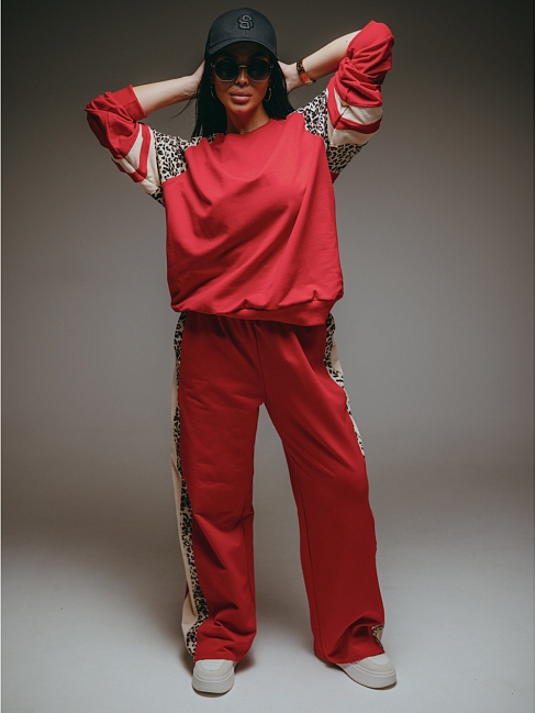 Костюм Хлоя состоит из свитшота и брюк. Свитшот прямого силуэта с рукавом реглан со вставками. Брюки на поясе с двумя боковыми прорезными карманами.