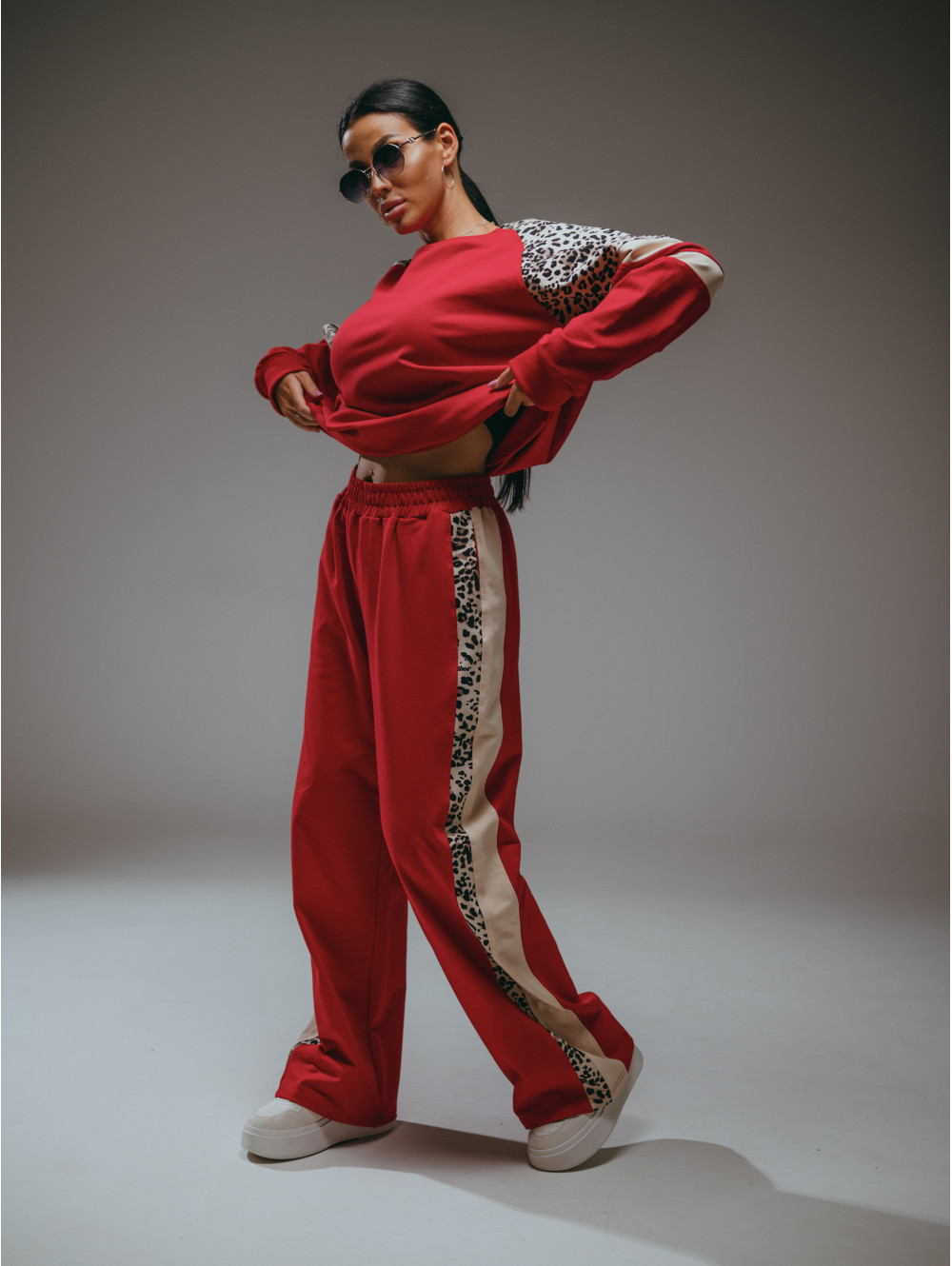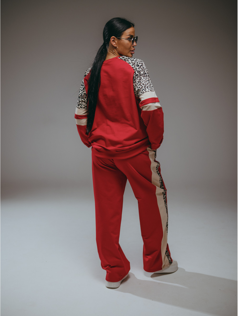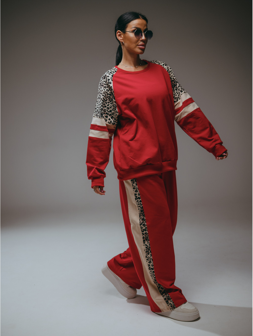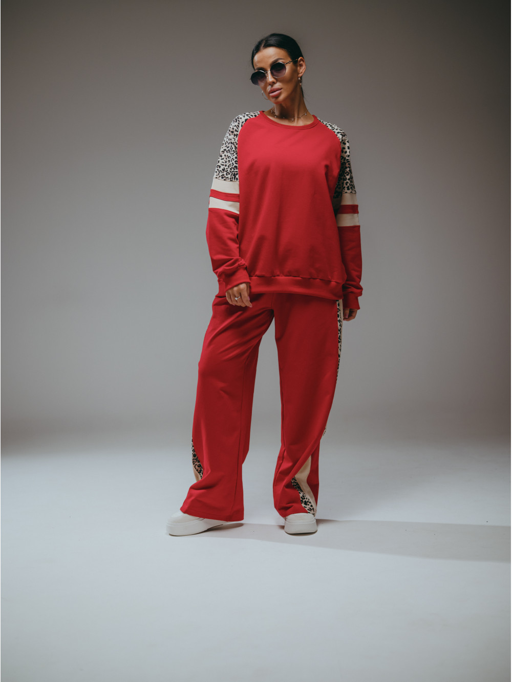 Костюм Хлоя состоит из свитшота и брюк. Свитшот прямого силуэта с рукавом реглан со вставками. Брюки на поясе с двумя боковыми прорезными карманами.